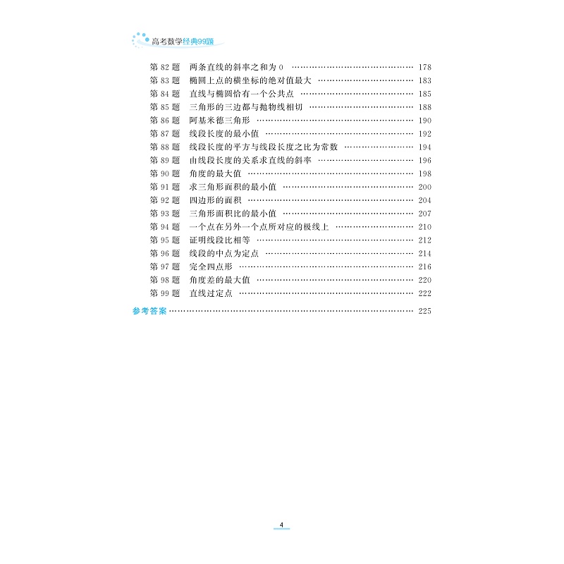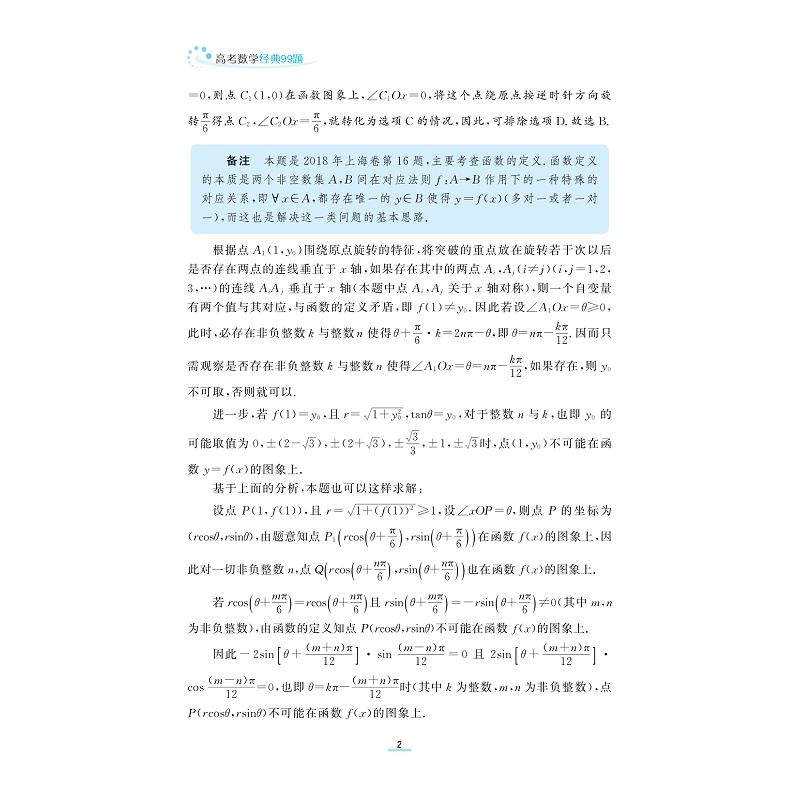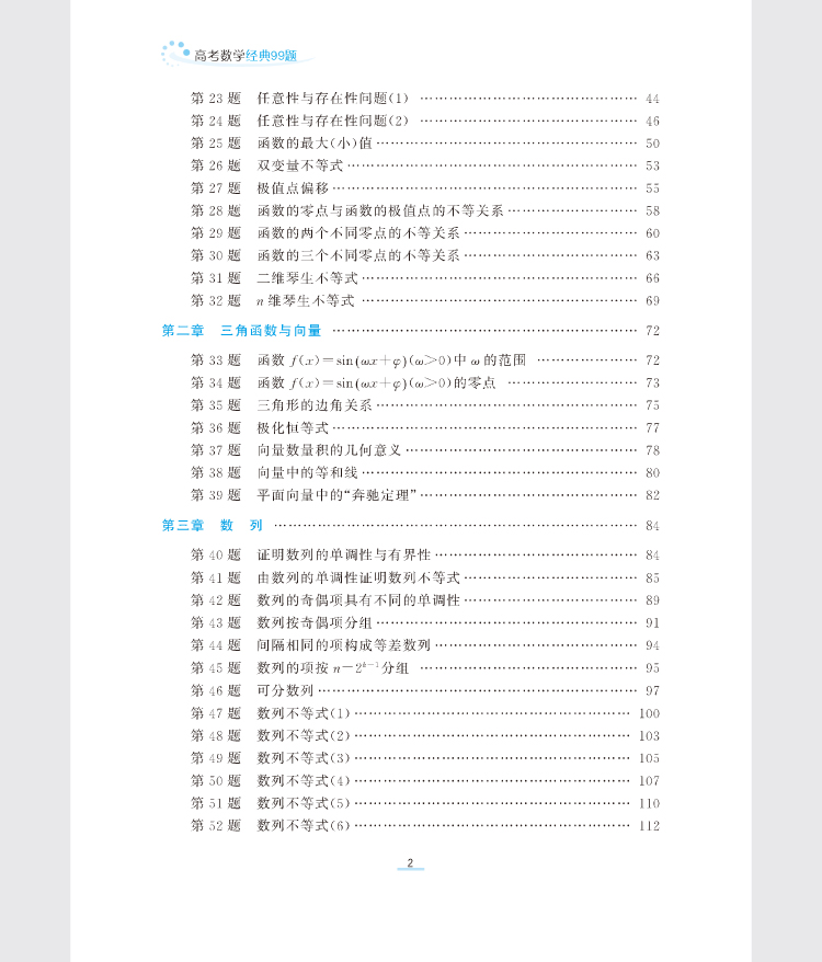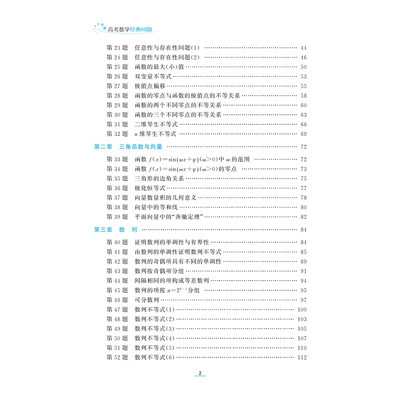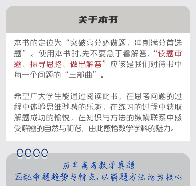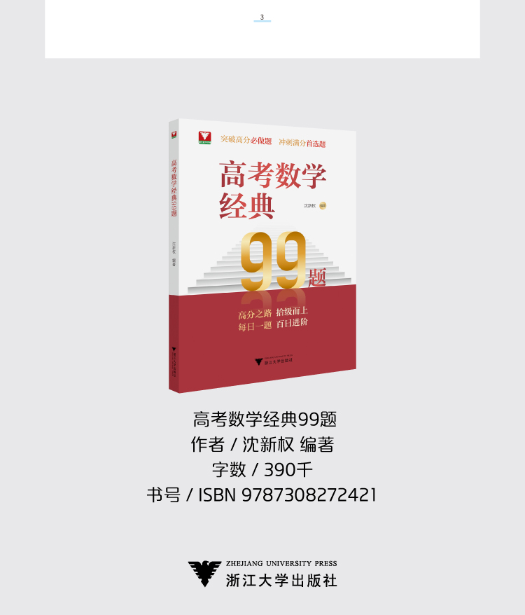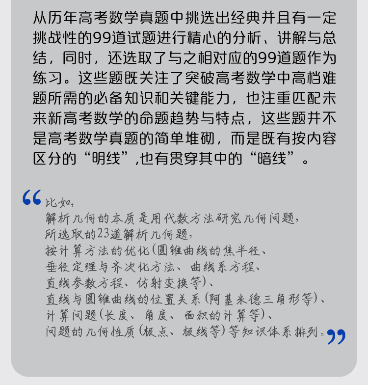 本书以高考数学中等及以上难度,又符合新高考数学命题特征的试题为写作素材,按高中数学的主干知识进行内容划分,以高中数学的方法与思想为写作主线,按六个知识模块精选高考真题99题,以这些题目作为例题(以选择、填空与解答题的压轴题为主)进行分析与原创解答,力求分析精准,解答体现问题本质,对于解答过程中学生难易理解的内容(为什么要这样解)则通过评注的形式说明,易于学生对难点的理解和消化.每个例题下面附一道同类型的高考数学真题(变式探究),每一模块后面附一份综合练习用于提升学生的学科核心素养(高考真题,主要用于巩固该模块所涉及的知识与方法).