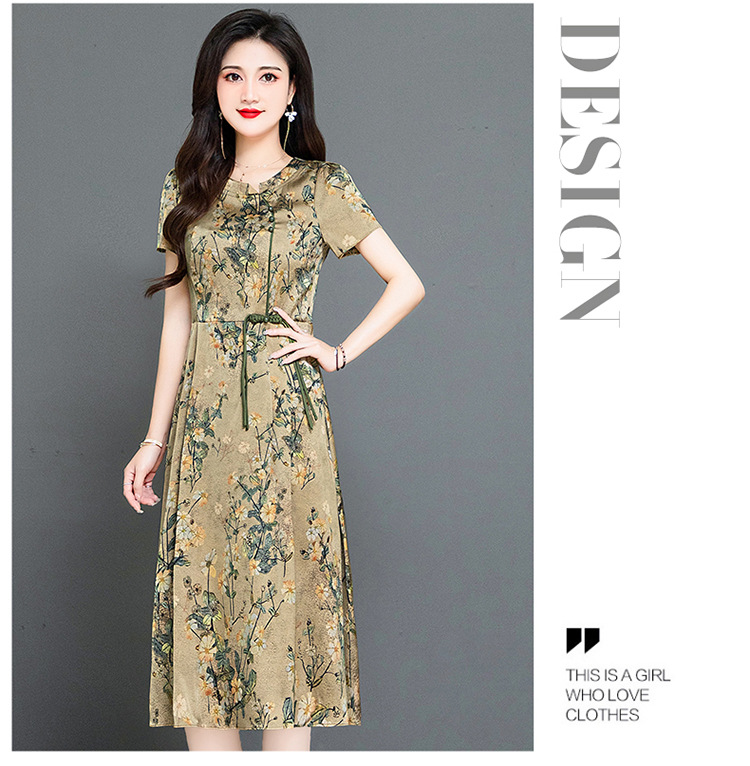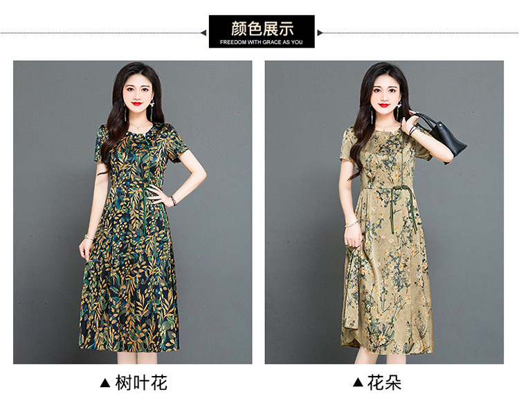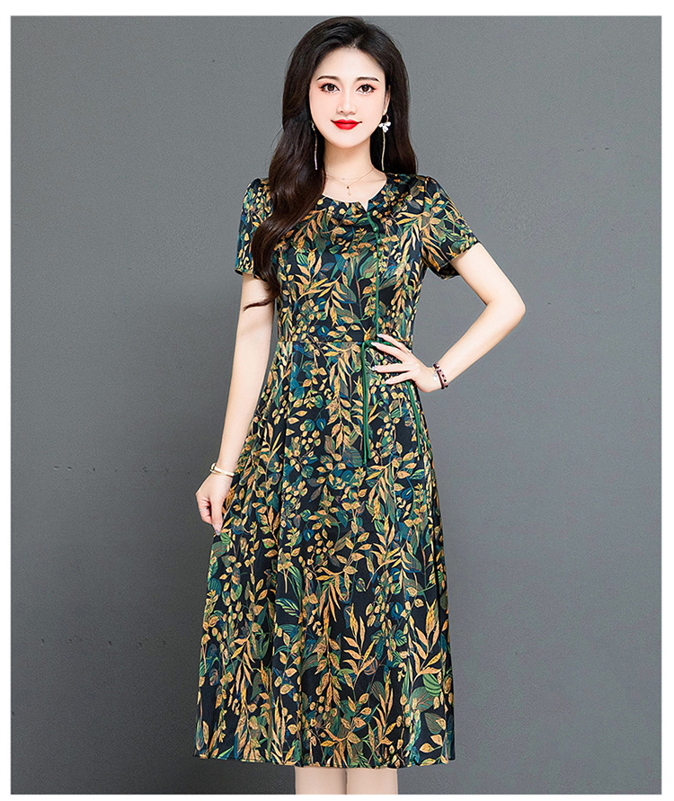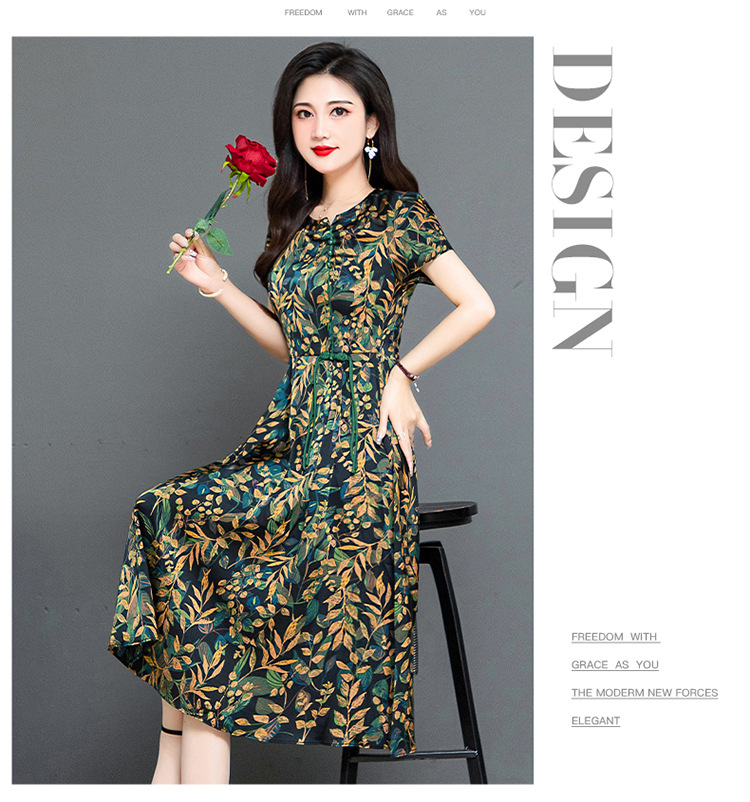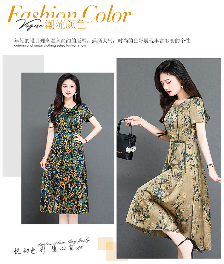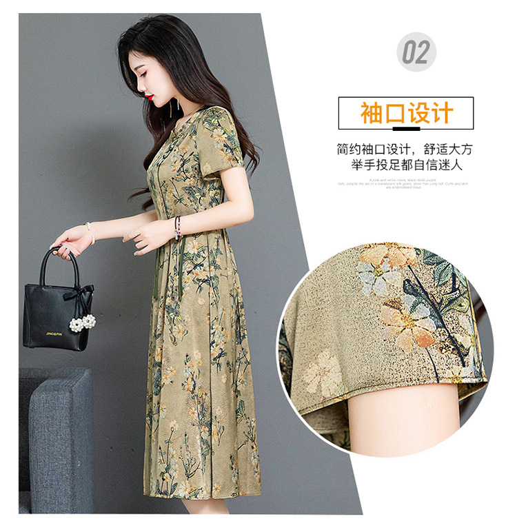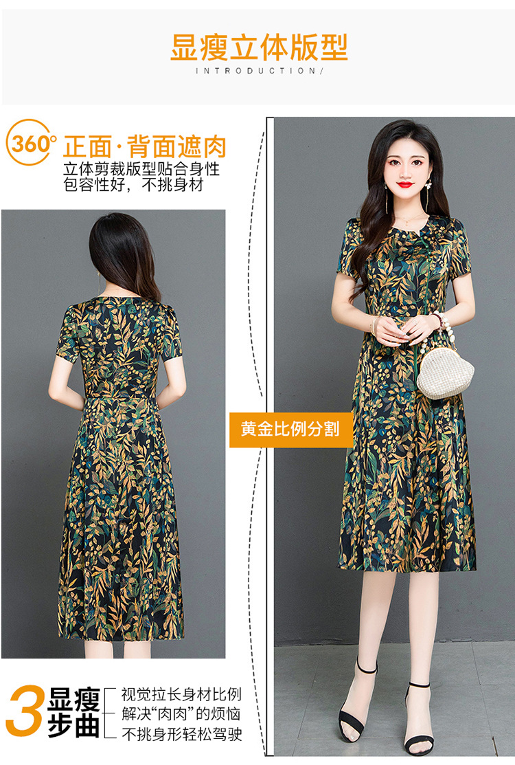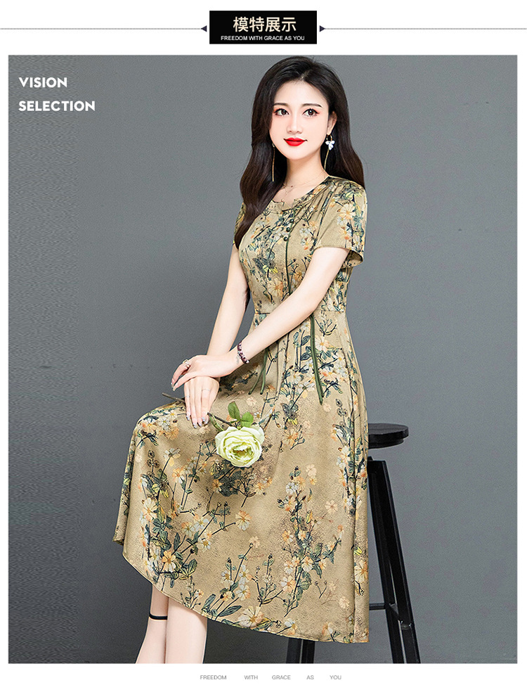 QYMKED-X369-Y,圆领复古印花连衣裙时尚新款妈妈装夏天短袖裙宽松中长款A字裙