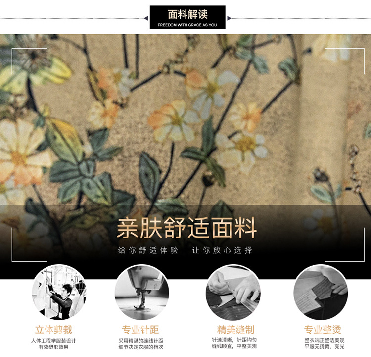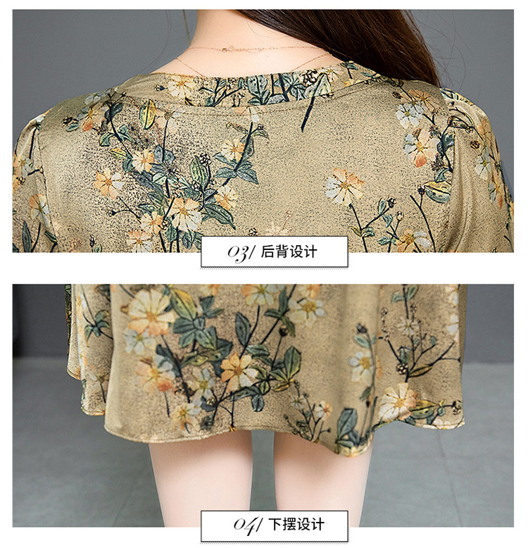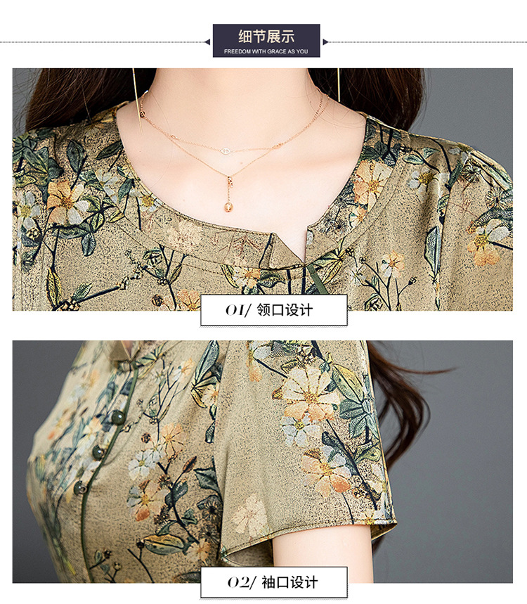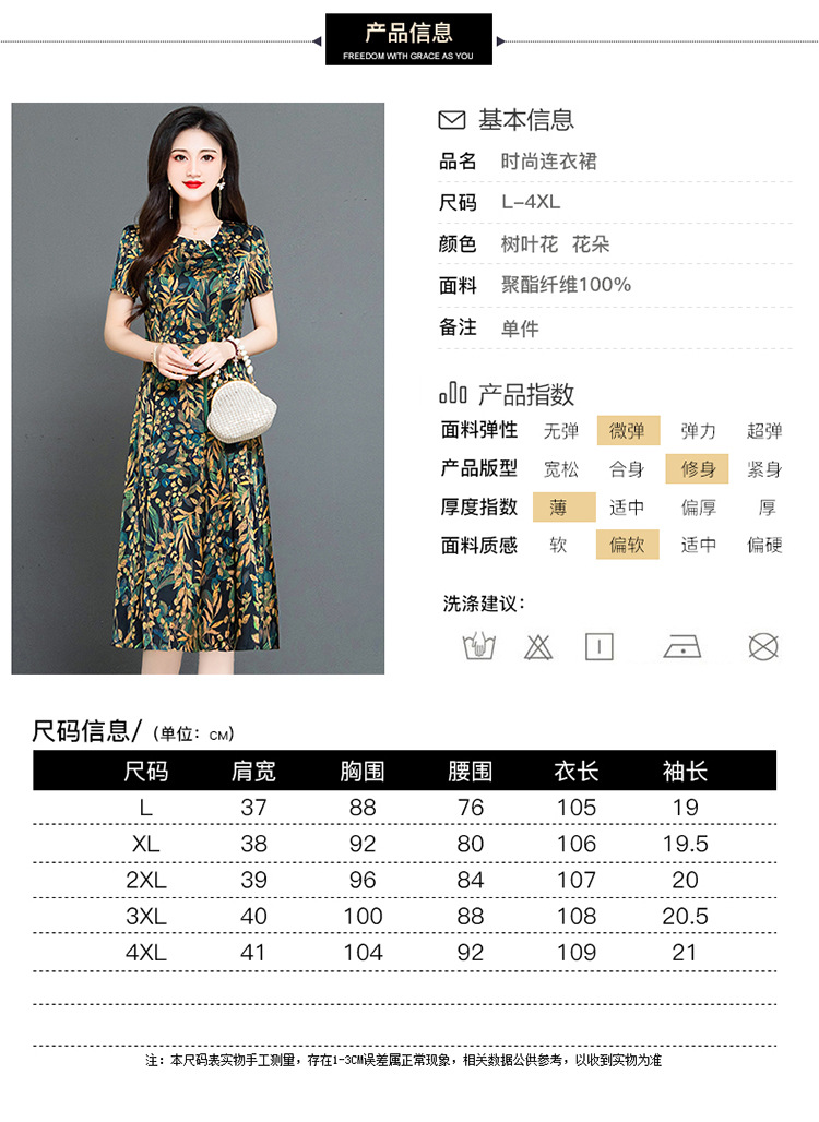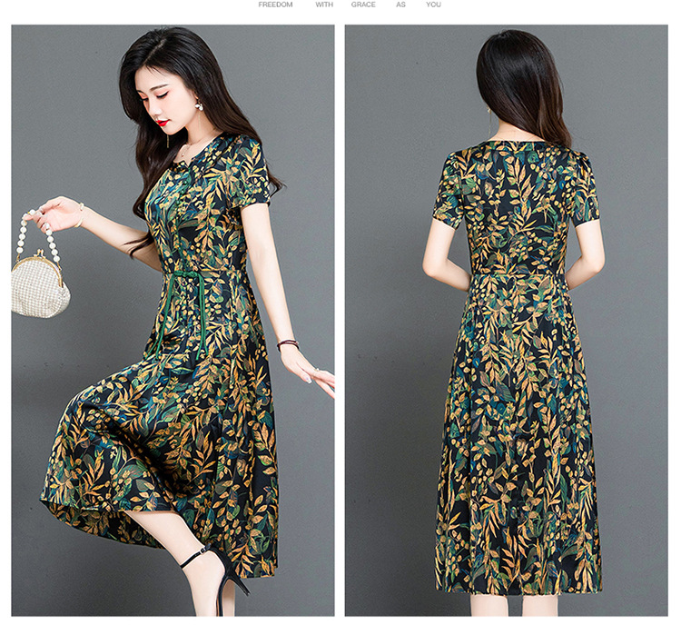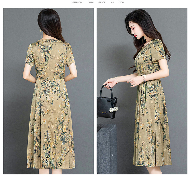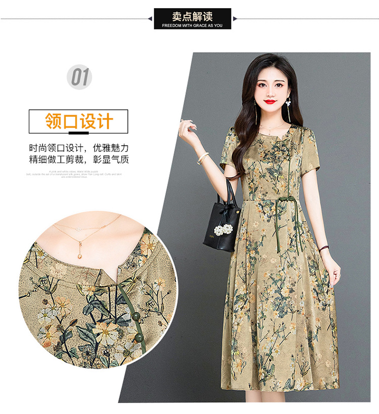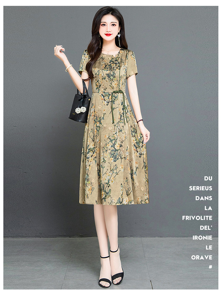 QYMKED-X369-Y,圆领复古印花连衣裙时尚新款妈妈装夏天短袖裙宽松中长款A字裙