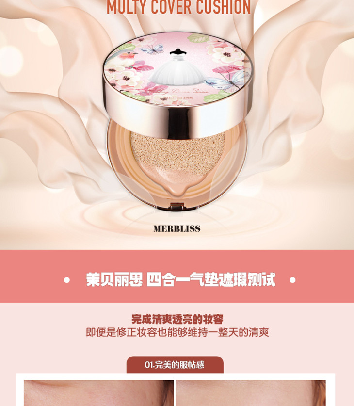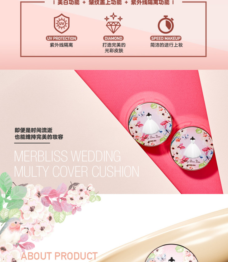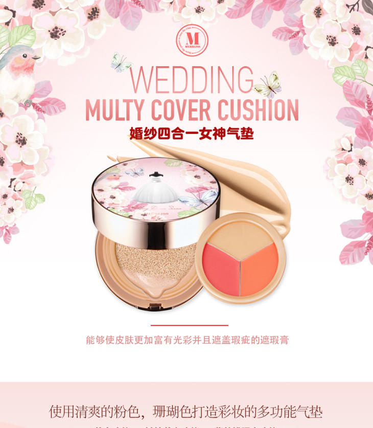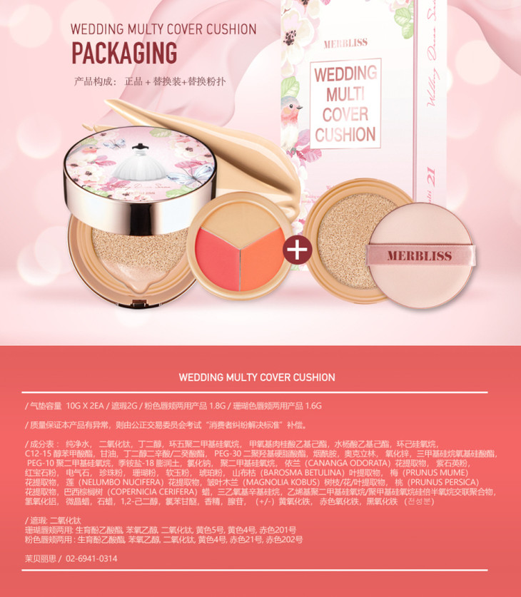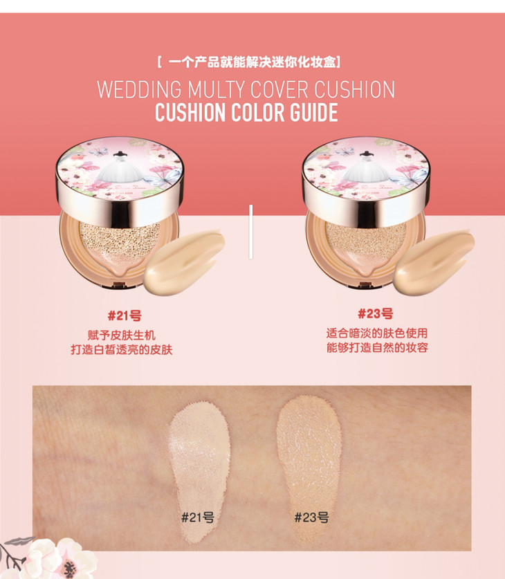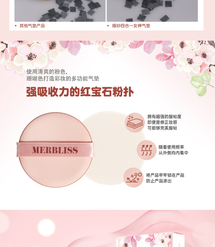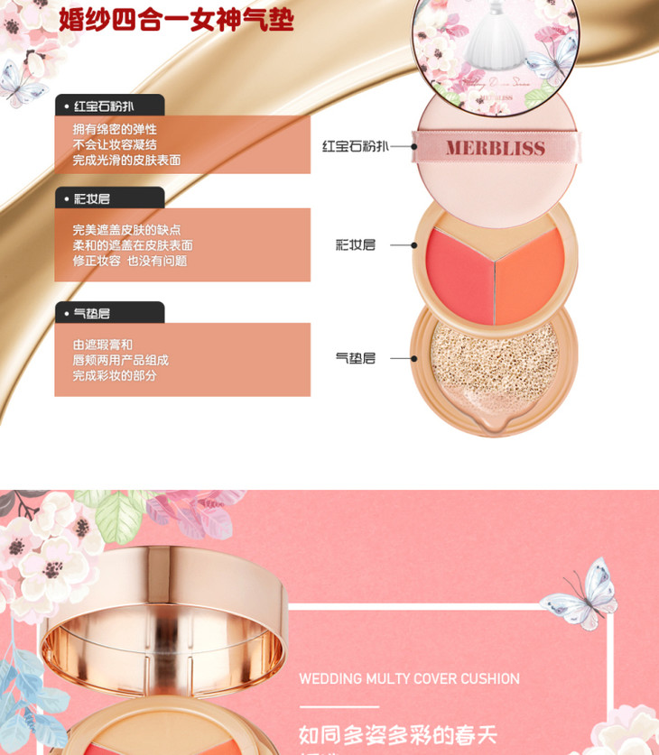 BX👑茉贝丽思MERBLISS 婚纱气垫,粉色盒:#21号:亮白色🍒紫色盒:#23号:自然色!🌸这是一款水珠气垫,与水分精华一起进入肌肤,表现新娘一般白皙透亮的妆容👰👰遮瑕的同时,保湿补水三大功效。🍂多种鲜花提取物散发隐隐的香气,清爽的使用感和丰富的保湿感紧贴并滋润肌肤,展现奢华的肌肤状态🍑。是一款会“呼吸的气垫”,会出水珠的气垫。🎄☁️打开之后,第一层是粉扑,第二层是遮瑕+腮红,接下来就是气垫层🍵自带粉扑上妆,第一感觉就是很服帖,而且超级遮瑕力👻👻