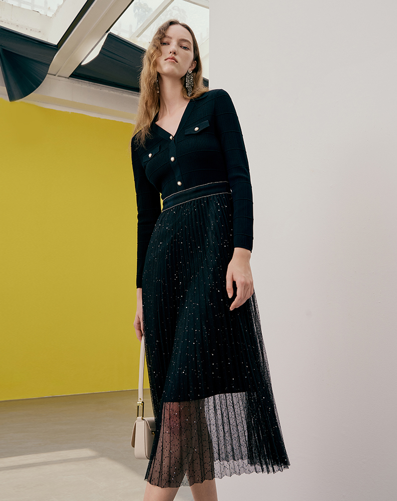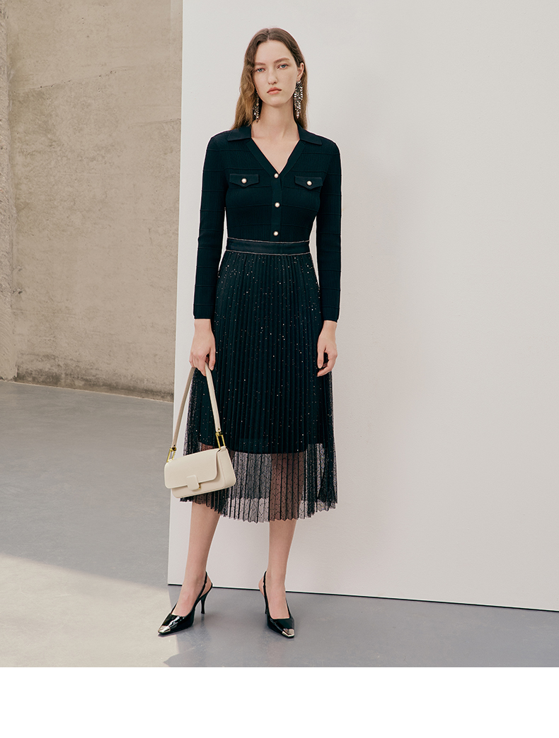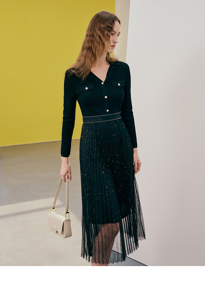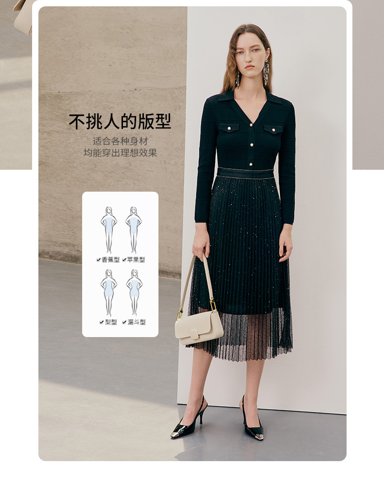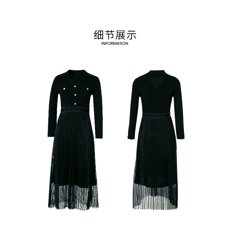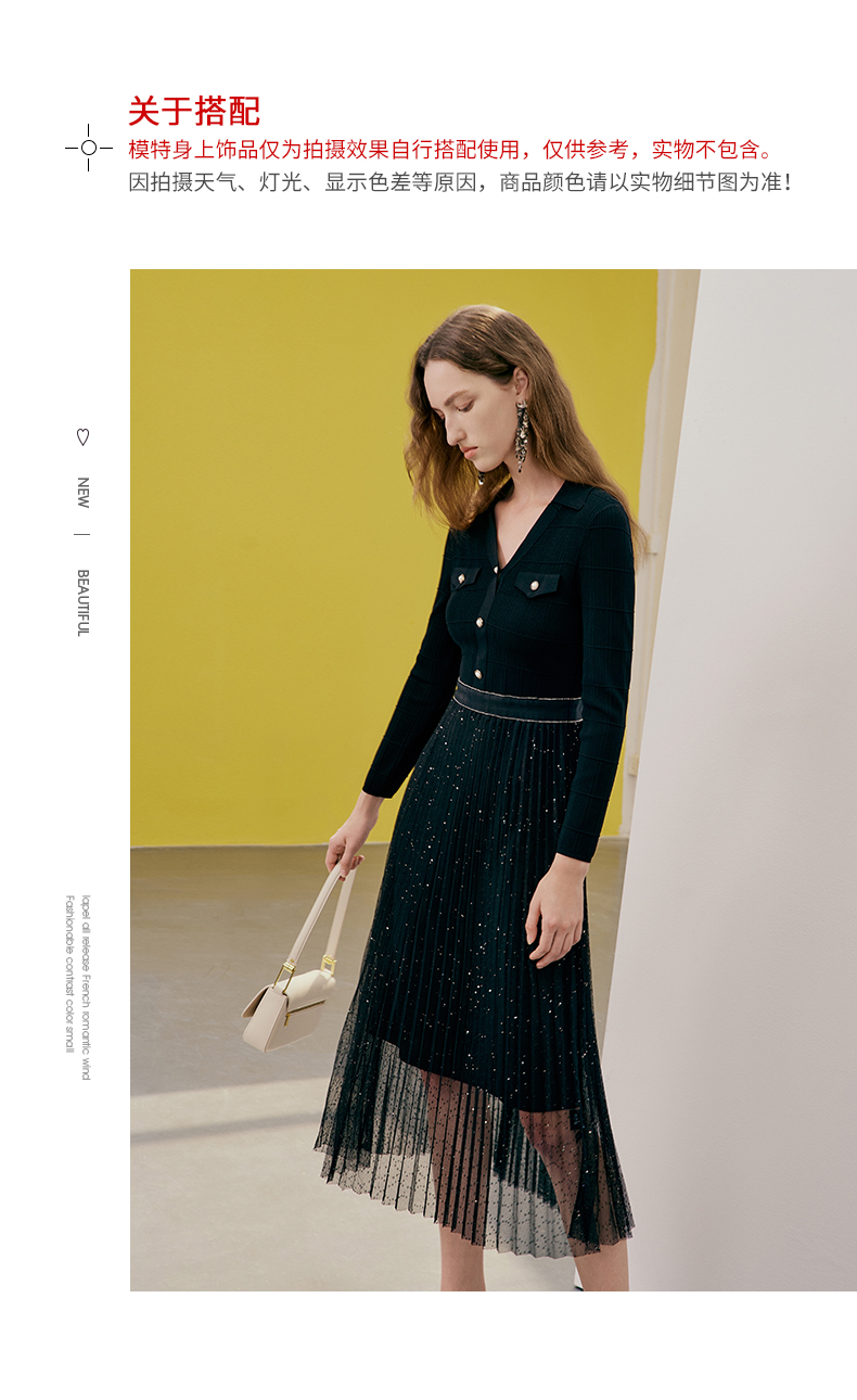 EITIE爱特爱春季新品高腰修身优雅蕾丝拼接连衣裙7307001