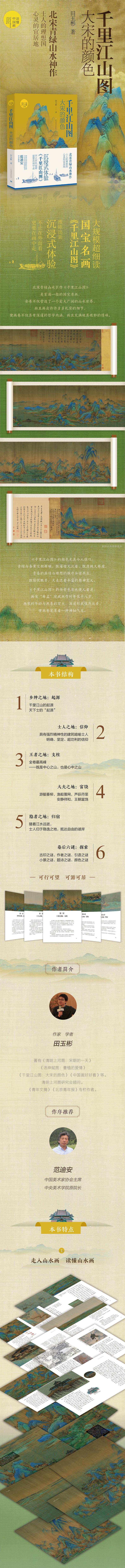《千里江山图》是一幅北宋时期的山水长卷。自徽宗宫廷辗转流传至今近千年,早已成为中国绘画目前一枚璀璨的瑰宝,无数国人心中的巅峰之作。许多人在看到这幅画的第一眼就会被它磅礴的气势和明丽的设色所吸引,但这幅画卷究竟画了些什么,又该如何欣赏,大多数读者依然是无从下手、一知半解。 本书聚焦《千里江山图》,根据画幅与画卷特征,将长卷分为五大段,一段一章节,即起源、信仰、支柱、富饶、归宿,好比跟随着一个士人的一生,走入他现实与精神交错的山水世界。本书自画卷中的一棵长松、一条小路开始,带读者进入画面,仰观飞瀑高崖,远望烟波浩渺,做客草舍茅屋,问道山野林间,在五段五章间穿梭自如,游目骋怀,沉浸式体验中国山水画之高妙。 五段画面,五大章节的结构,既能让读者对画卷有全面的认识,又能逐段细赏画中细节,真正做到“远望其势,近观其质”。《千里江山图》流水沟通、长桥相连的连贯气势,加之作者酣畅优美的文笔,使读者于不知不觉间沉浸在“可行可望,可游可居”的中国山水美学、哲学世界,从而会看画、看懂画,提升审美,感受传统文化之魅力。