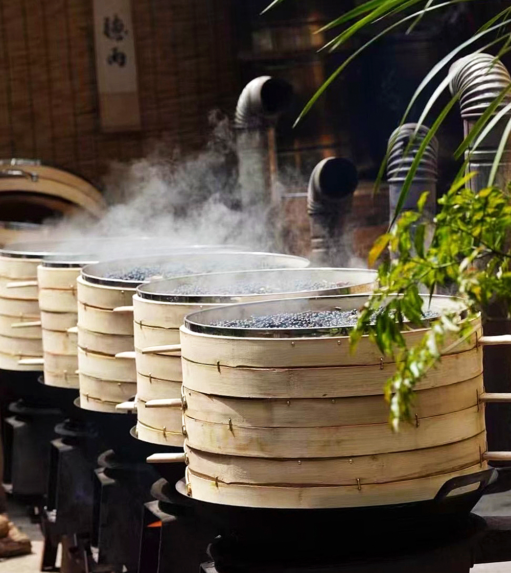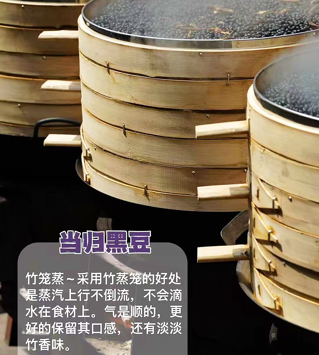将黑豆与当归一起经过三次蒸制和三次日晒的过程,每一轮蒸制和日晒都会增强食材的营养、风味,更好地补身益气。