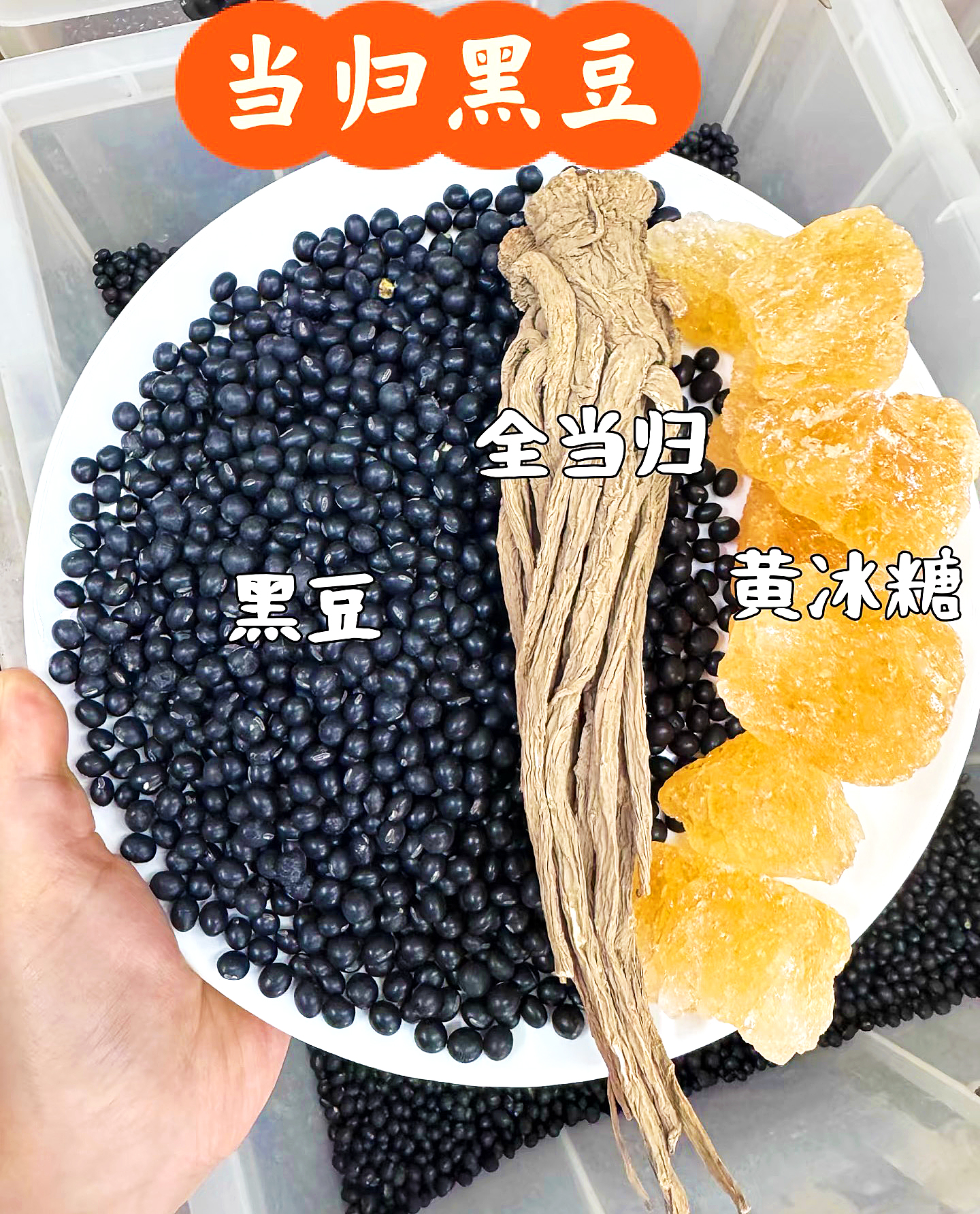 原料选择了绿心黑豆+当归+云南老冰糖,每10斤黑豆搭配1斤当归和1斤冰糖。