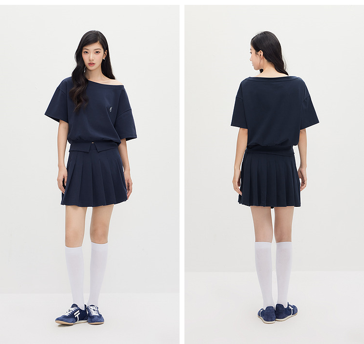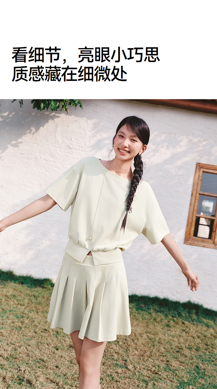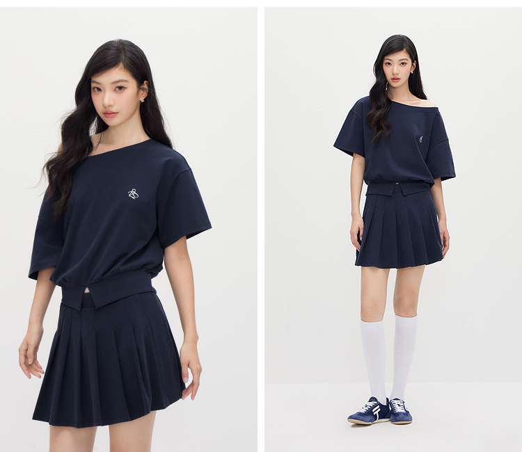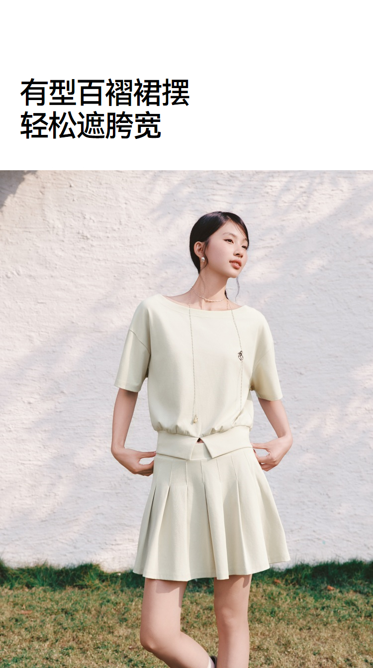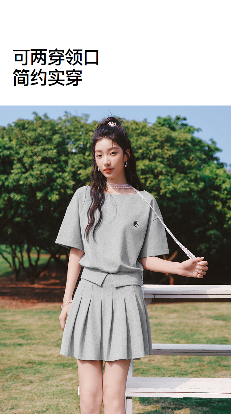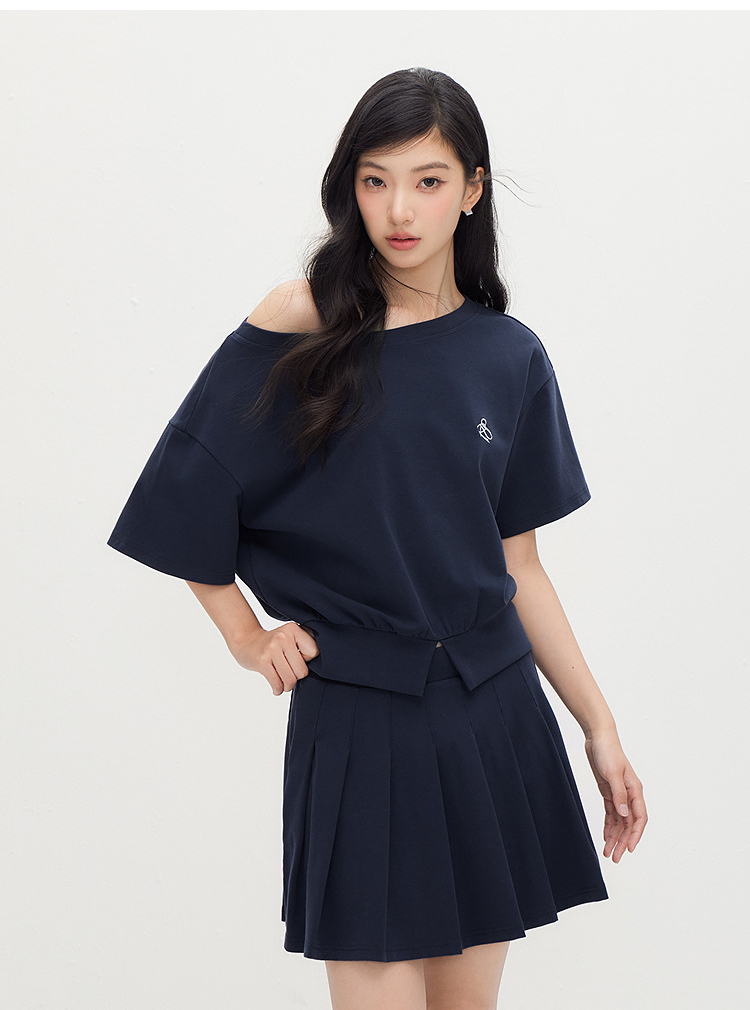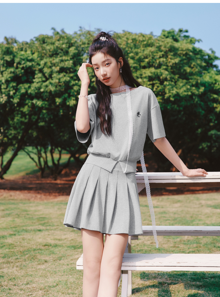 森马套装女夏季短款百褶裙斜肩开叉上衣刺绣2026新款小性感两件套