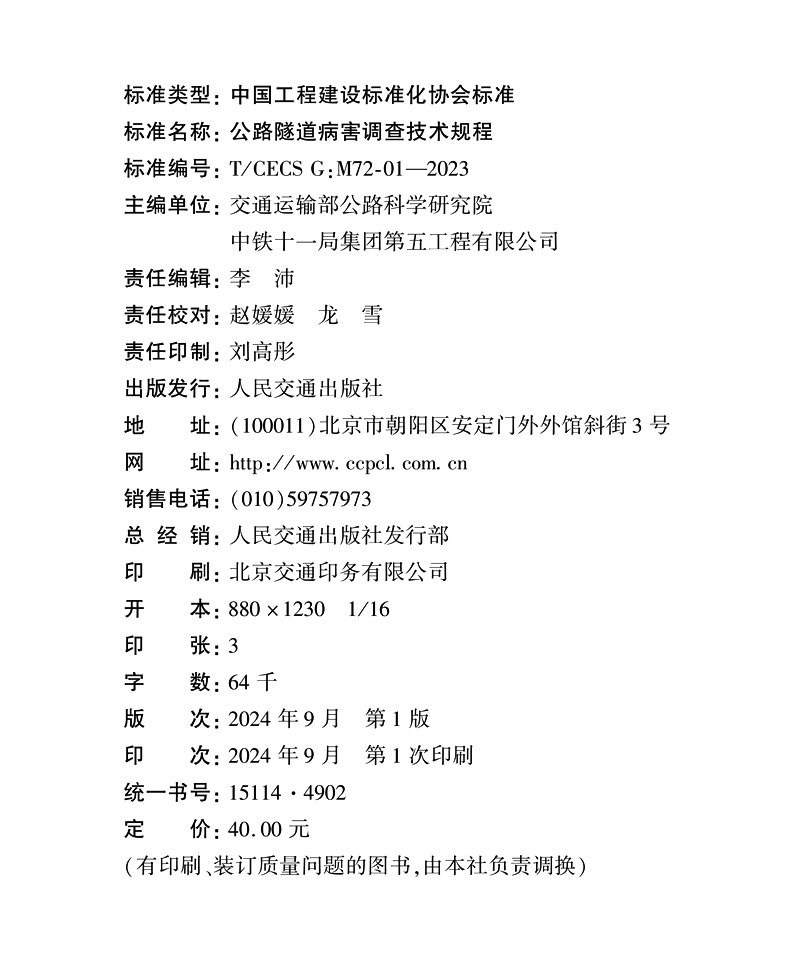 书名:公路隧道病害调查技术规程(T/CECS G:M72-01—2023)