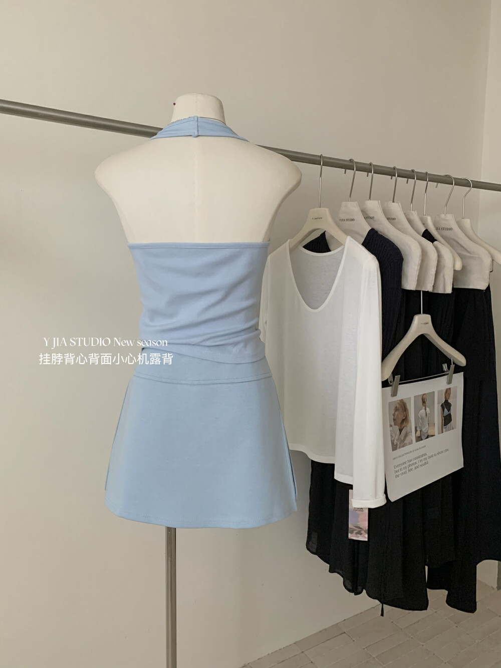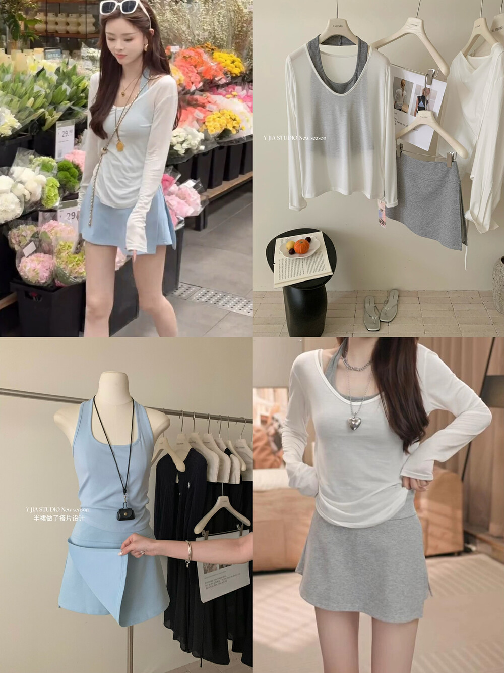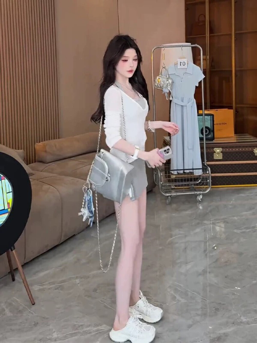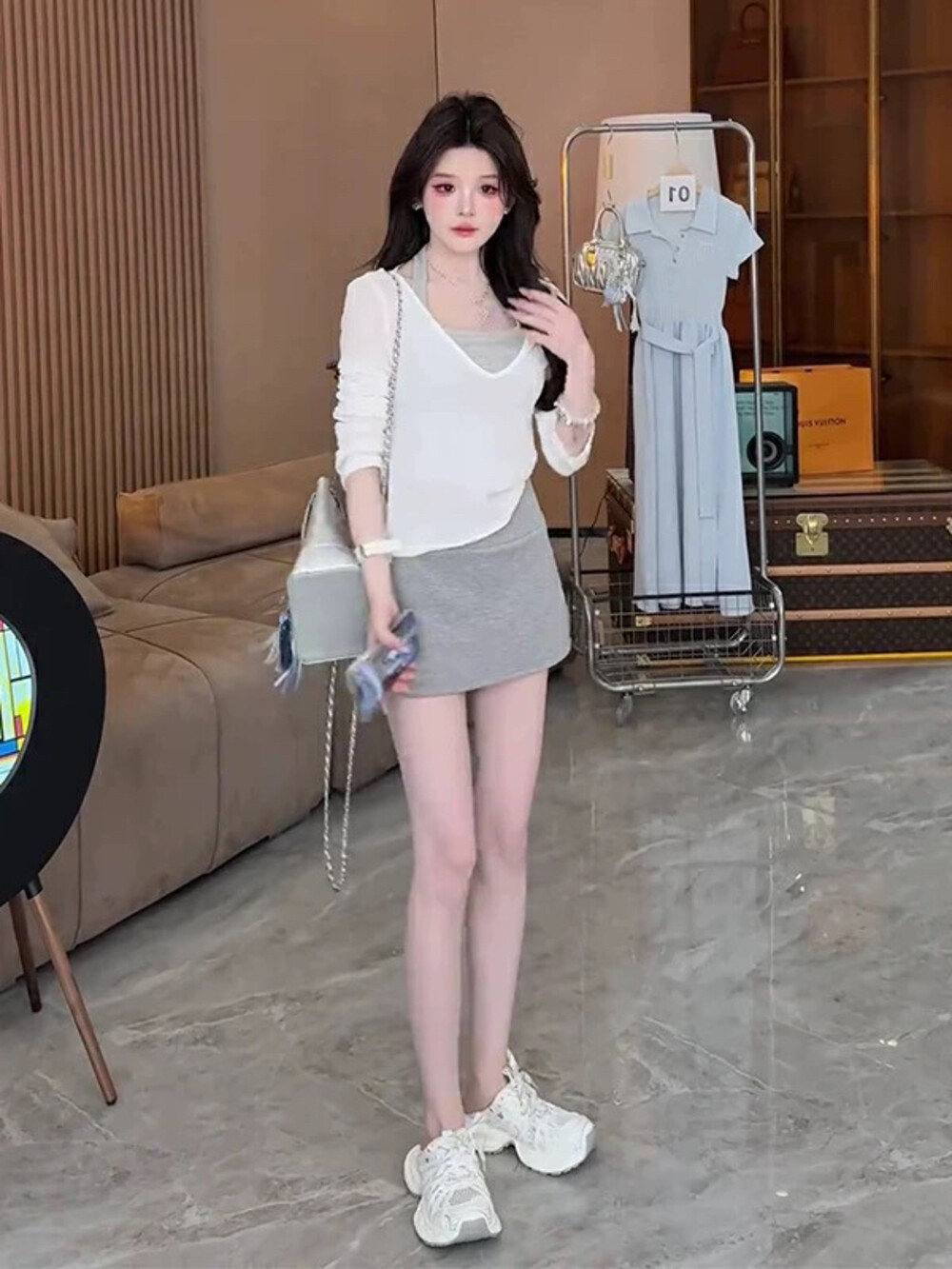 【GZ】无忧购纯欲宽松百搭防晒罩衫T恤+辣妹挂脖露背背心+设计感假两裤裙套装6881#(截单后3-5天发货)