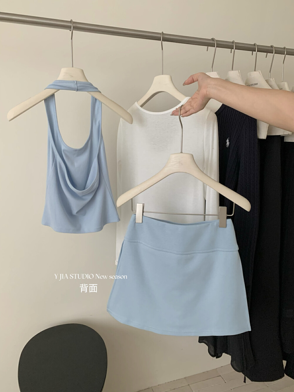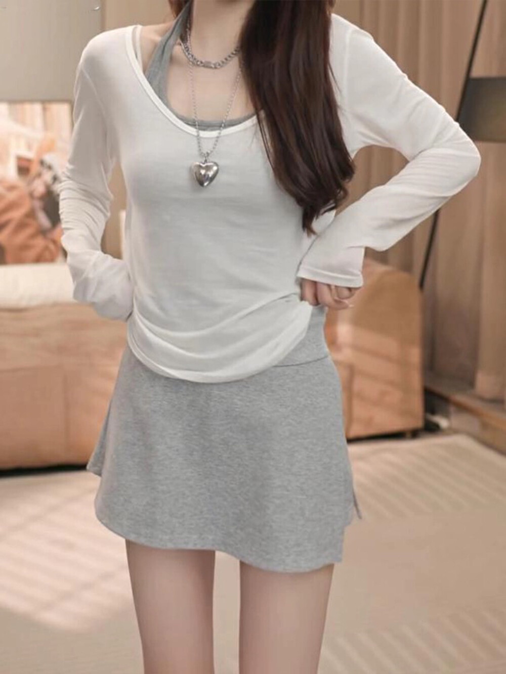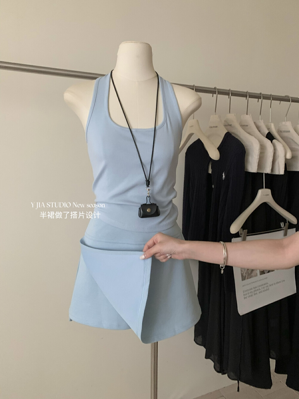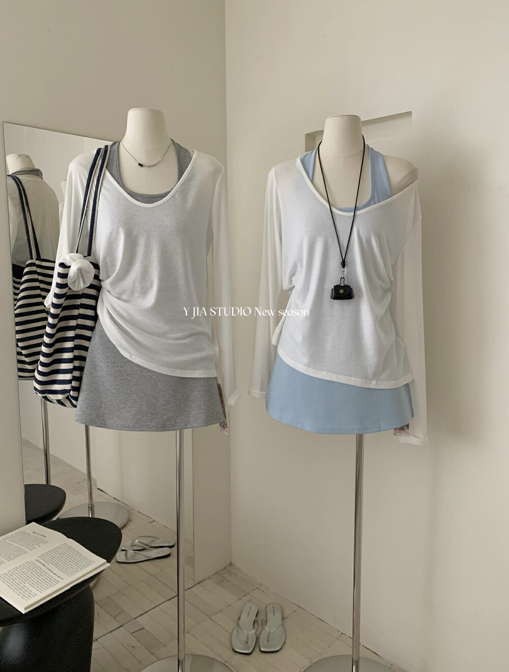 【GZ】无忧购纯欲宽松百搭防晒罩衫T恤+辣妹挂脖露背背心+设计感假两裤裙套装6881#(截单后3-5天发货)