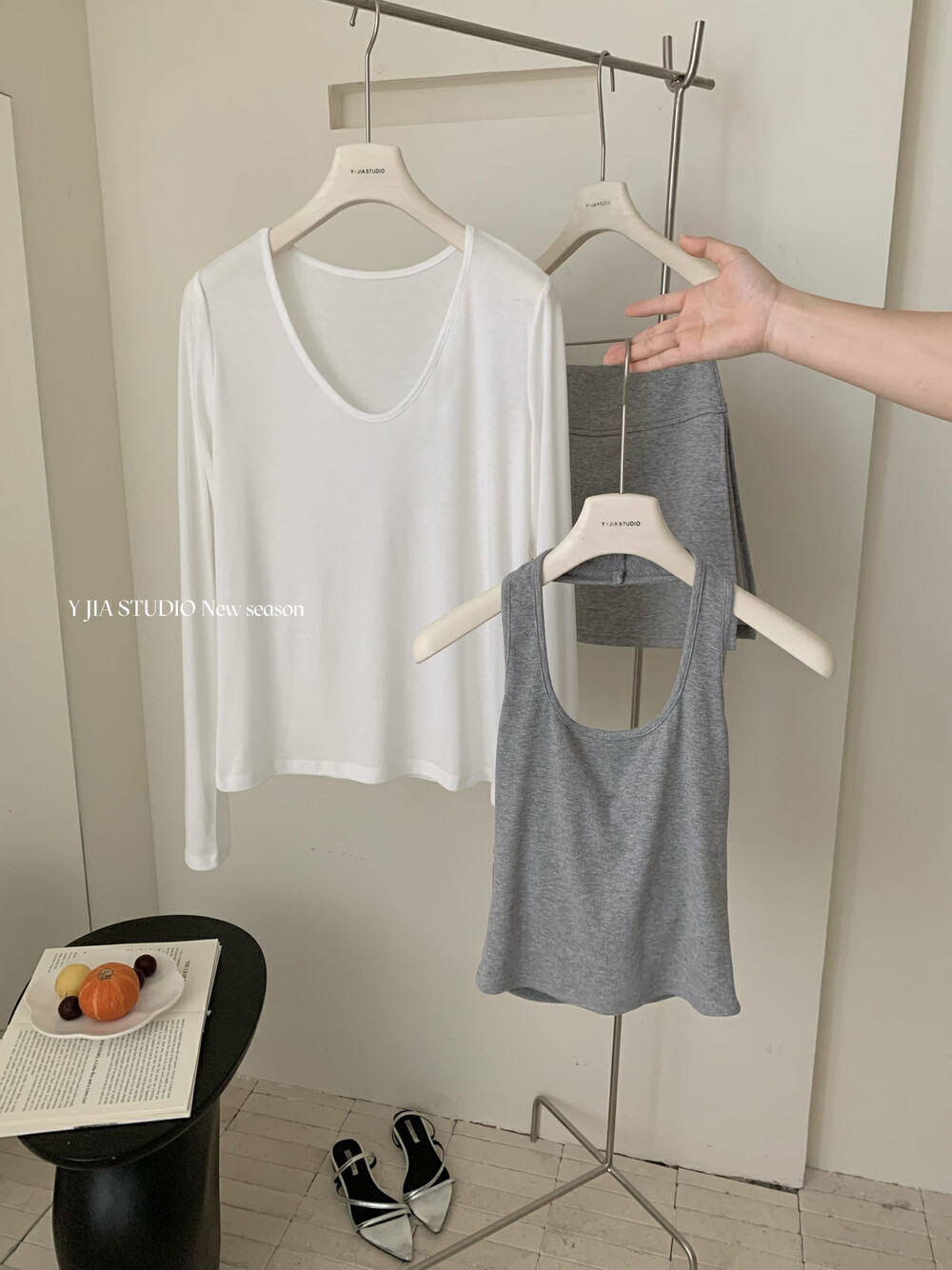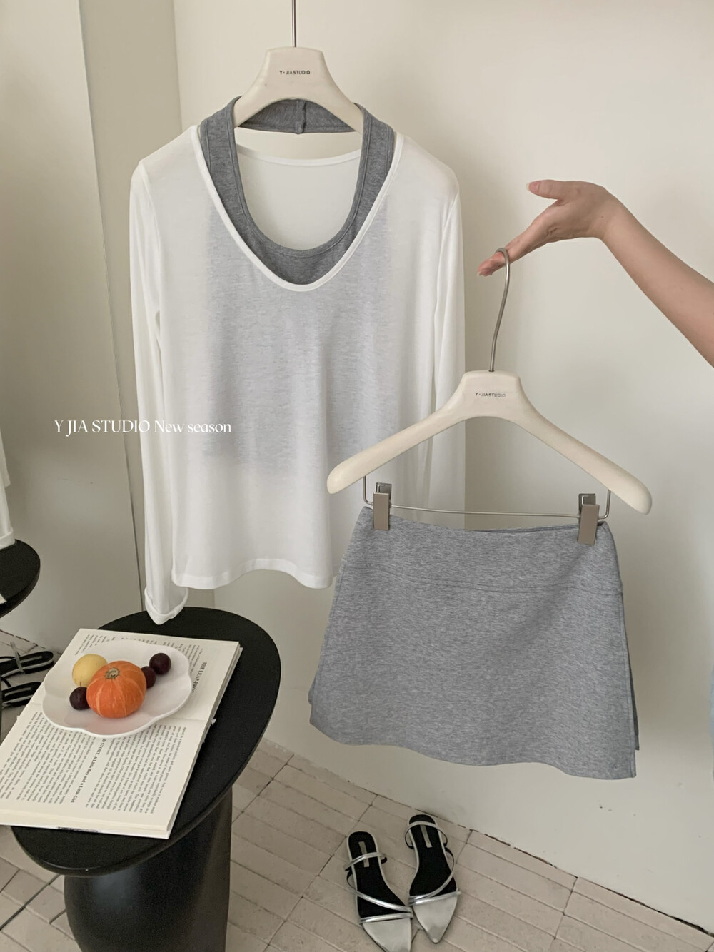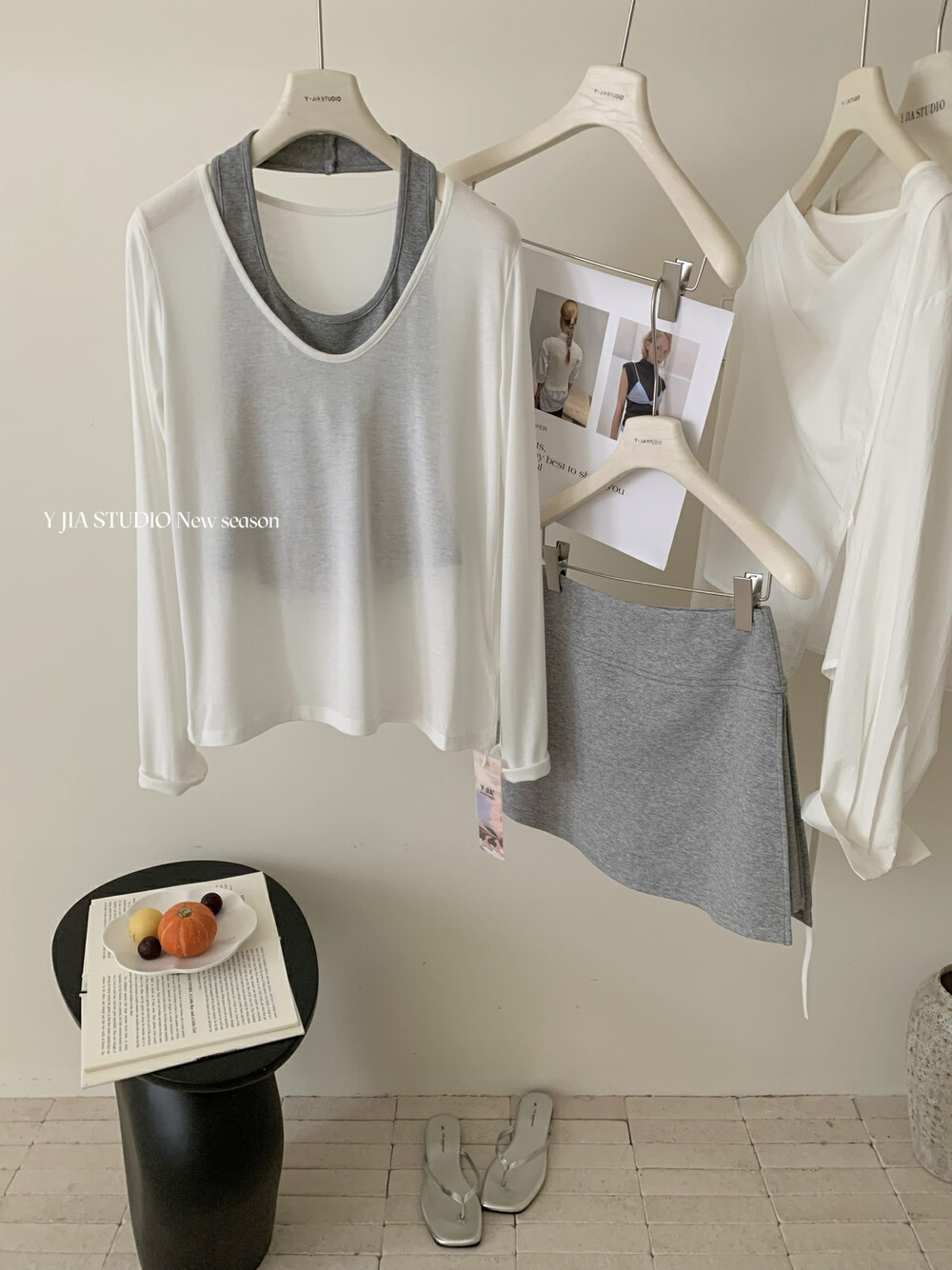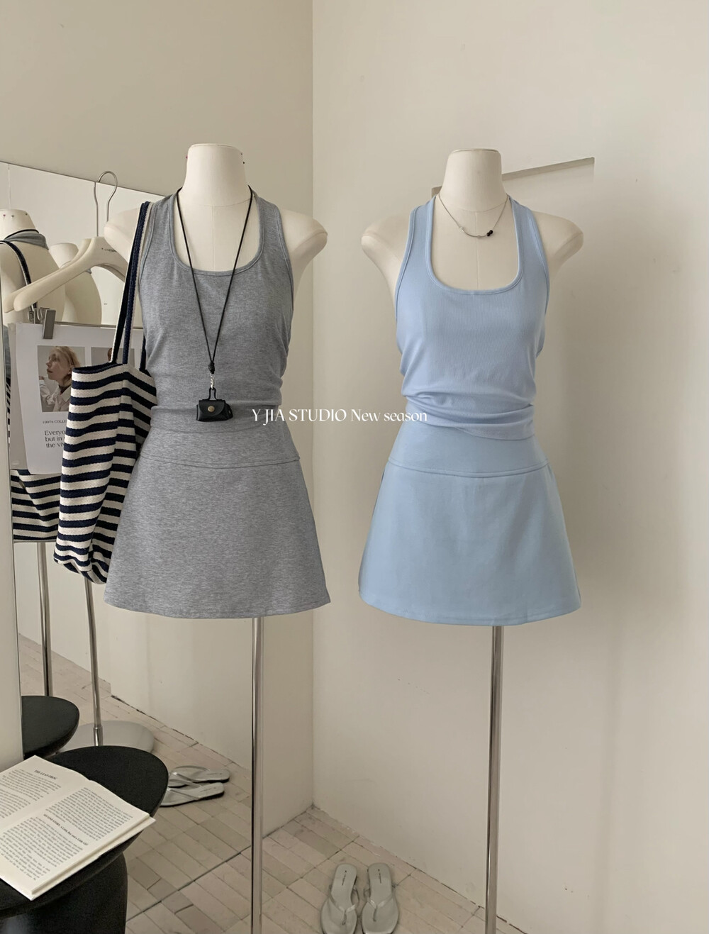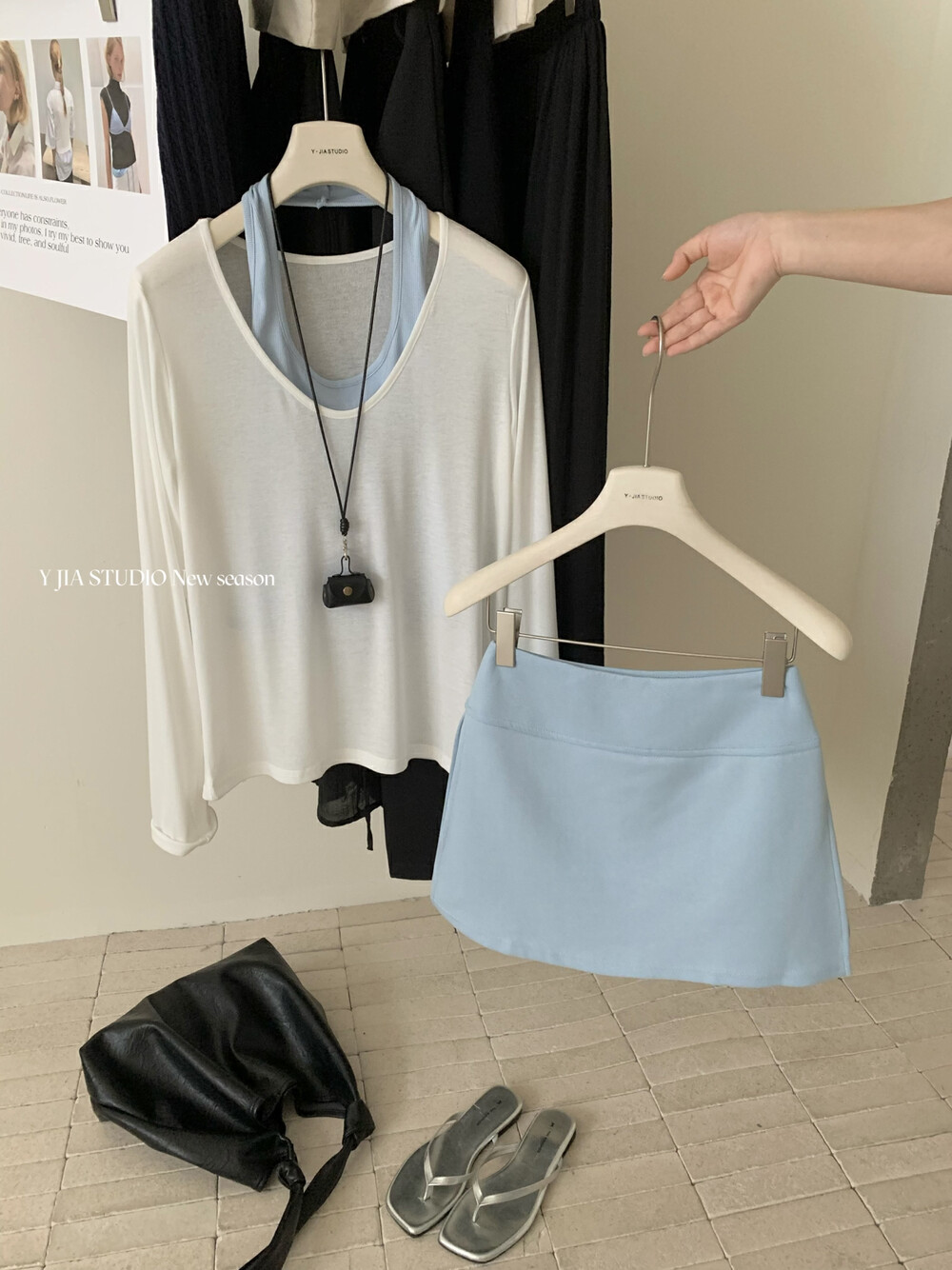 【GZ】无忧购纯欲宽松百搭防晒罩衫T恤+辣妹挂脖露背背心+设计感假两裤裙套装6881#(截单后3-5天发货)