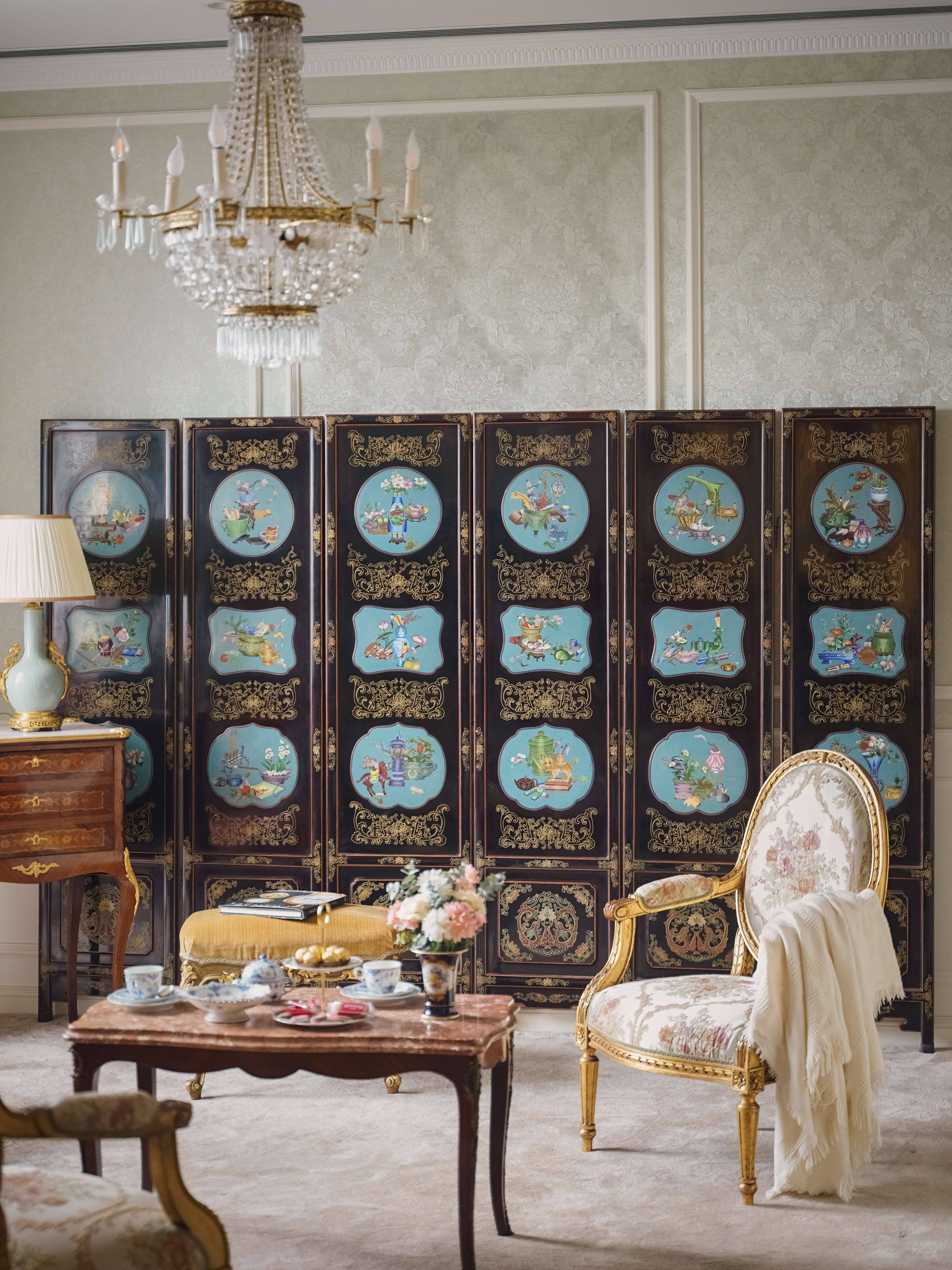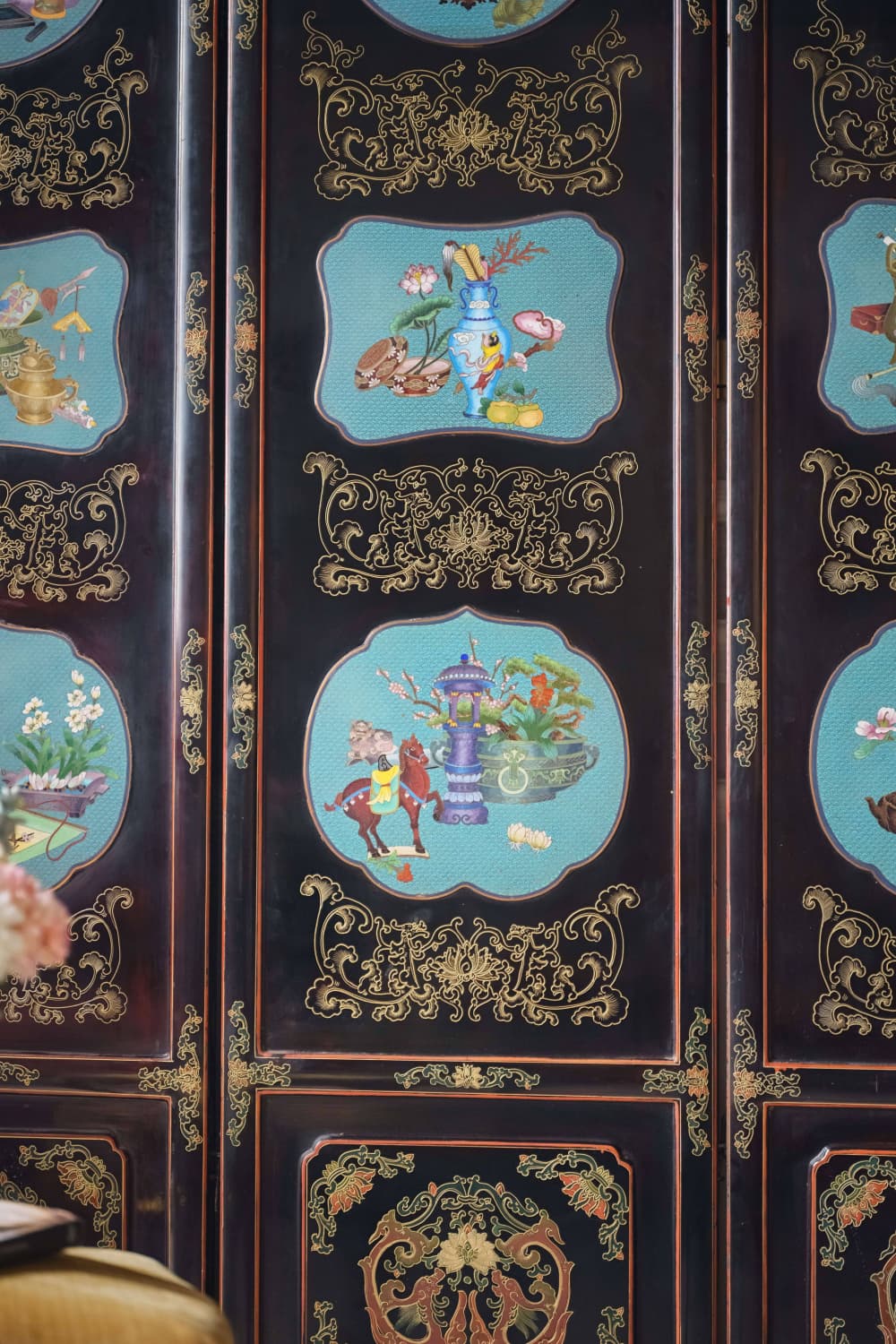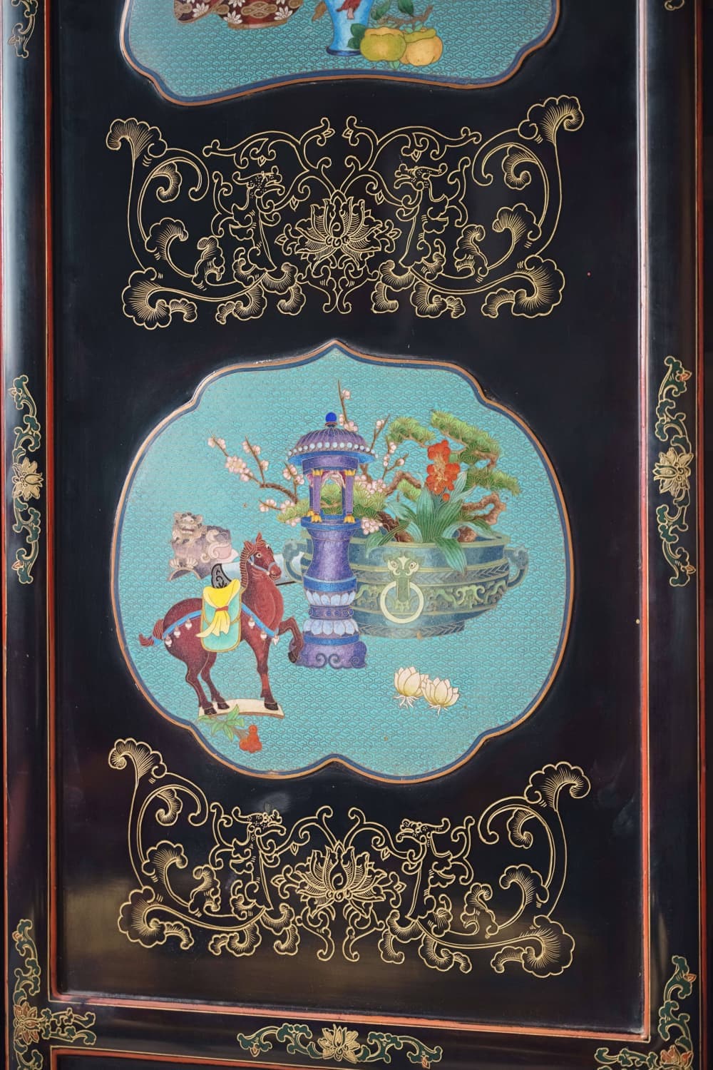 【已售】独角鹿西洋古董20世纪中国出品黑漆木装饰手绘描金嵌清供博古图主题掐丝珐琅六曲屏风