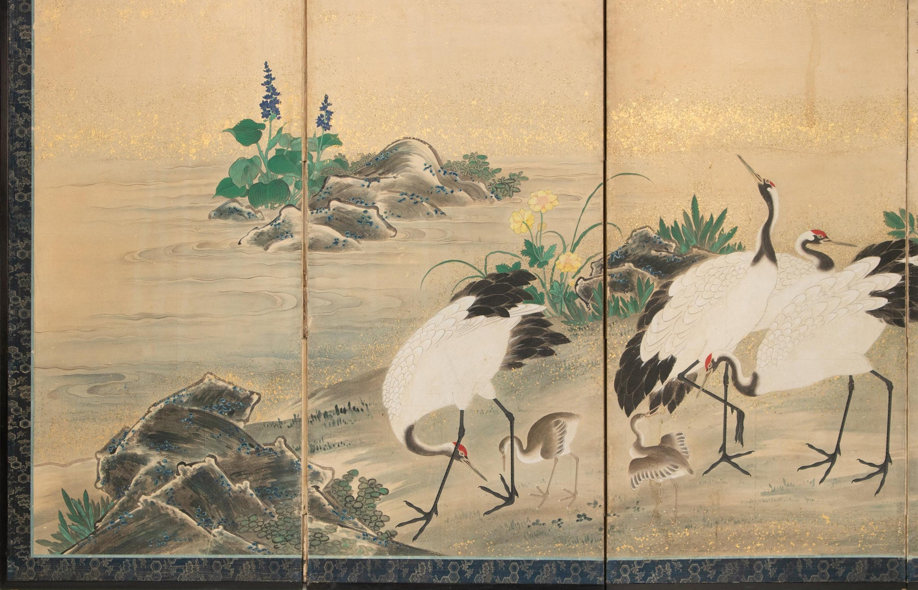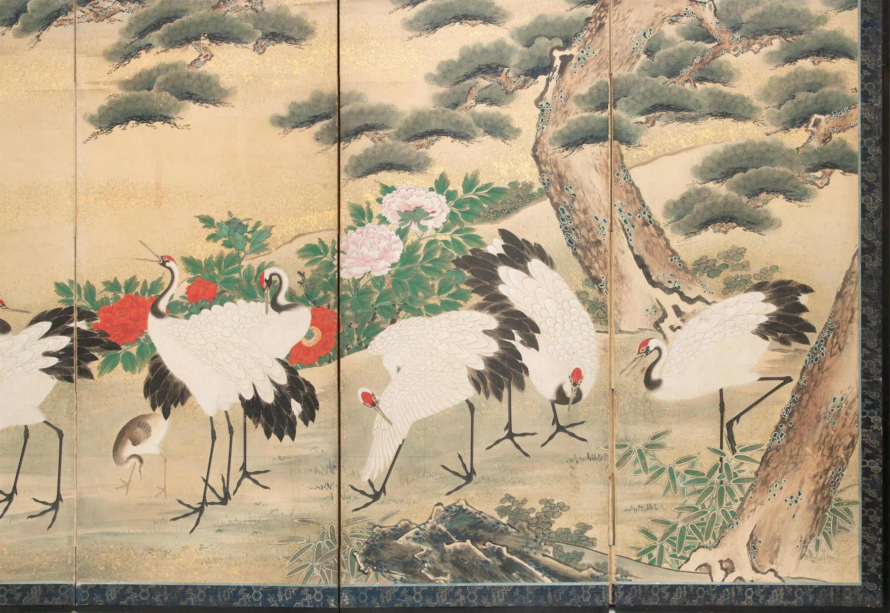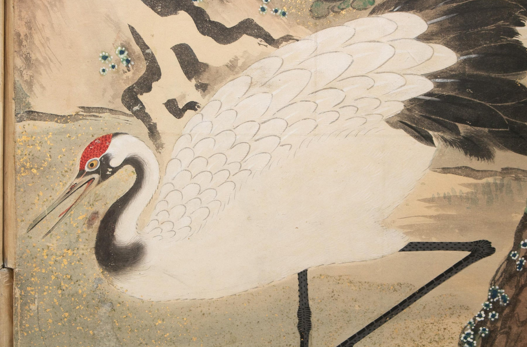 19世纪日本明治时期出品「劲松群鹤」主题纸本设色洒金六曲屏风