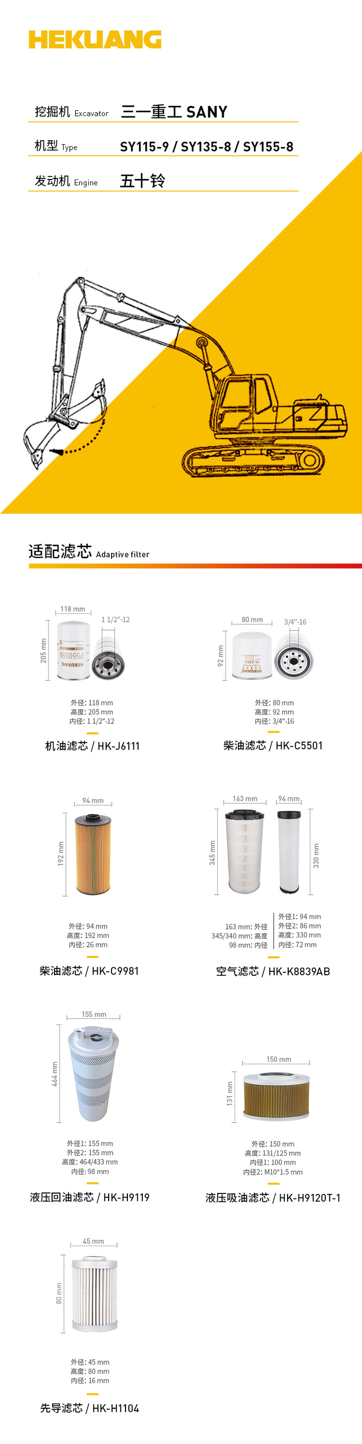 三一重工SY115-9/SY135-8/SY155-8(五十铃)挖掘机适配滤芯 机柴滤芯 液压油吸油回油滤芯 空气滤芯 先导滤芯