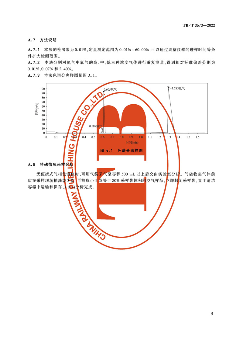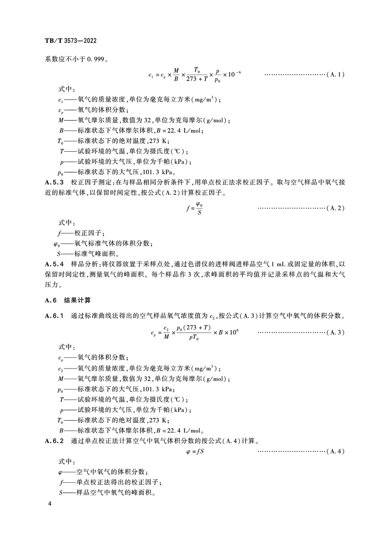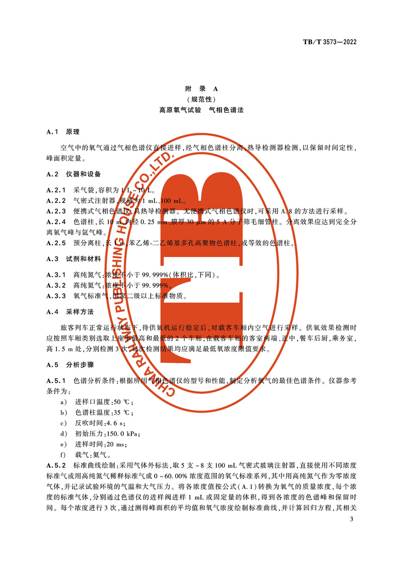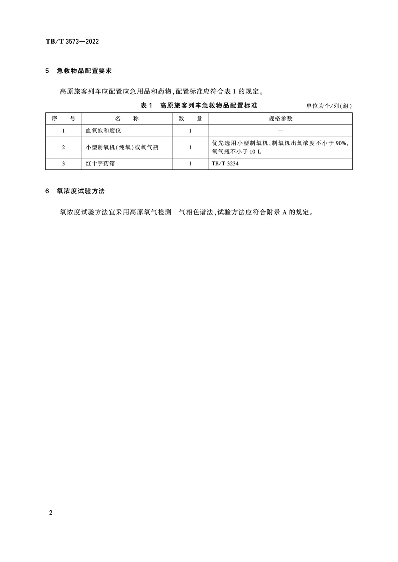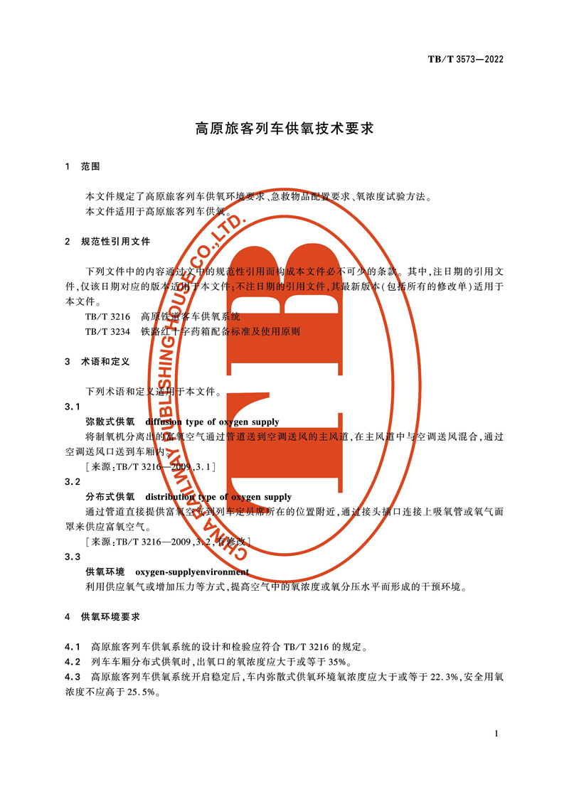 《高原旅客列车供氧技术要求》为中华人民共和铁道行业标准,由国家铁路局发布,标准号为TB/T 3573—2022,主要内容包括:范围,规范性引用文件,术语和定义,供氧环境要求,急救物品配置要求,氧浓度试测方法,附录A,参考文献。附录A为(规范性)高原氧气试验-气相色谱法。本标准有中国铁道科学研究院集团有限公司节能环保劳卫研究所归口,起草单位为中国铁道科学研究院集团有限公司节能环保劳卫研究所、中国铁路青藏集团有限公司疾病预防控制所。