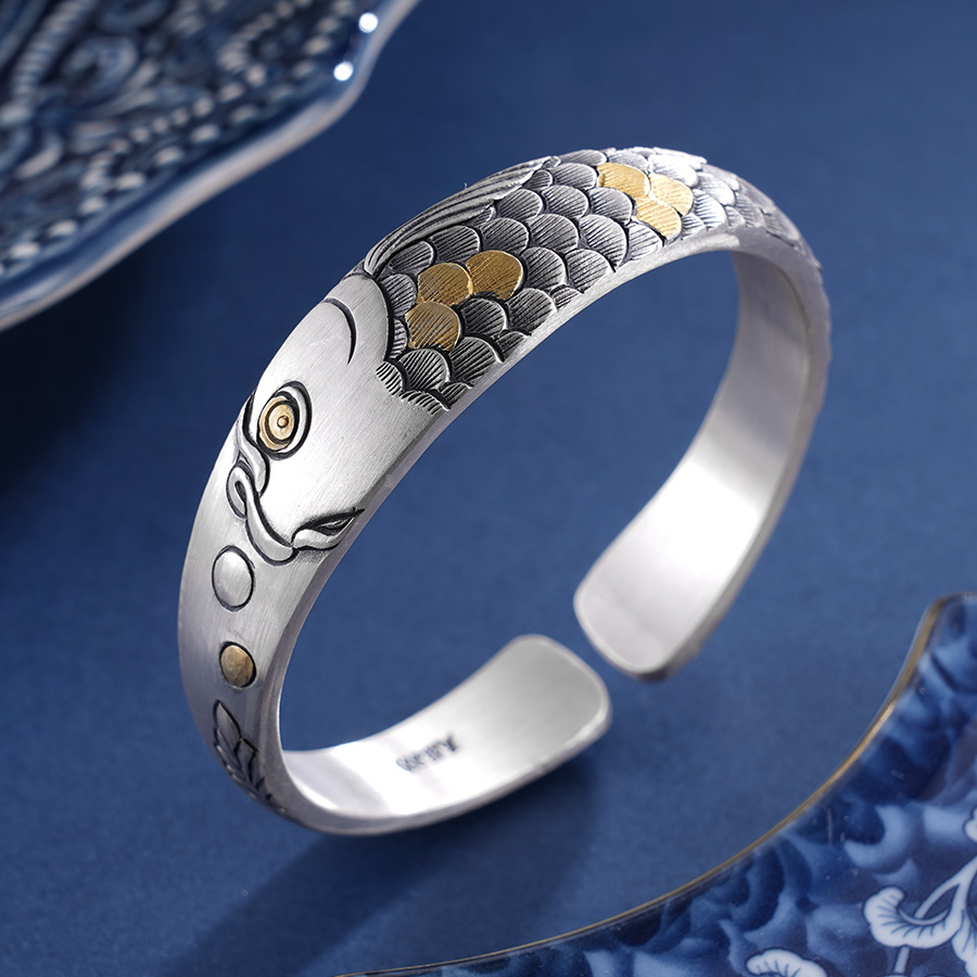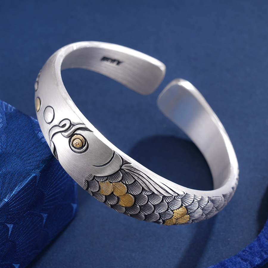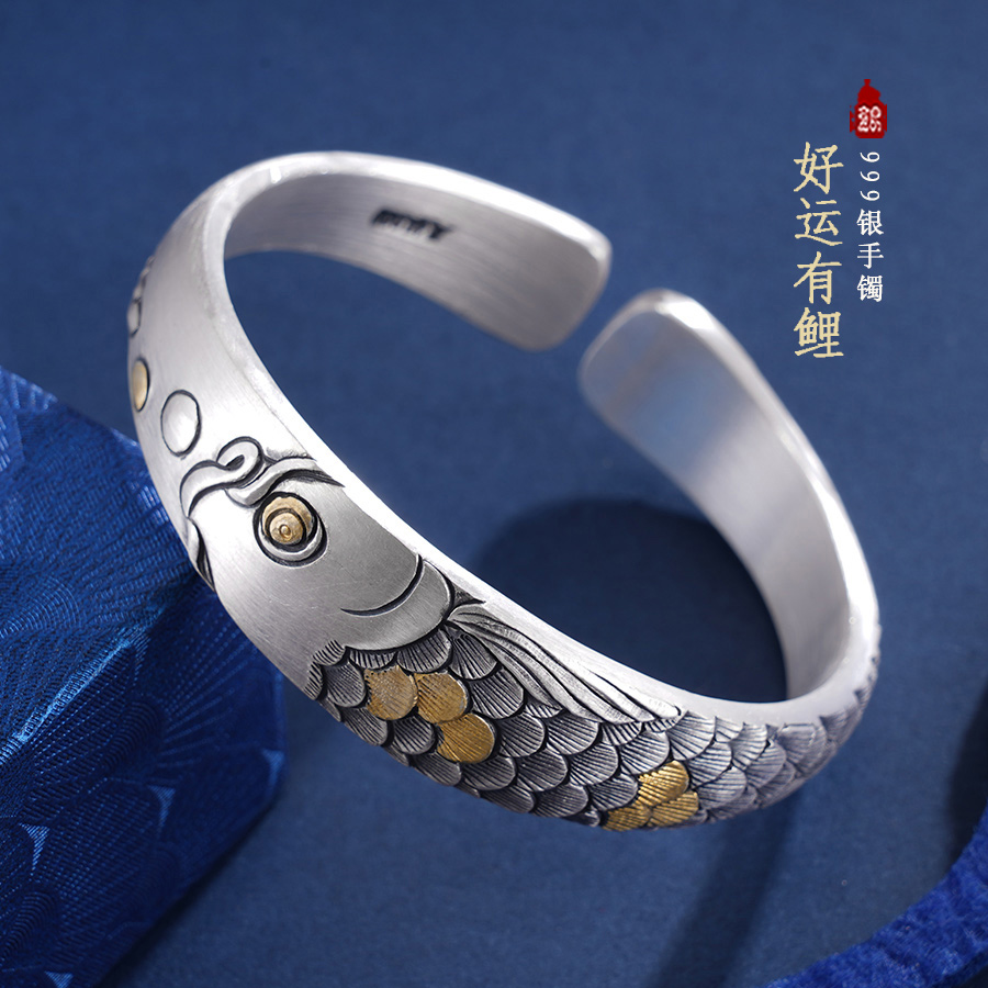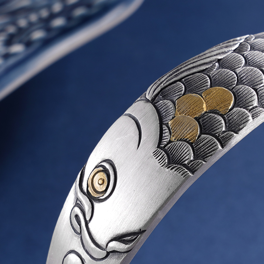 【寓意】:作品以锦鲤为灵感设计,应用錾刻、仿古工艺打造。造型别致立体,鳞片层次分明,整体兼具复古感与肌理感,寓意锦鲤附体,好运连连。