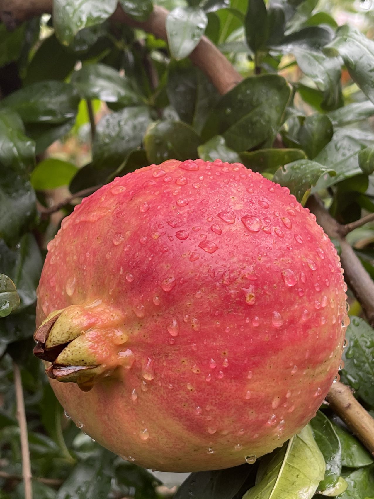 此现象为石榴在6-7月壮果发育期遇高温天气导致的水分供给不足。此现象不影响口感,并非不新鲜的表现。