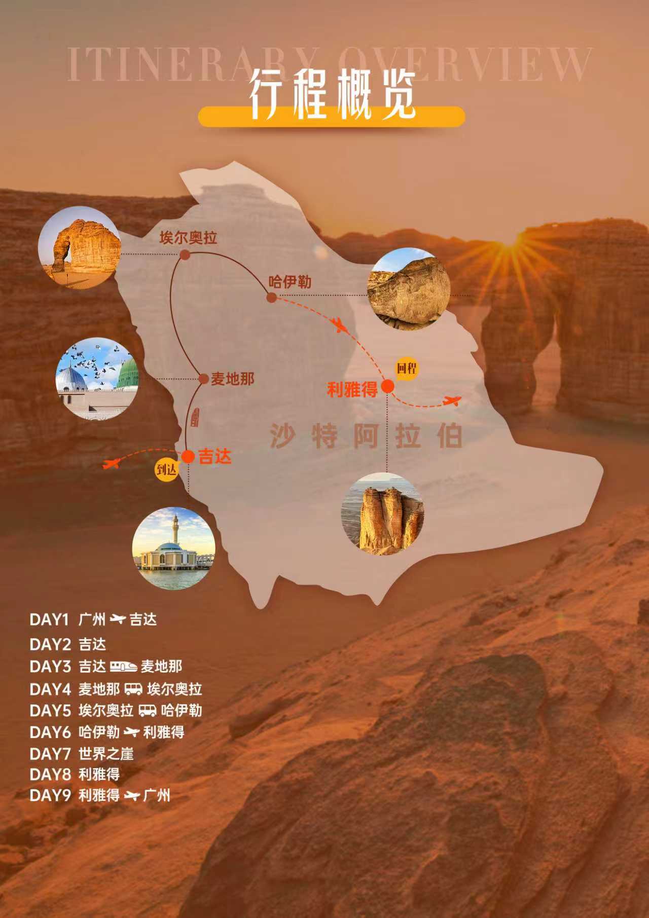 【行程特色】 1、含广州往返机票,特别安排1段内陆机,节省拉车时间; 2、沙特阿拉伯全景摄影,一次性探访五座至具代表旅游城市,不留遗憾! 3、寻访4大世界遗产:黑格拉沙漠峡谷、德拉伊耶・图拉伊夫王宫遗址、露天博物馆巴拉德老城、中东新石器时代岩石艺术遗迹哈伊勒; 4、特别安排换乘越野车前往"世界之崖",苍凉谷底和远方地平线一览无余; 5、拍摄当地多个历史古城人文,沉浸式体验沙特风情。 |