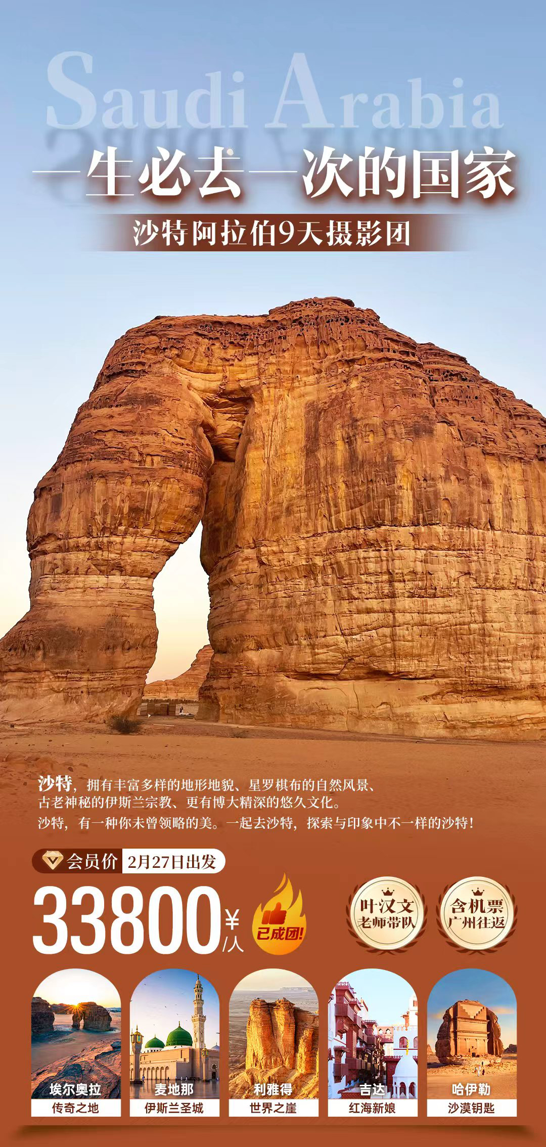 一生必去一次的国家|沙特阿拉伯:沙漠绿洲利雅得、麦地那、黑格拉沙漠峡谷&大象岩、世界之崖、红海"明珠"吉达9天摄影团