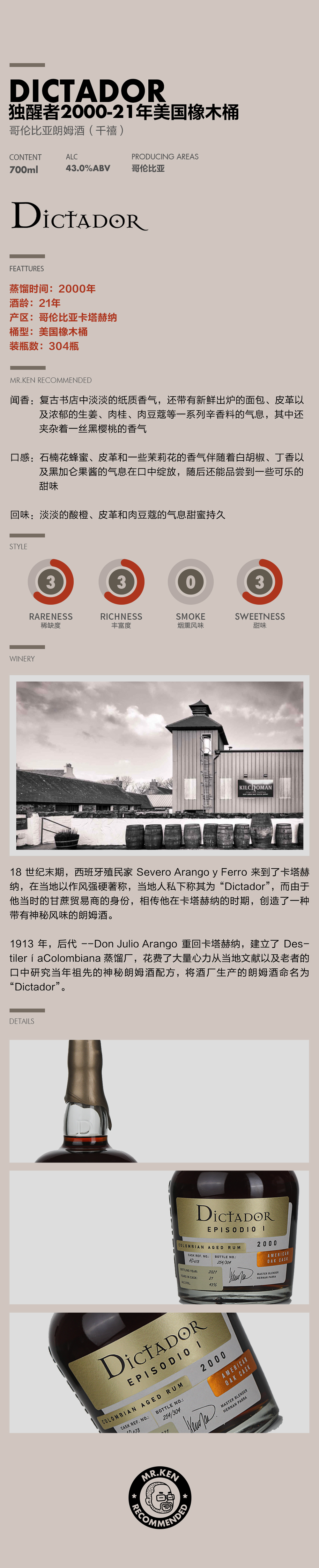 独醒者(Dictador)2000-21年美国橡木桶哥伦比亚朗姆酒(千禧)