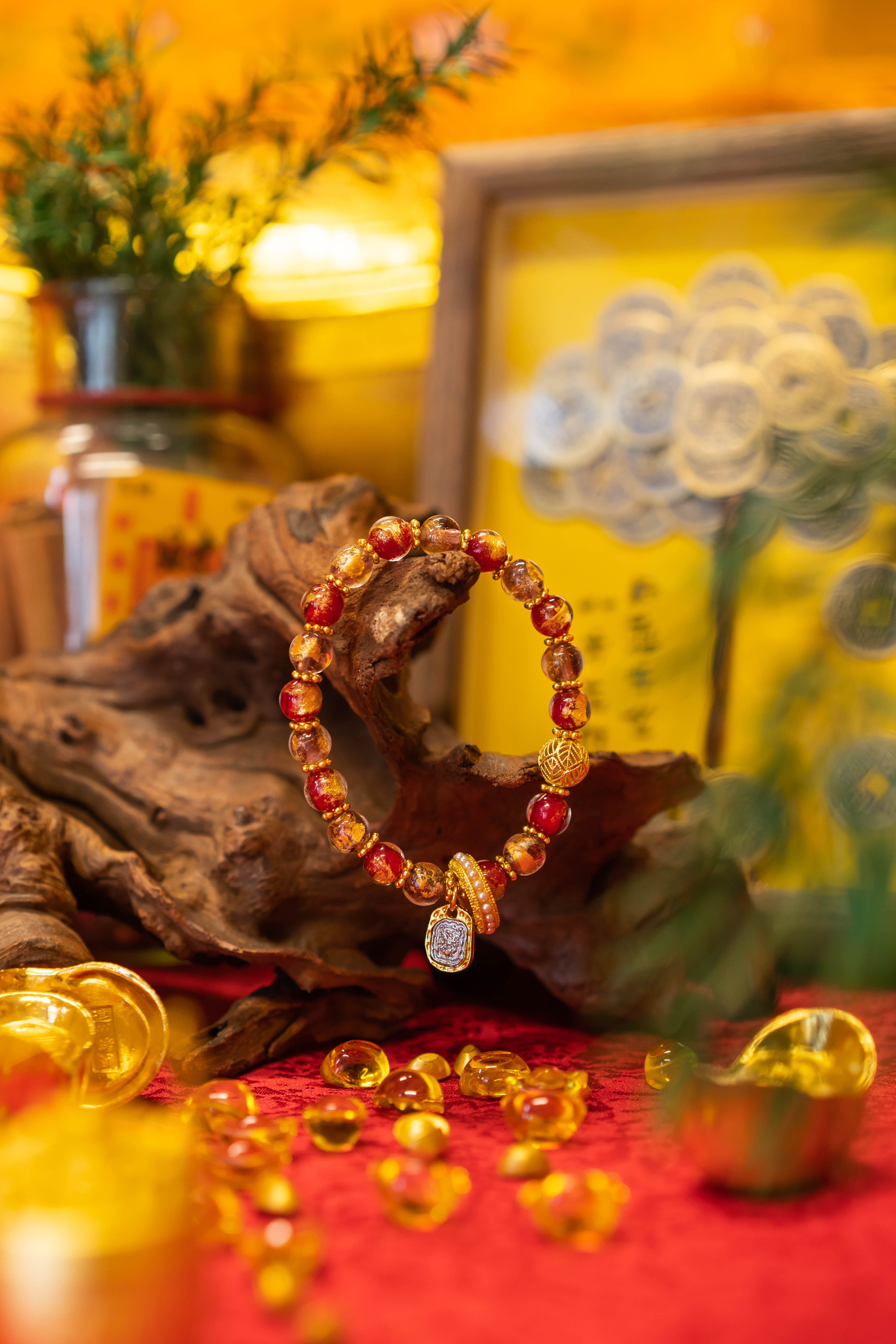 1.在寺庙里燃尽后的香灰带有祝福和灵性,把它和金银箔一起封存在手工琉璃珠里面,流光溢彩,圣神祥瑞。其中红色珠子寓意着贵人扶助、招桃花;紫色珠子代表紫气东来,幸运爆棚。