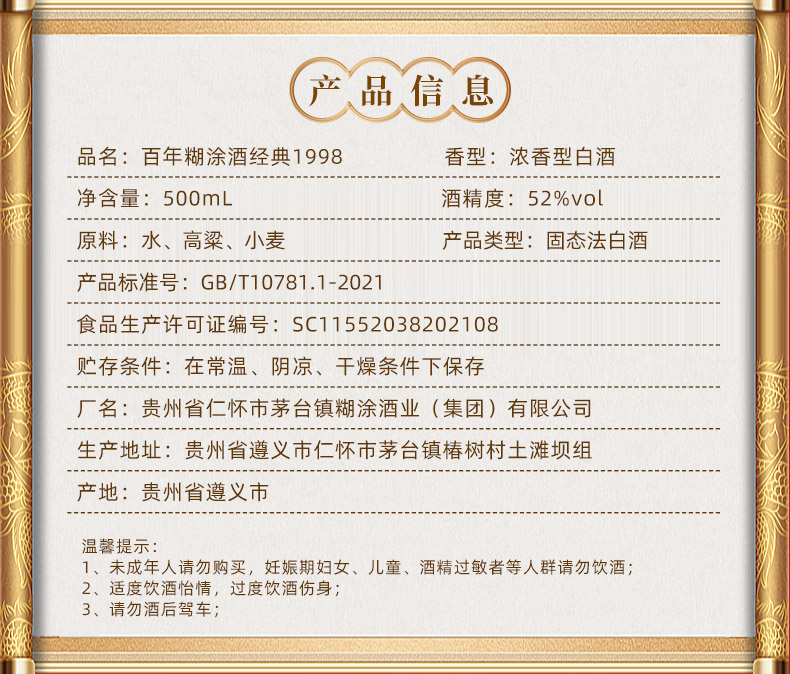 百年糊涂经典1998 浓香型白酒 52度500mL*6瓶