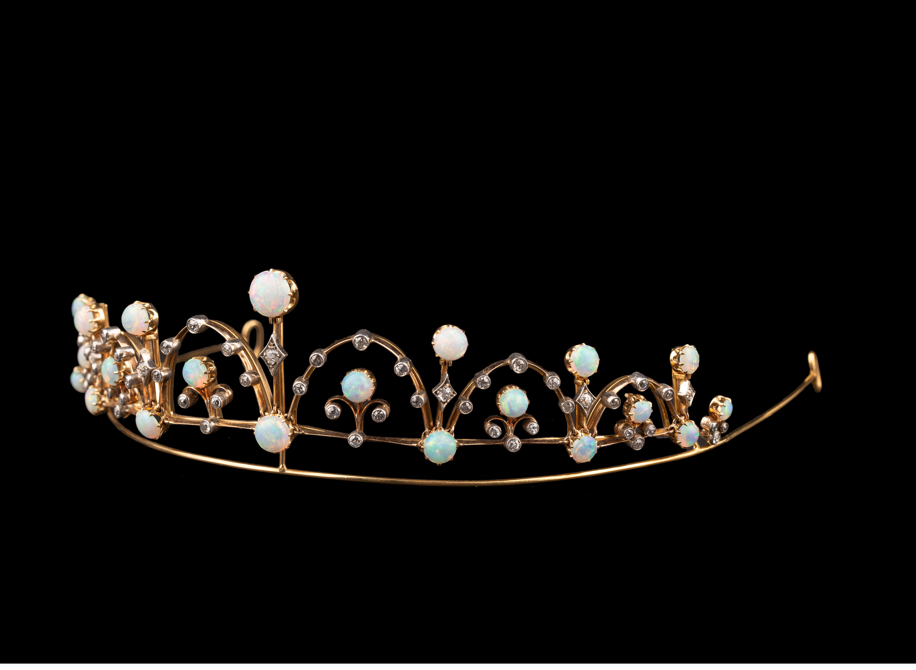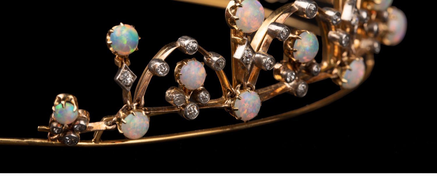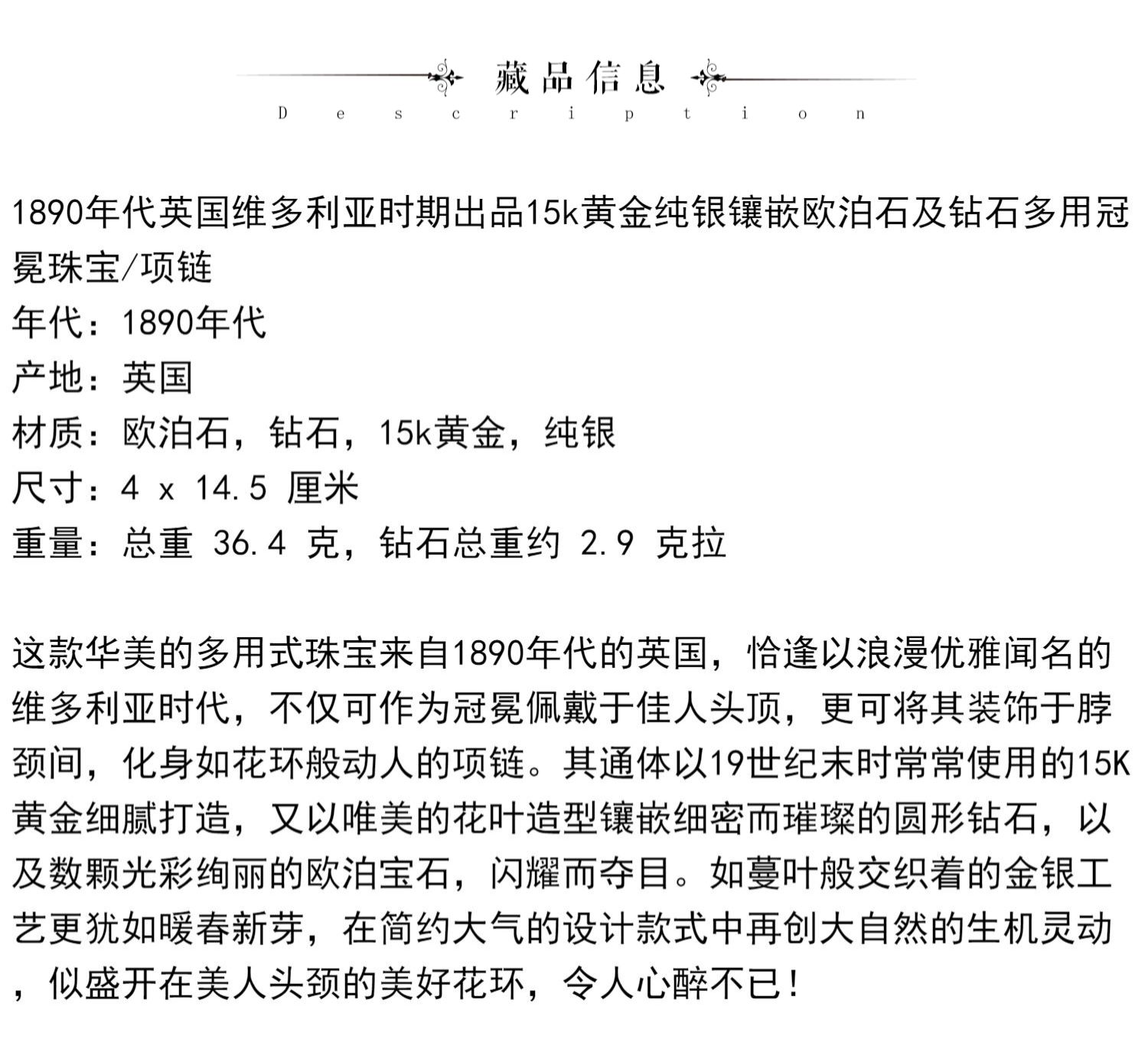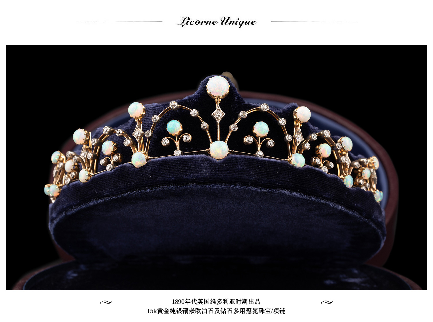独角鹿西洋古董维多利亚时期15K黄金纯银镶嵌欧泊钻石冠冕项链
