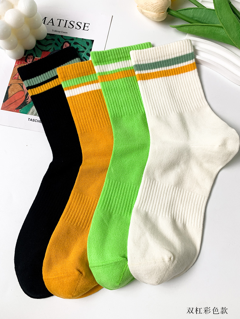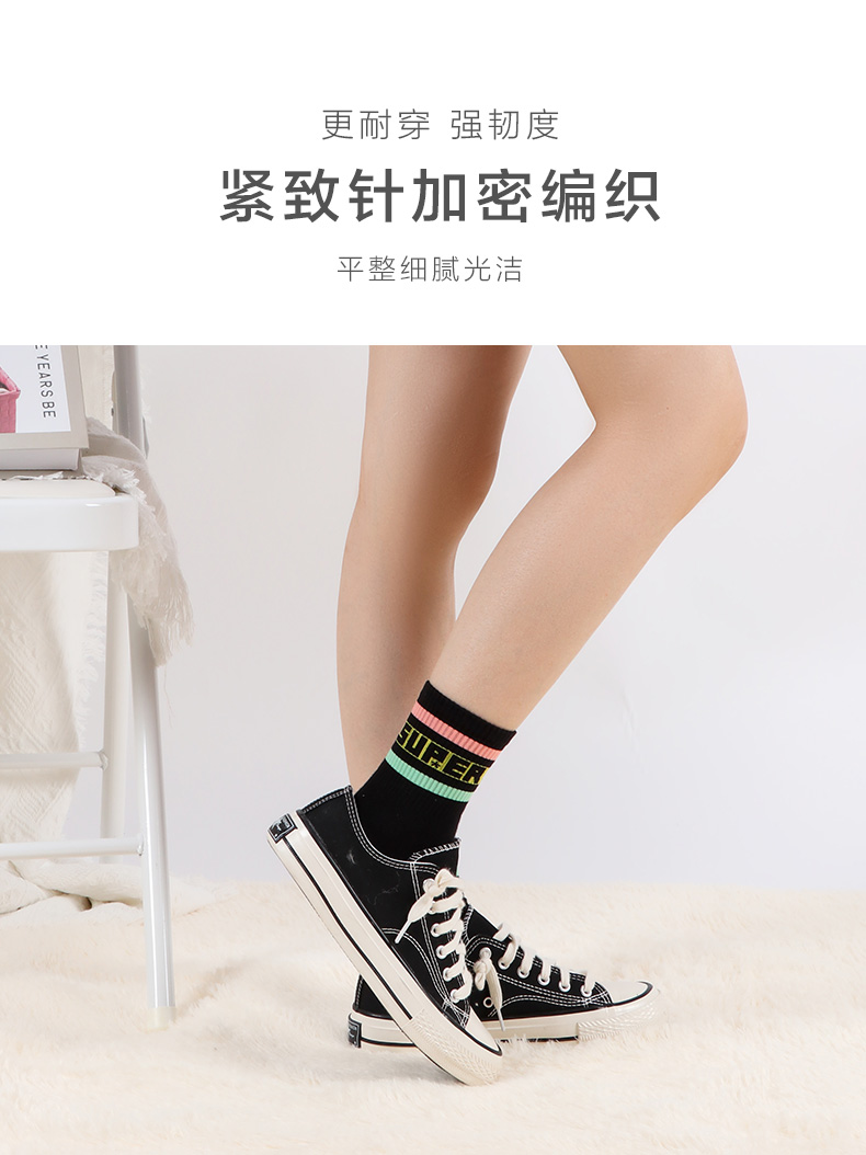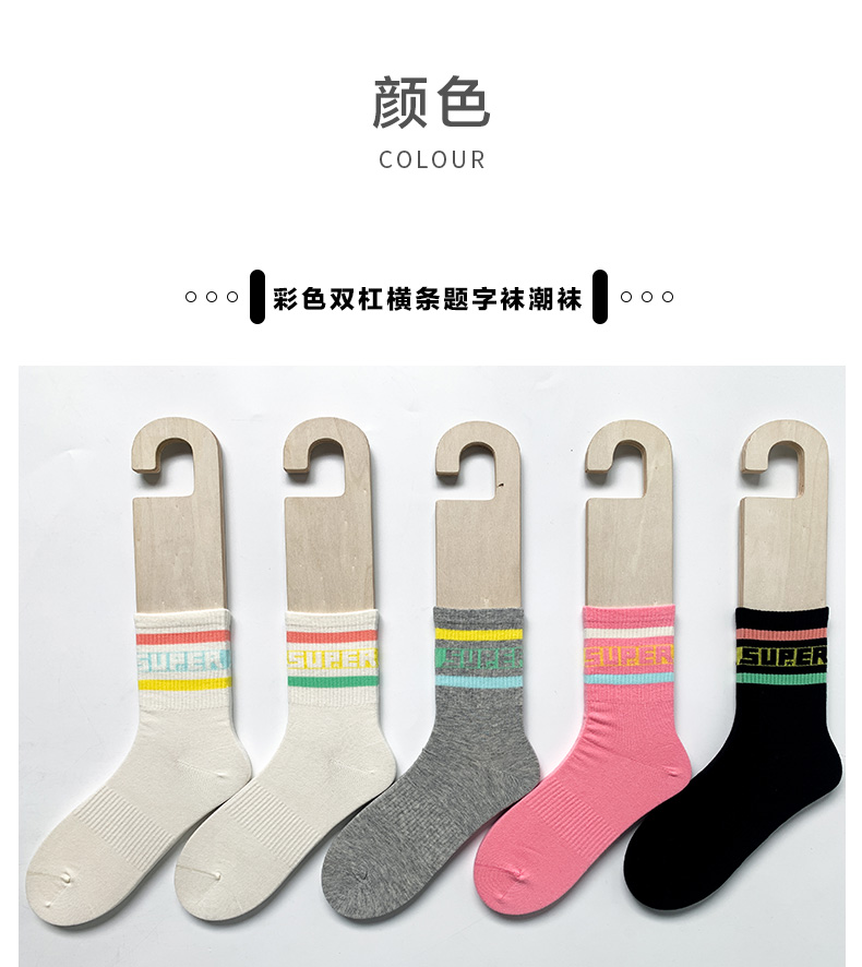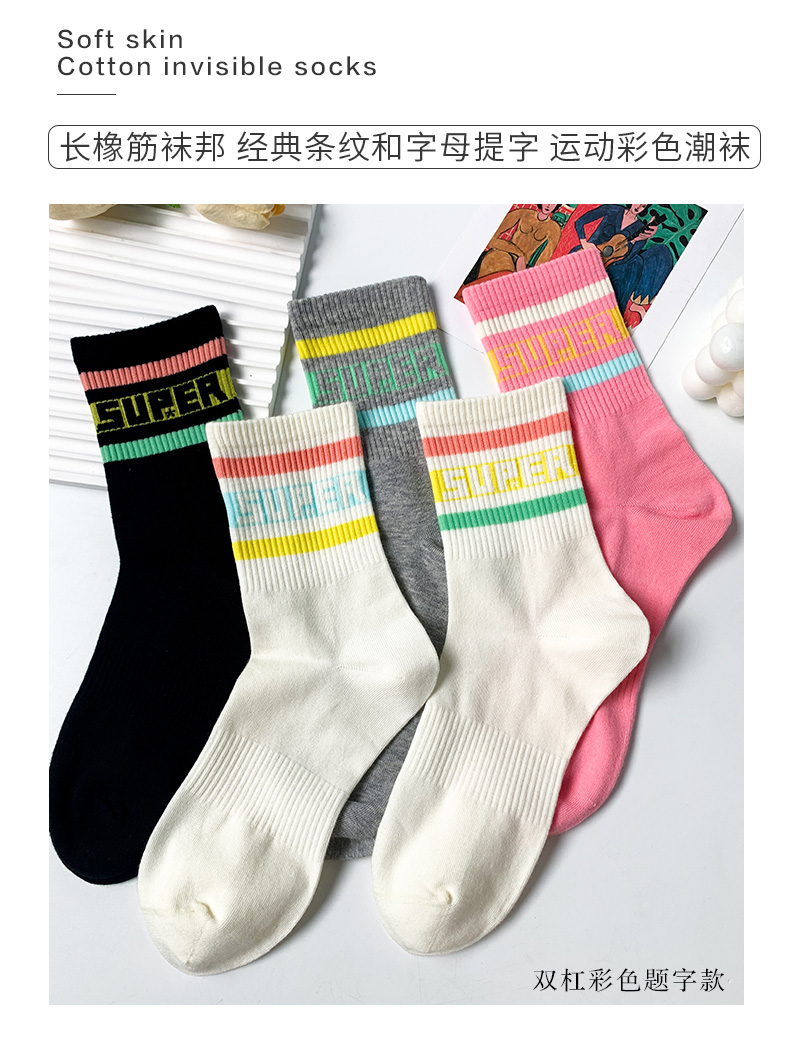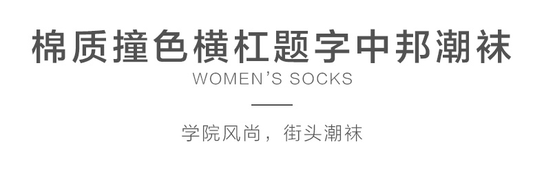 24春夏新品女士中筒棉质学院风街头运动横杠字母中邦女袜