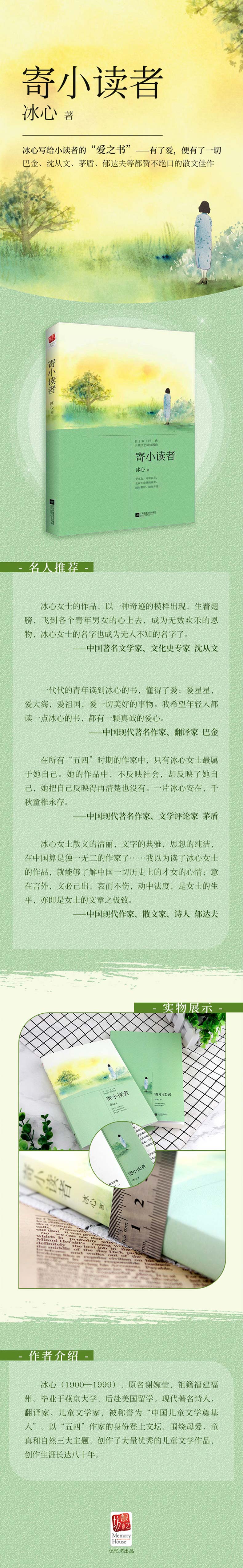 《寄小读者》是冰心的散文代表作,收录了三部“寄小读者”的全部通讯,以首部命名,以和小朋友谈天的亲切口吻,讲述其在国内外留学、旅行、考察的所见所感,表达了她对家人与祖国的思念、对母爱和自然的赞美、对中国小读者始终如一的关爱,读来让人倍感亲切、获益匪浅。同时,更收录了《山中杂记》等经典的散文作品,让读者更好地体会到冰心“爱的哲学”。