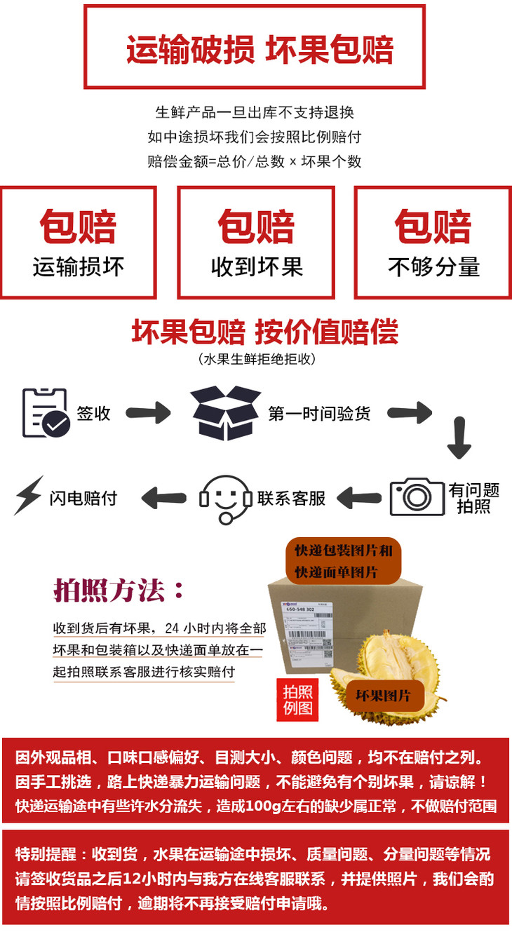 发货后不可退单,收到快递先检查,如有压坏变质坏果挑出来和快递面单一同拍照,签收超过24小时不售后