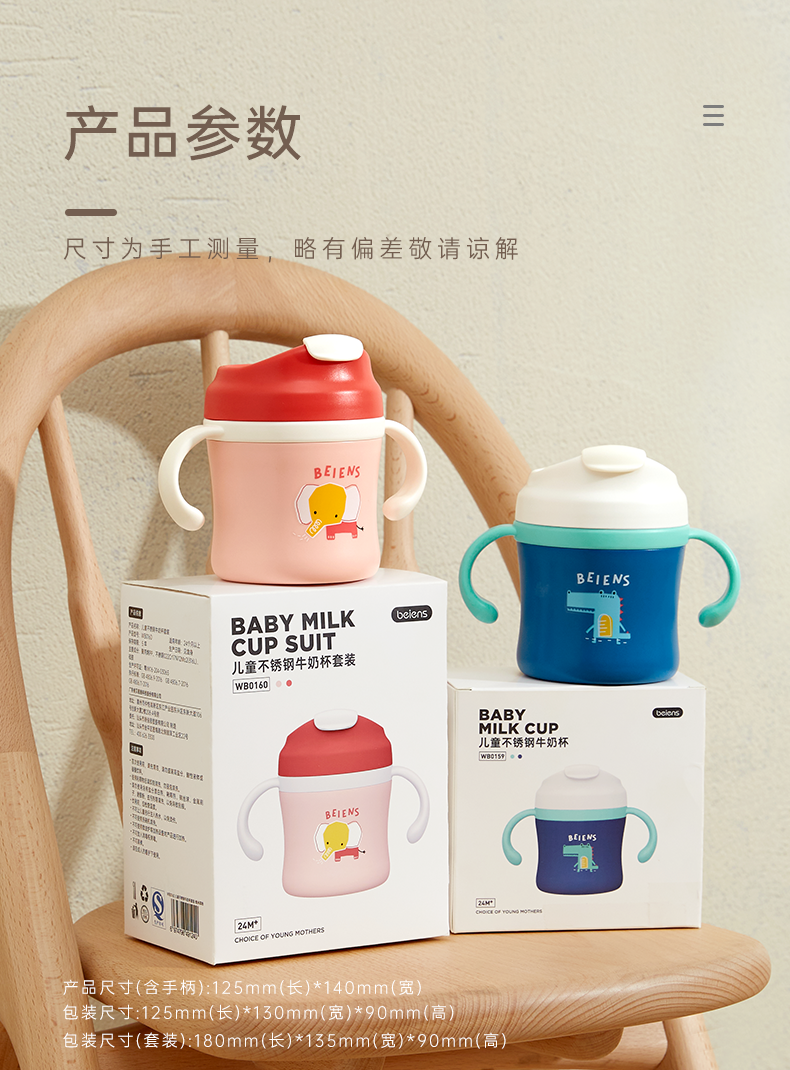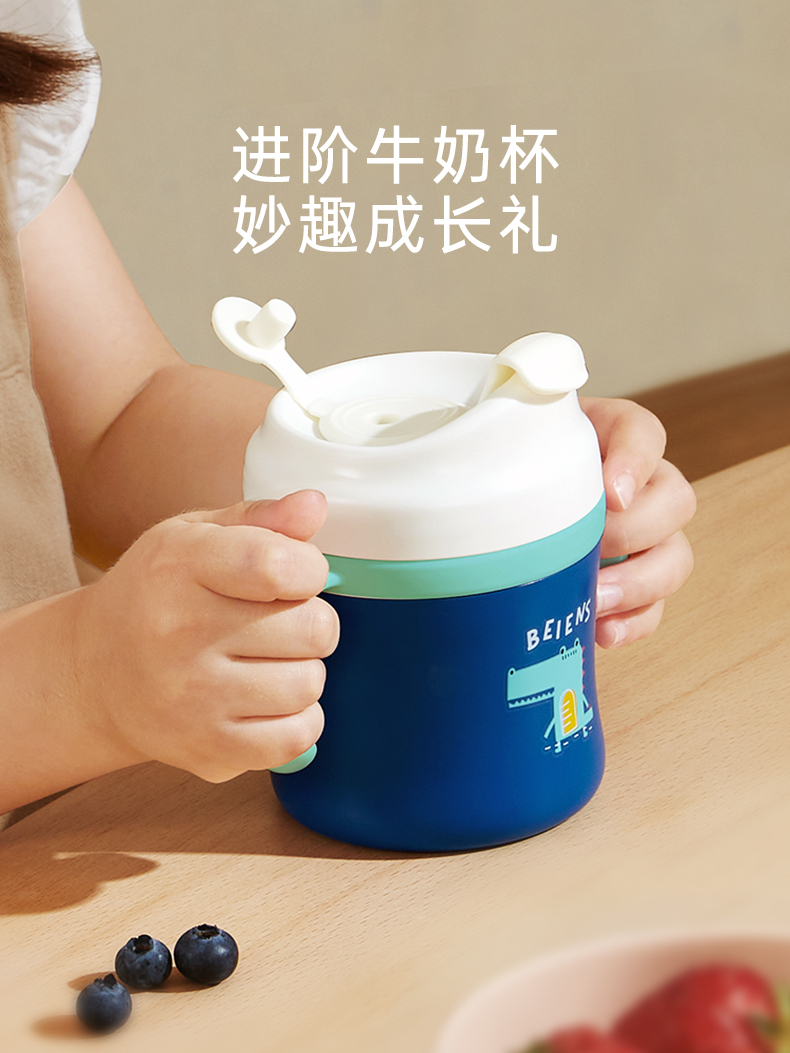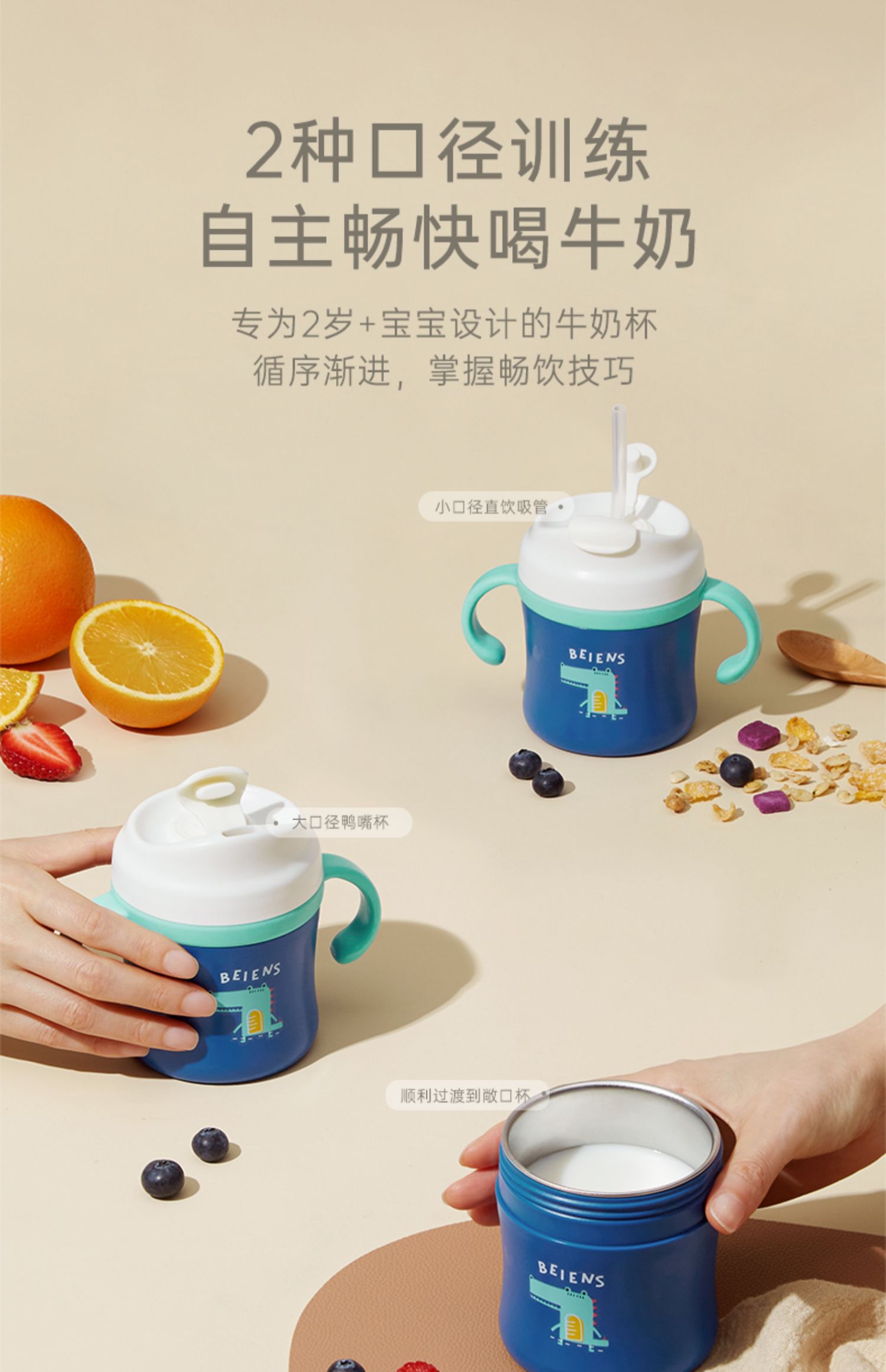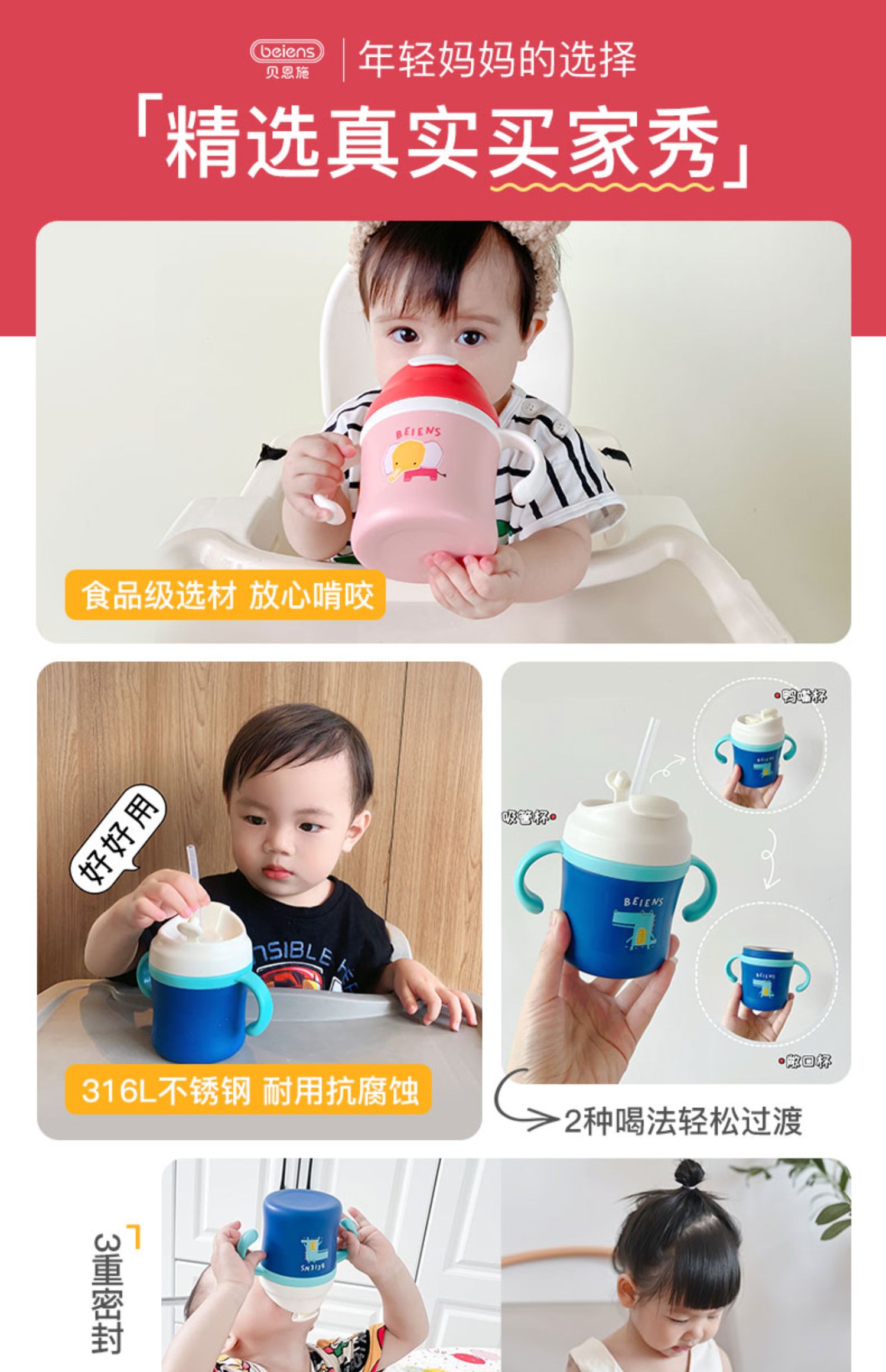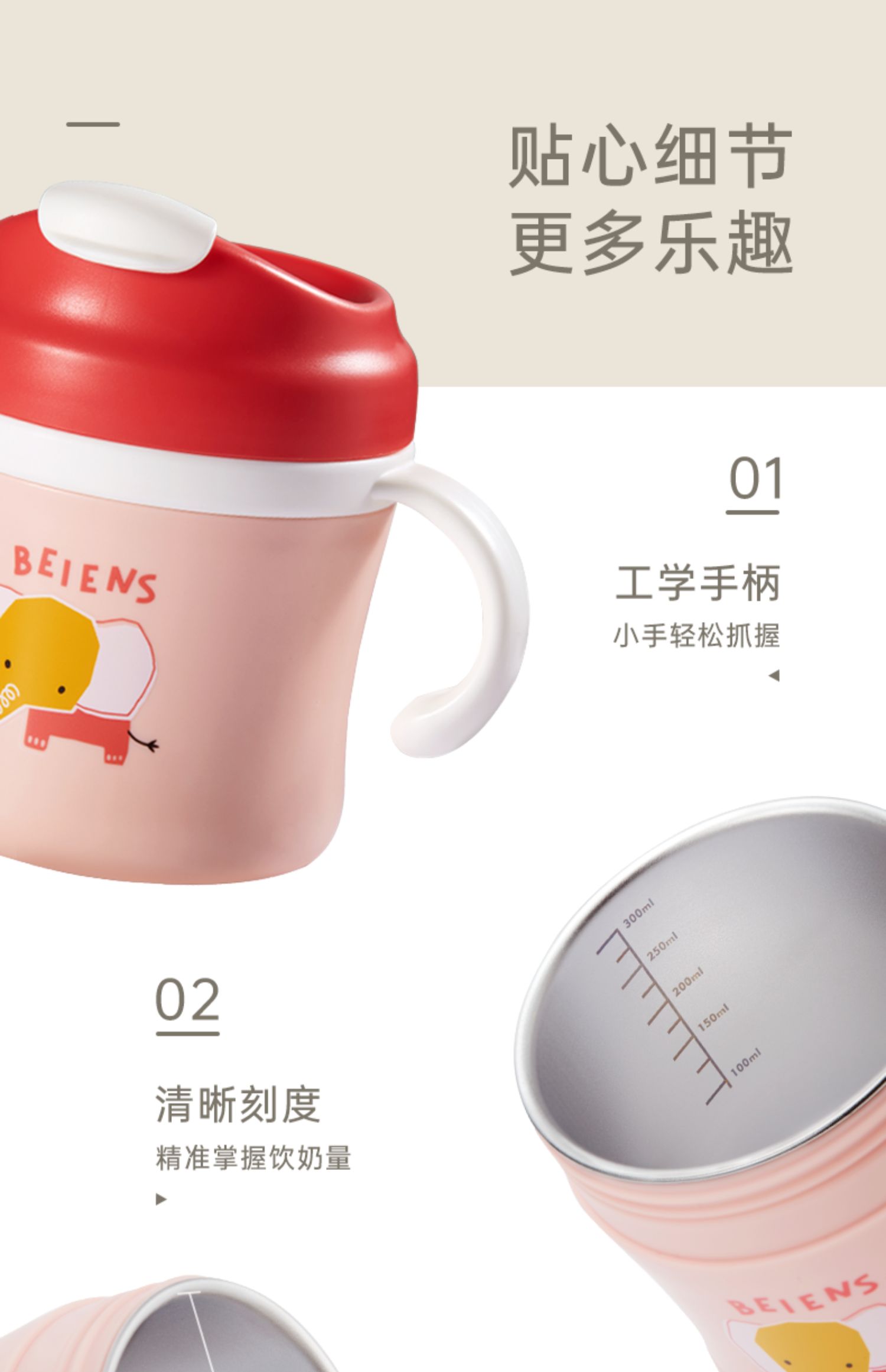 贝恩施牛奶杯儿童带刻度不锈钢防摔直饮吸管杯宝宝喝奶喝水学饮杯