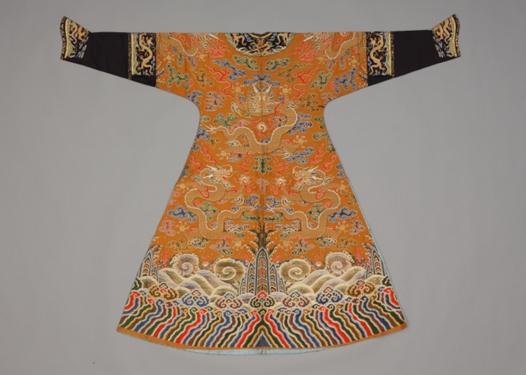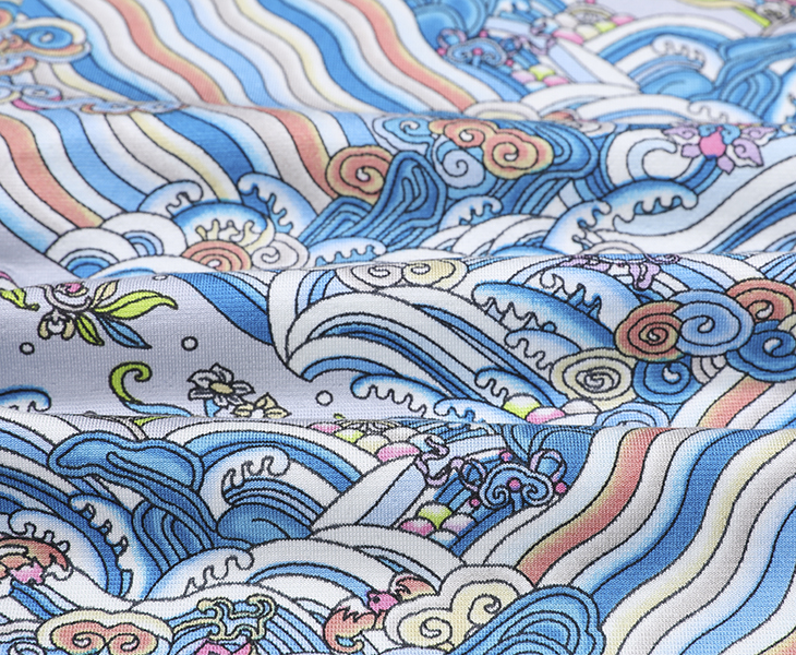 [海水江崖]取自中国最传统的清代皇室家族服装中下底摆海水江崖图案,顾名思义,海水象征着大江大河,在海水纹的中间,耸立着山石。 江水和山石组合,象征"江山"。因此构成真龙天子主宰江山社稷的寓意画面。