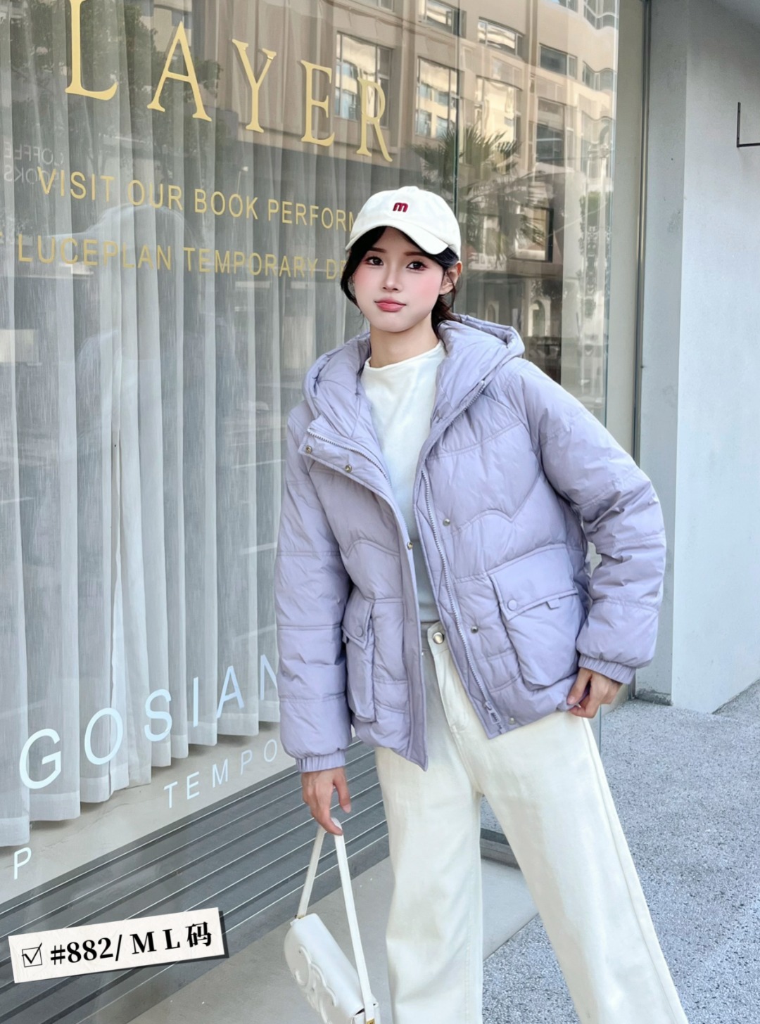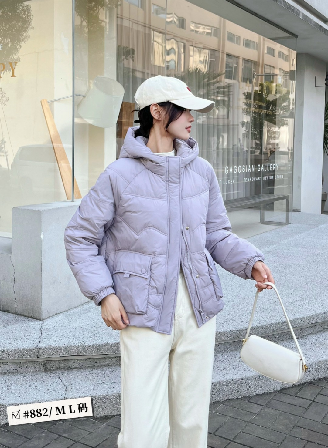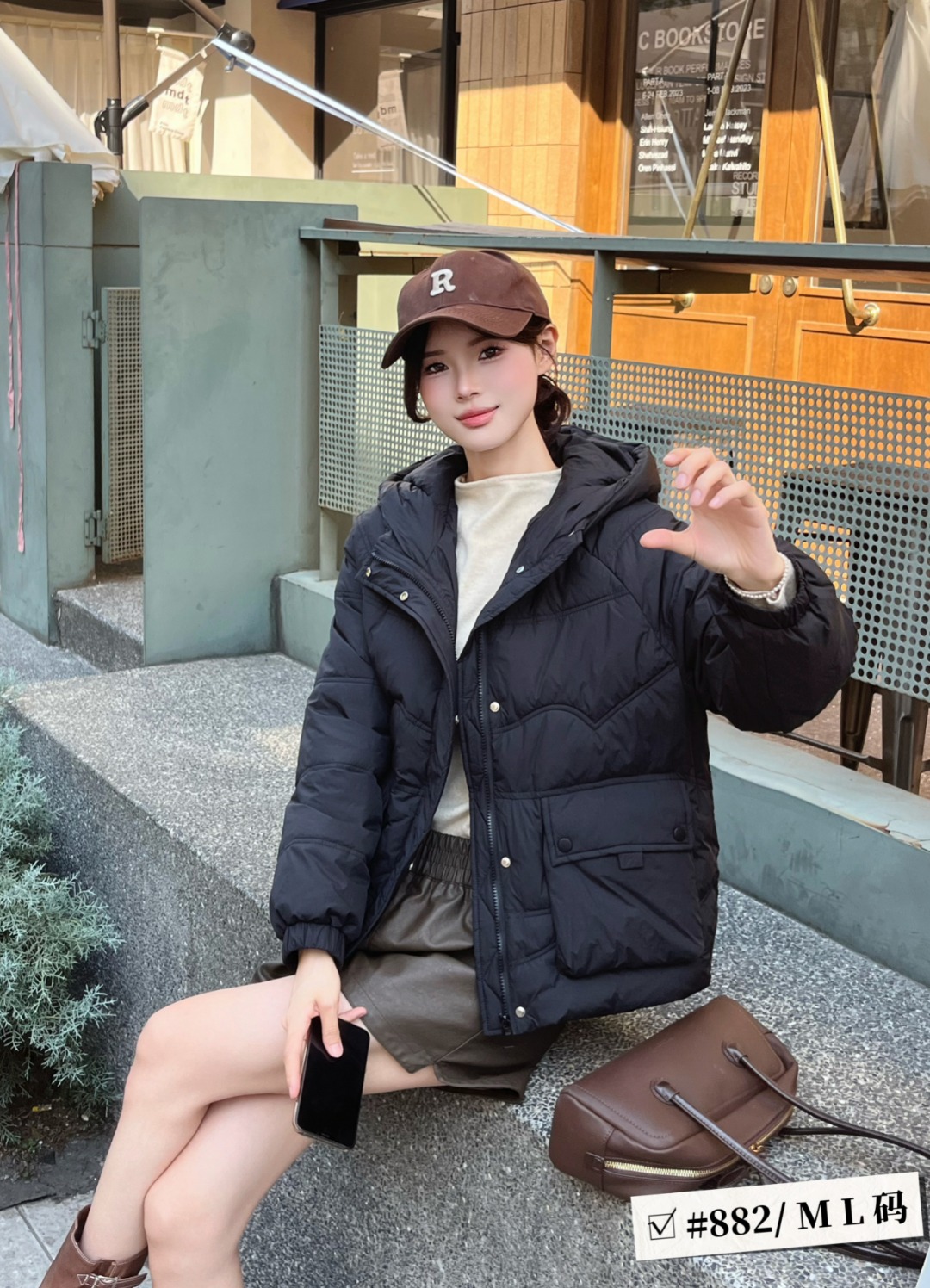 882# 新款休闲羽绒棉连帽外套 连帽防风的短款的版型,下半身随便搭配下装就贼显腿长,满足时髦与温暖兼备的宝藏单品