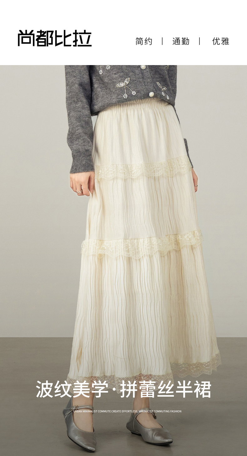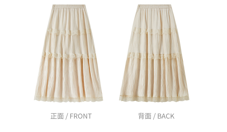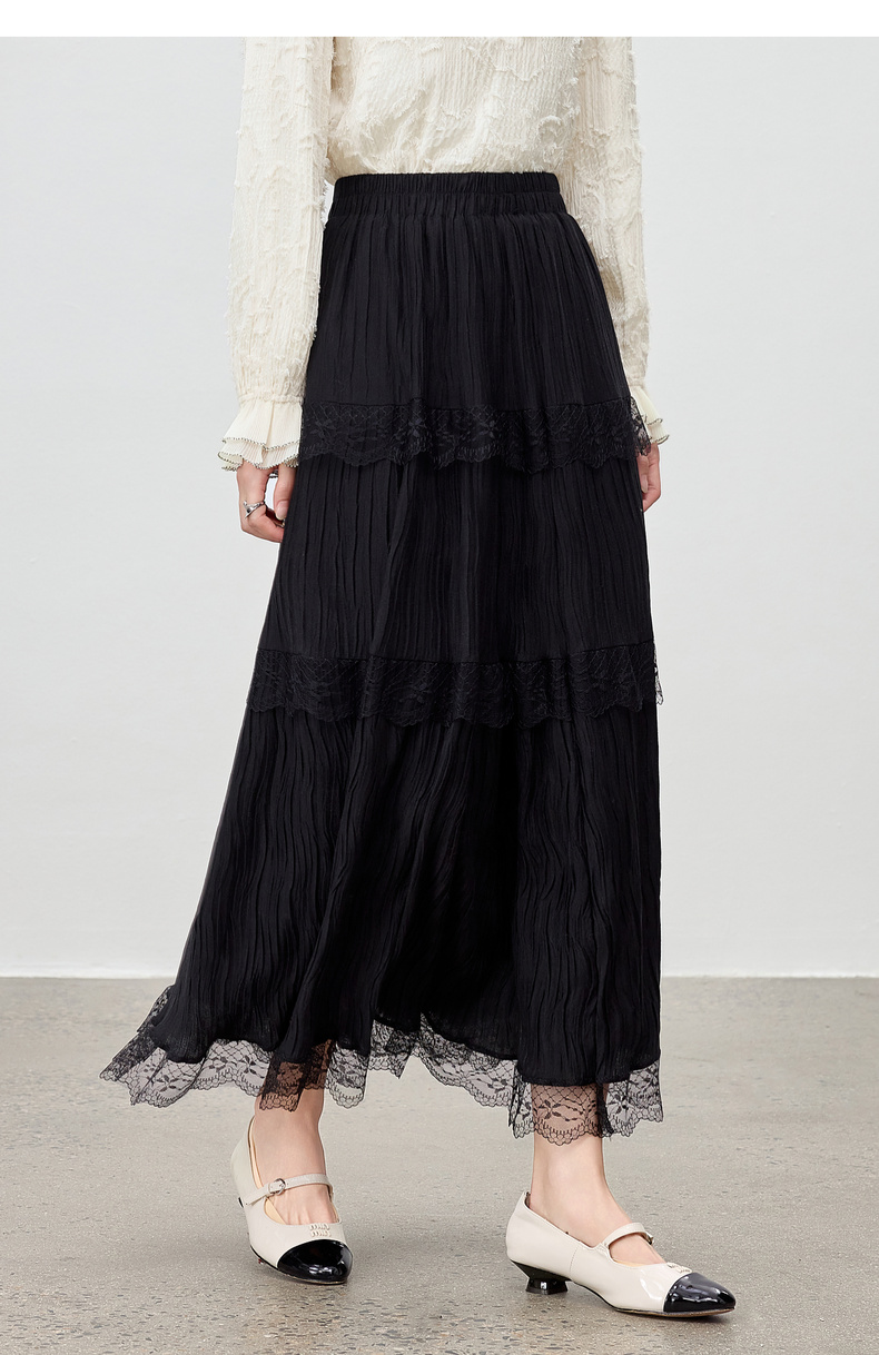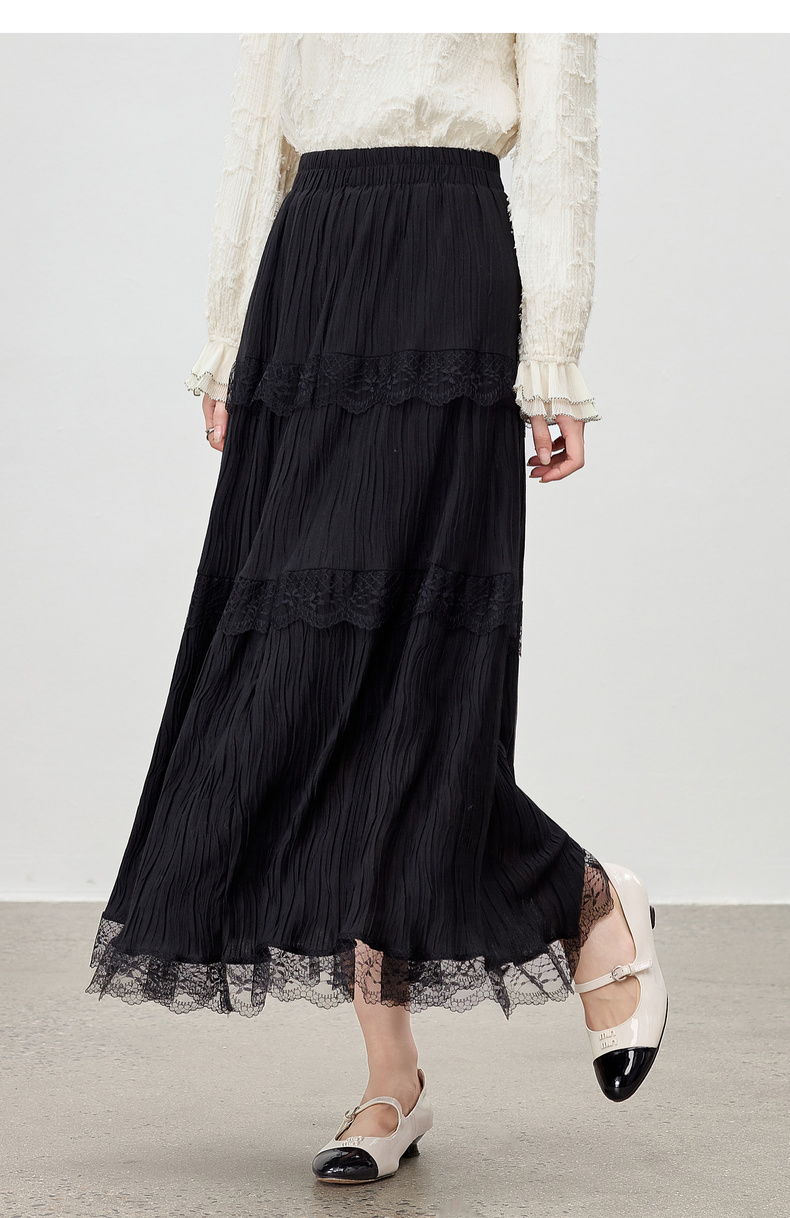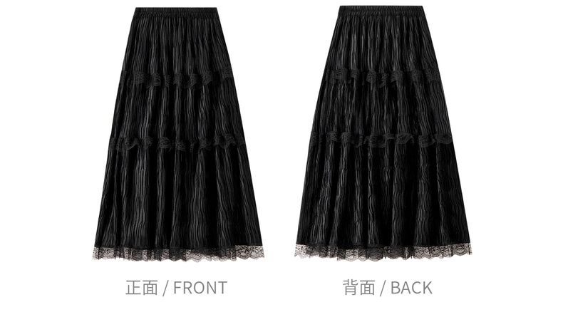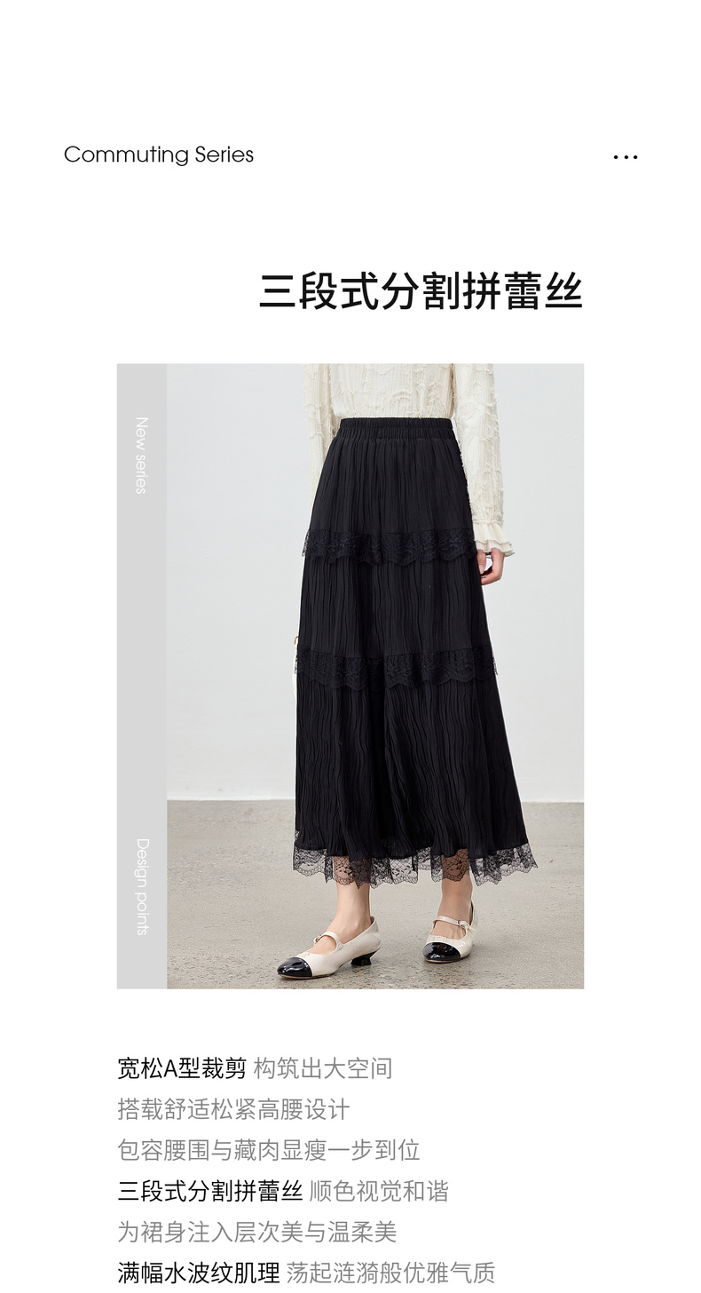 【内购】【遮肉显瘦】通勤松紧高腰三段式分割拼蕾丝丝绒长款A字半身裙-W54QA4115