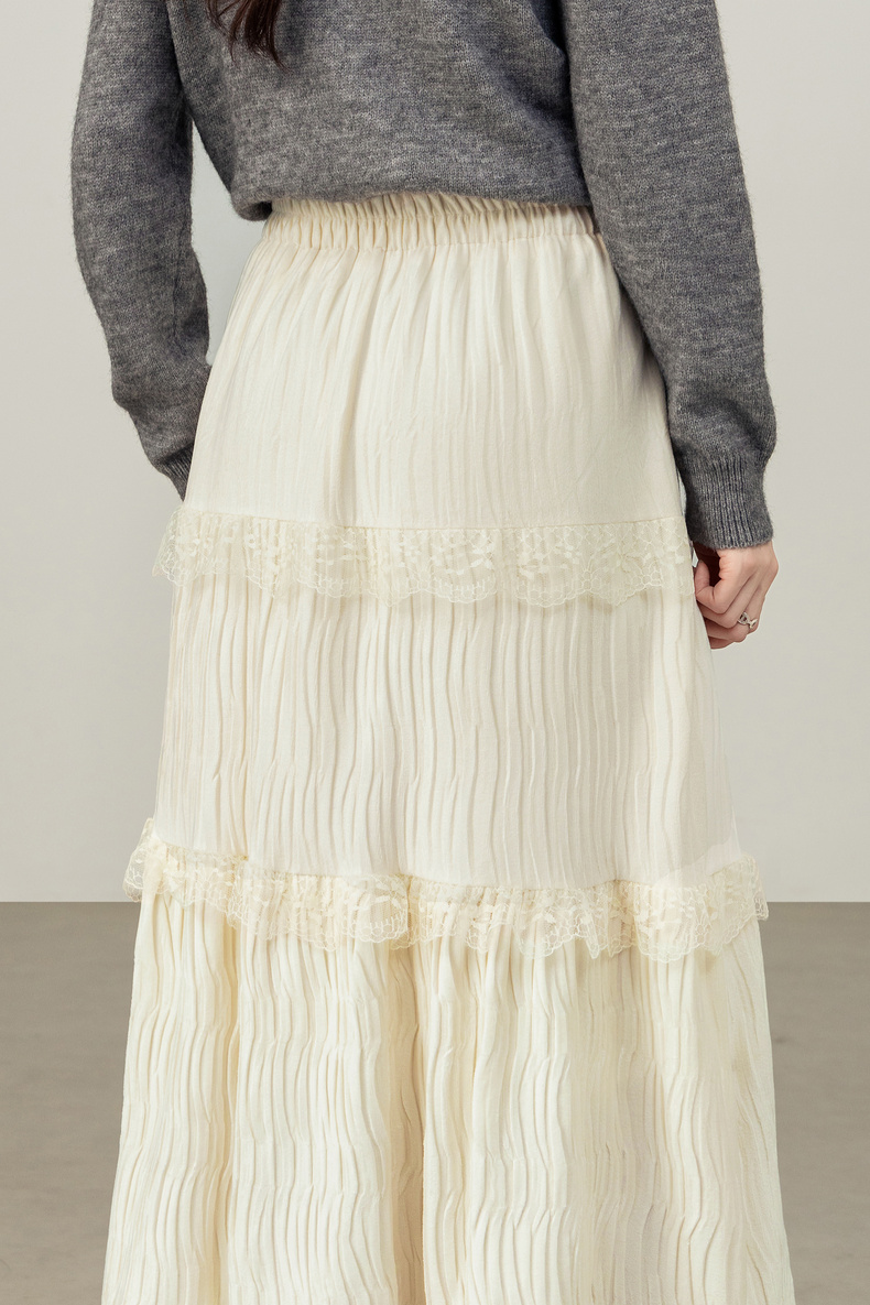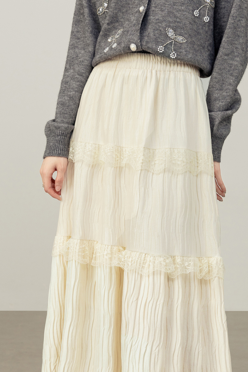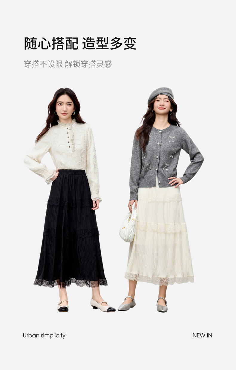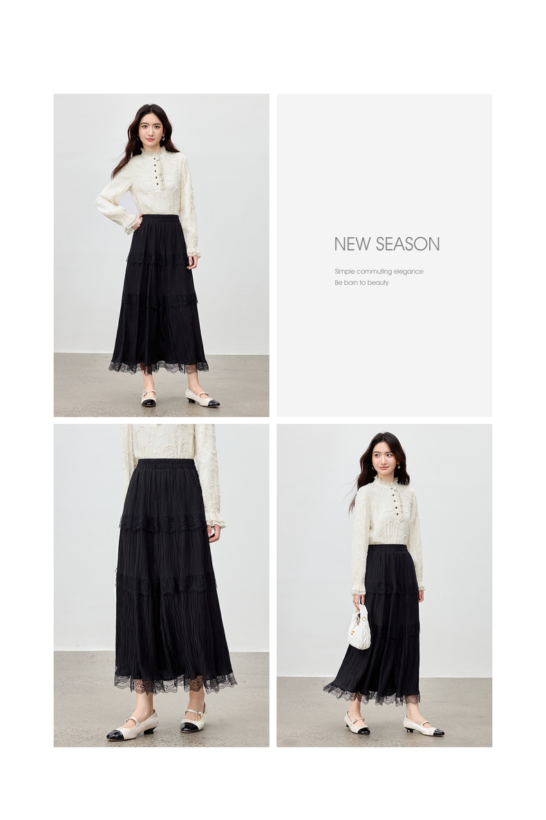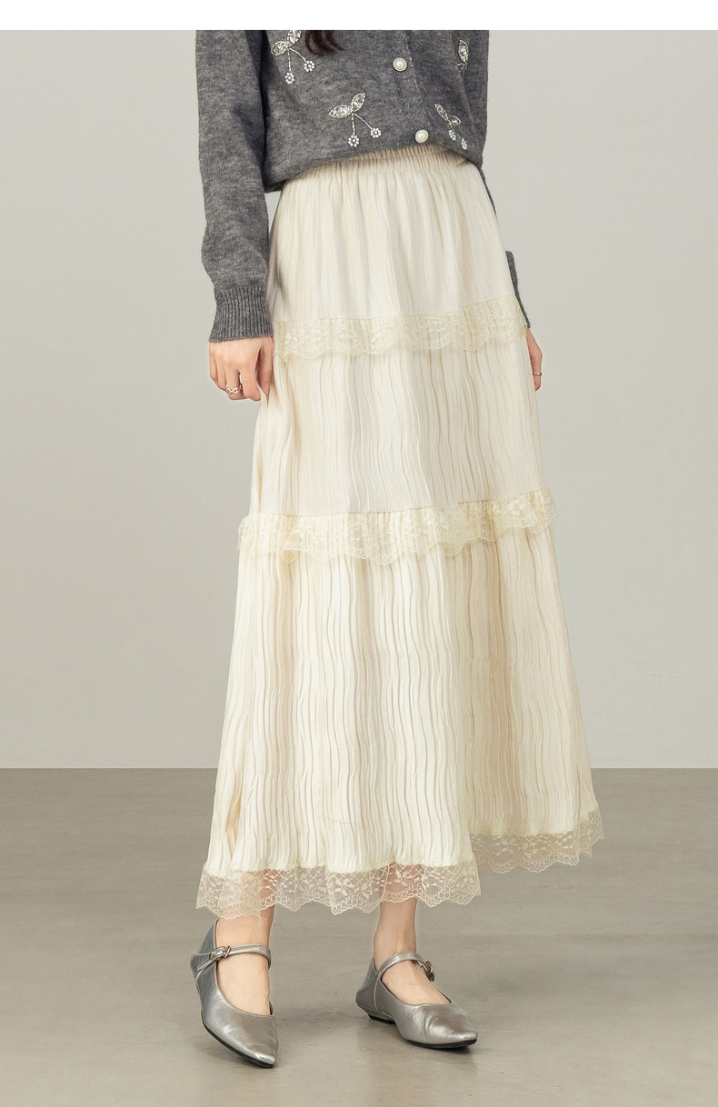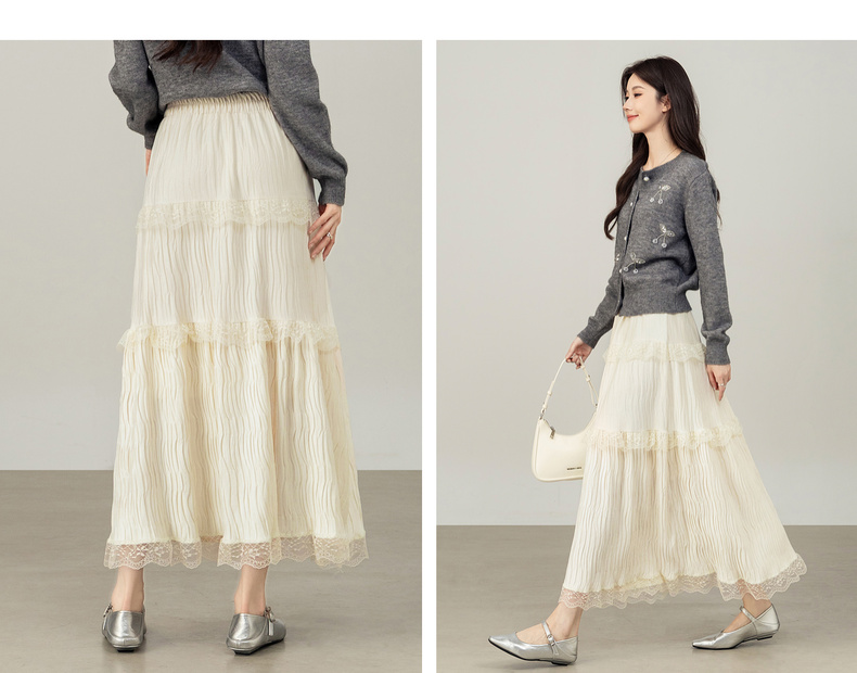 【内购】【遮肉显瘦】通勤松紧高腰三段式分割拼蕾丝丝绒长款A字半身裙-W54QA4115