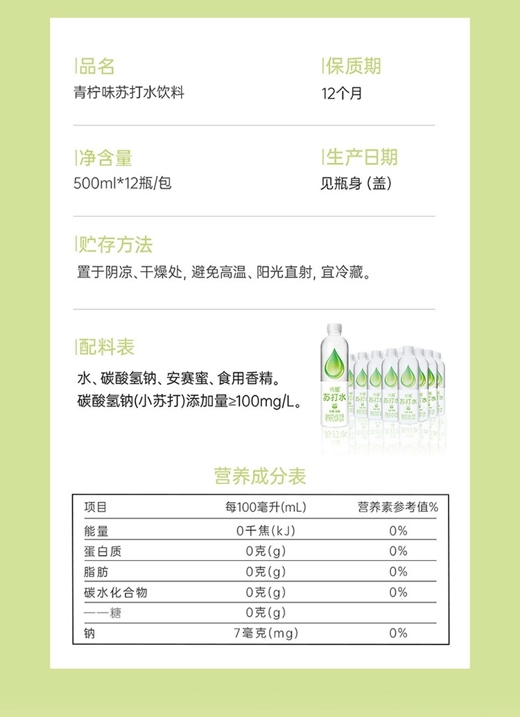 依能青柠味苏打水饮料/1提(500ml*12瓶)生产日期:26年3月