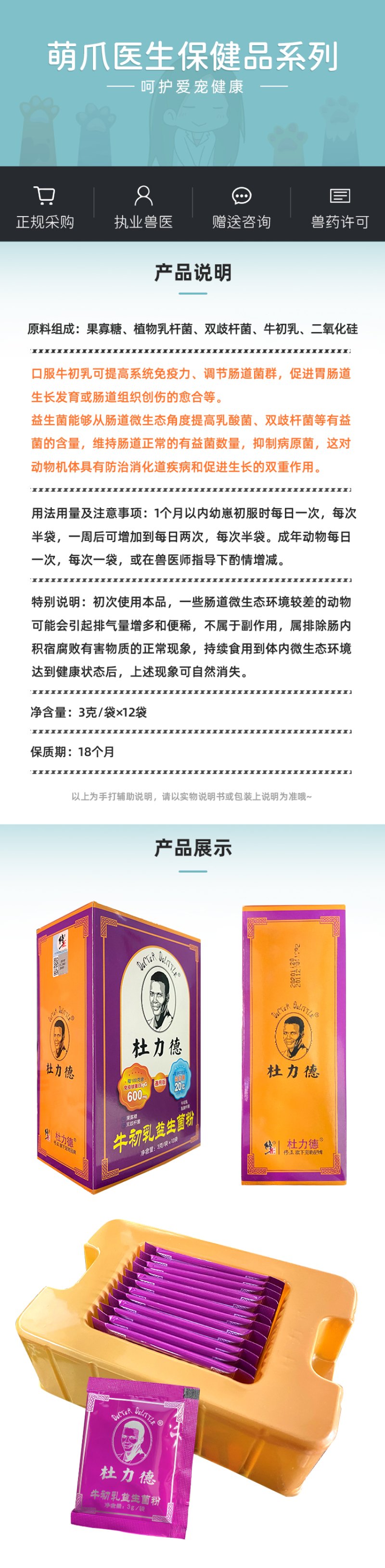 杜力德 宠物牛初乳益生菌 乳铁蛋白提高免疫 猫狗通用 3g*12