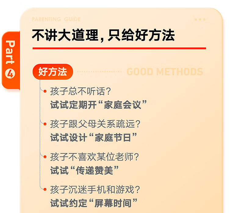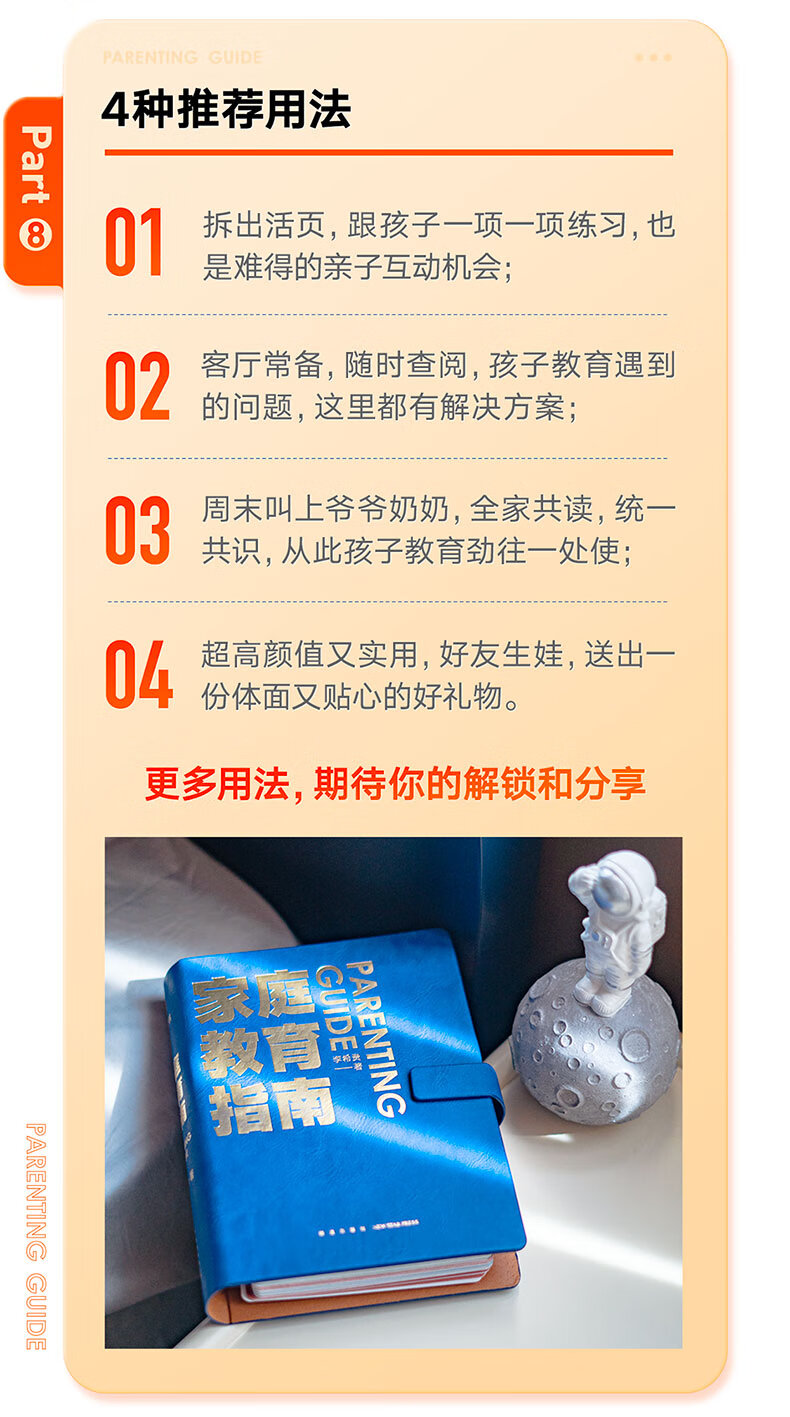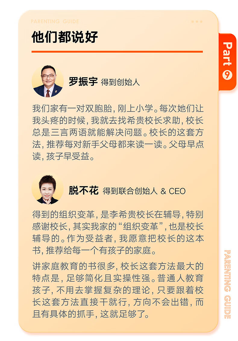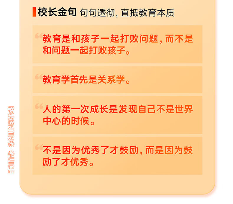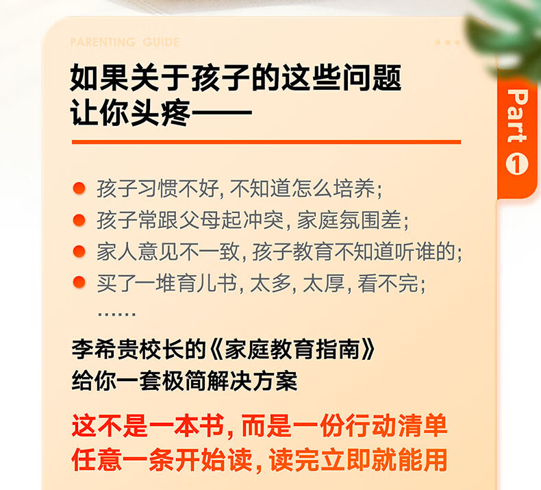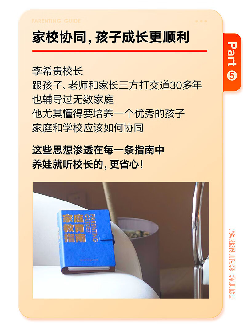 本书通过轻松简洁的文字、简单好操作的指南,从社会情感和思维能力两个维度出发,手把手教家长们如何培养全面发展的孩子。 在数十年的教育生涯中,李希贵校长不断收到家长们提出的各种各样的问题,他深知家庭教育的痛点所在,也深知家长们自我成长的困难。 传统的家庭教育方法需要家长们学习各种教育理念,把自己先变成教育专家,然后才能教育孩子,这让家长们望而生畏。 因此,李希贵校长将自己多年积累的丰富经验凝聚成了这套精美的家庭教育指南。它可以放在家中任何一个地方,比如茶几上、餐桌上,供家长们随手翻看、查阅。 书稿包括54条指南——10条原则,24种方法,10项任务,10个工具,以及“入学准备清单”“幼儿期常见问题”“经济学素养里程碑”等附录内容, 家长们可以任意翻开一页,不需要长篇累牍地阅读理解,只需要按照上面的内容操练起来。只要有了一个开始,就可以立即在自己或者孩子身上看到效果。