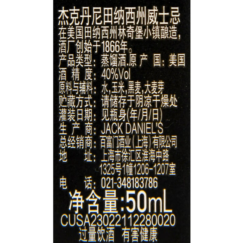 杰克丹尼田纳西州威士忌 40%vol 50ml/瓶