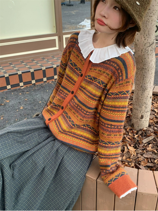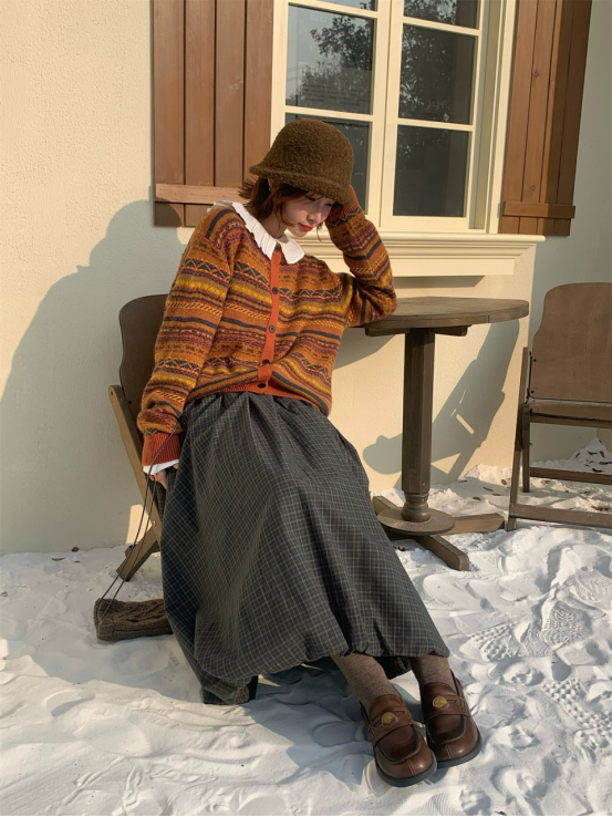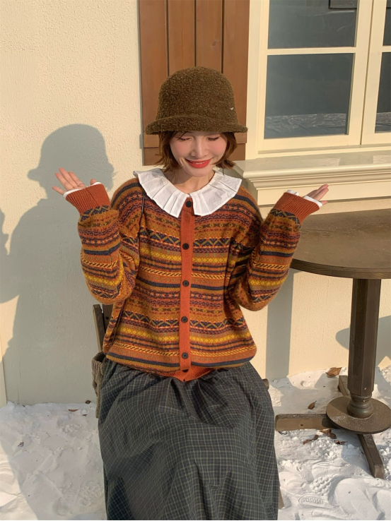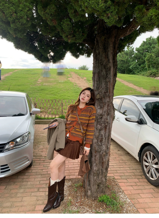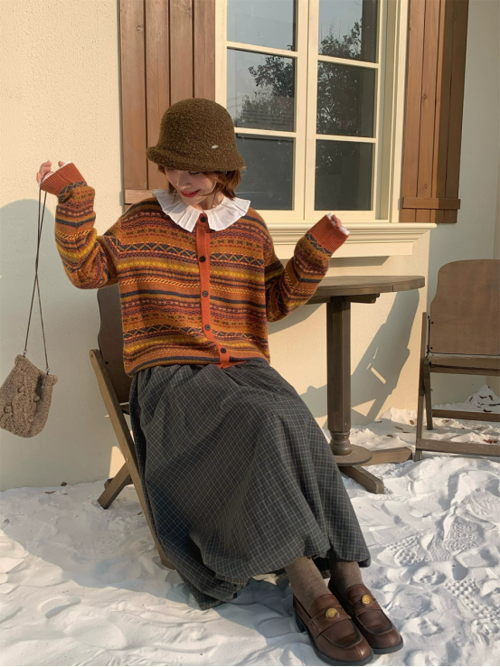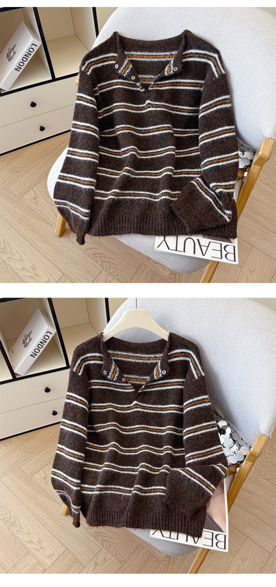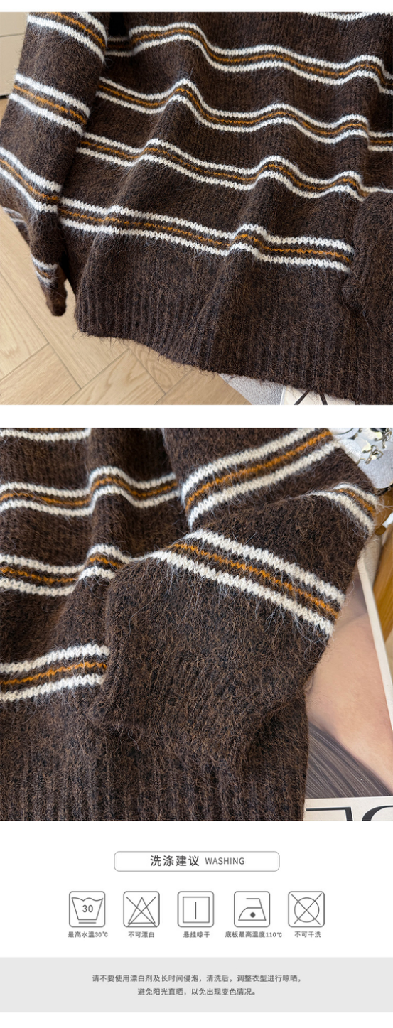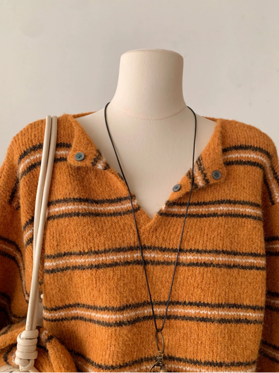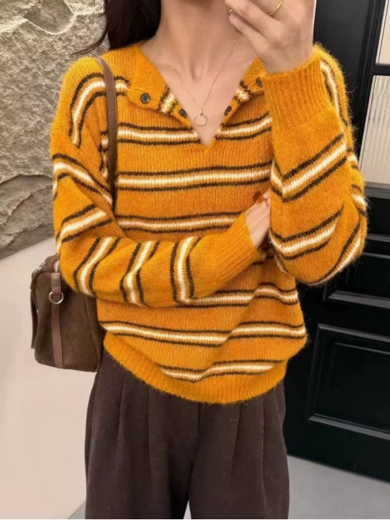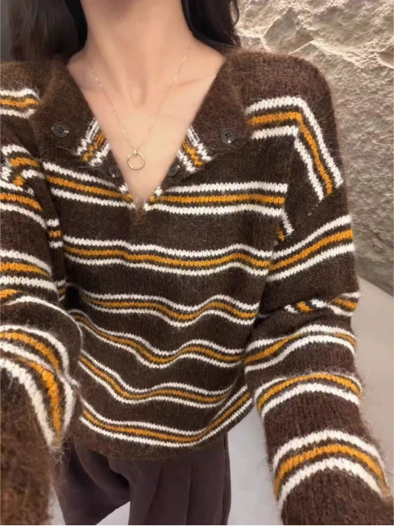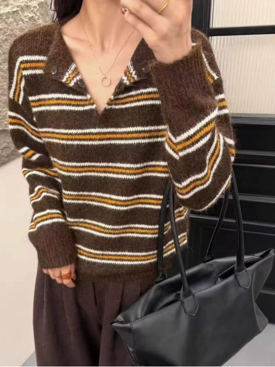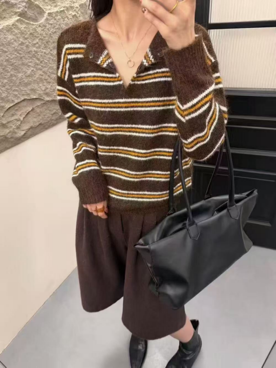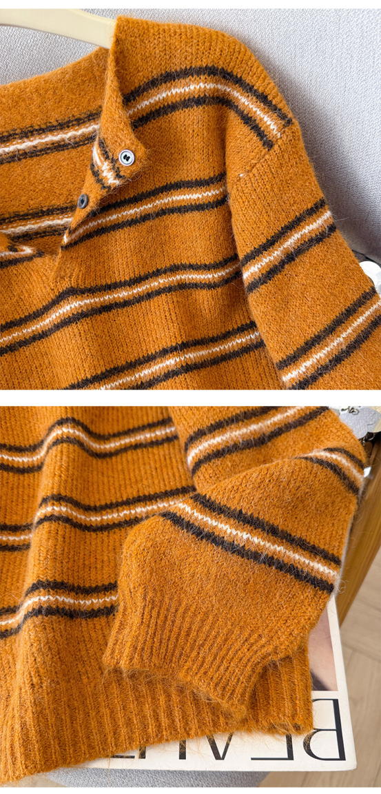 ② 品名:浣熊绒条纹半开领套头220 货号:220 颜色:咖色,橘色 尺码:M-XL 材质:14%羊毛 锦纶31.7% 晴纶23% 聚酯纤维21.3% 浣熊绒”并非指成分,而是对标其绒毛丰盈、蓬松柔软的独特质感。我们通过精心的混纺工艺,力求让每一根纤维都充满空气感,打造出如同拥抱毛绒玩具般温暖、治愈且极具安全感的穿着体验。 半开领设计:复古别致,穿脱方便,修饰脖颈。 “别致的『半开领』 是整件毛衣的点睛之笔。它比圆领更有设计感,比高领更显灵动,方便穿脱的同时,能很好地修饰颈部线条,露出一点锁骨,显瘦又带点不经意的复古优雅。” 经典条纹:简约不简单,打破单调,增添活力。 简约的条纹元素为柔软的质感注入了一丝节奏感与活力,避免了纯色的单调,无论是单穿还是作为内搭,都能轻松提升整体造型的时尚完成度。”