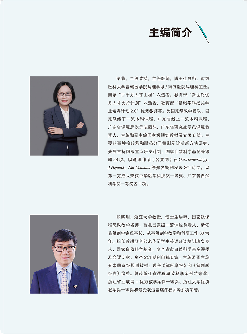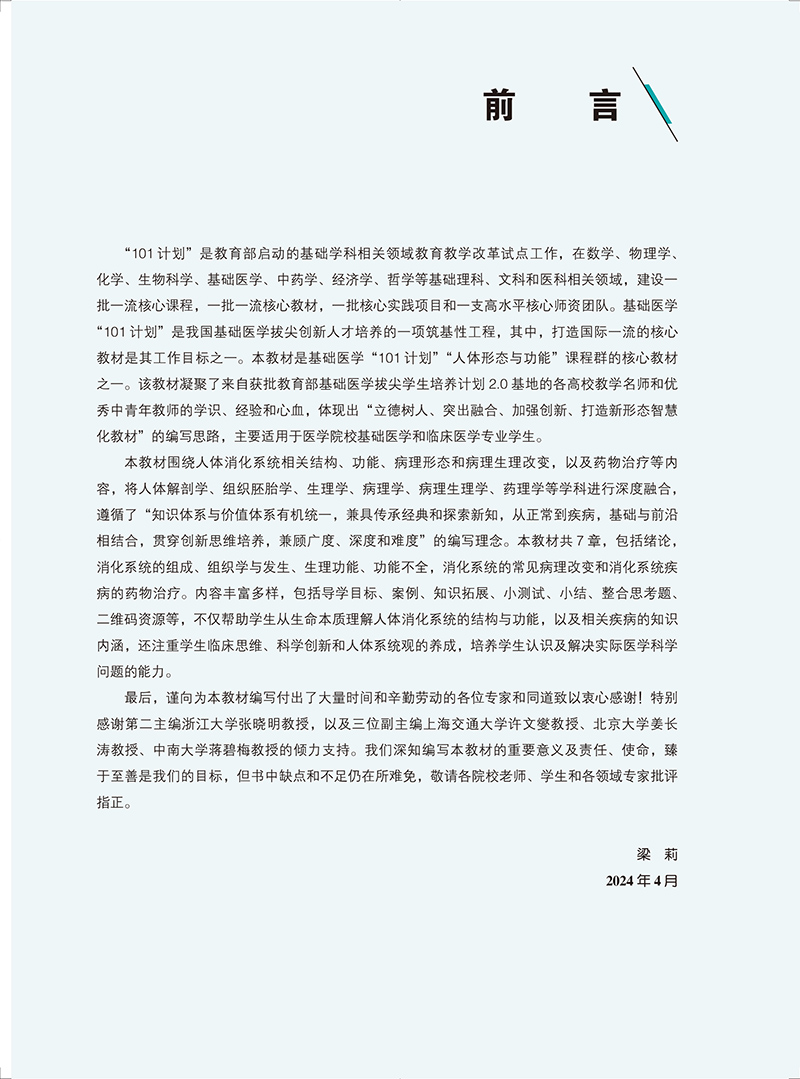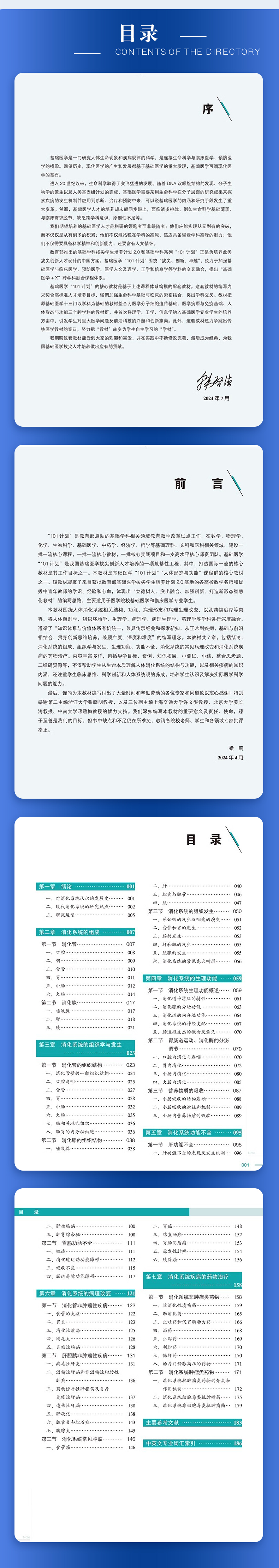 本教材在教育部基础学科系列“101 计划”统一规划下,由来自北京大学、中南大学、南方医科大学、复旦大学、中山大学等10余名专家教授通力合作编写。全书共七章,分别为消化系统绪论消化系统的前世、今生与未来,消化系统的组成,消化系统的组织学与发生,消化系统的生理功能,消化功能不全,消化系统疾病的病理形态学改变,消化系统疾病的药物治疗。围绕人体消化系统相关结构、功能、病理形态改变、病理生理改变和药物治疗等内容,将人体解剖学、组织学、生理学、病理学、病理生理学、药理学等学科进行深度融合。并配备丰富的图片,以及知识拓展框、小测试、整合思考题、数字资源等内容。