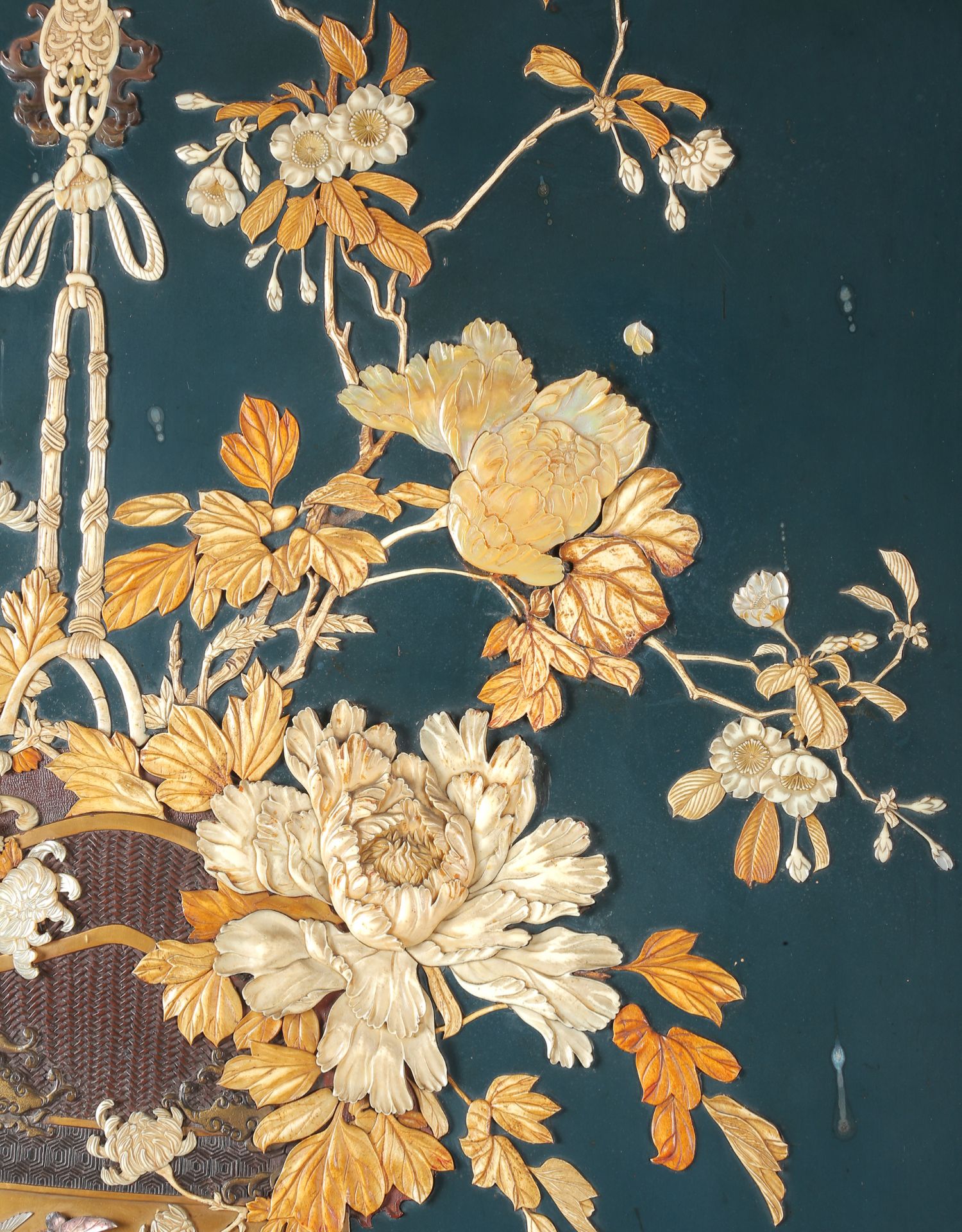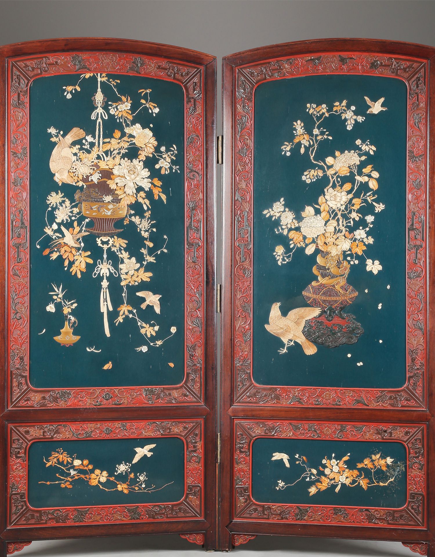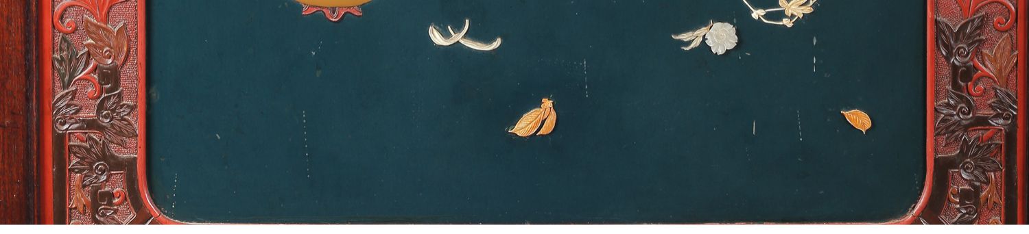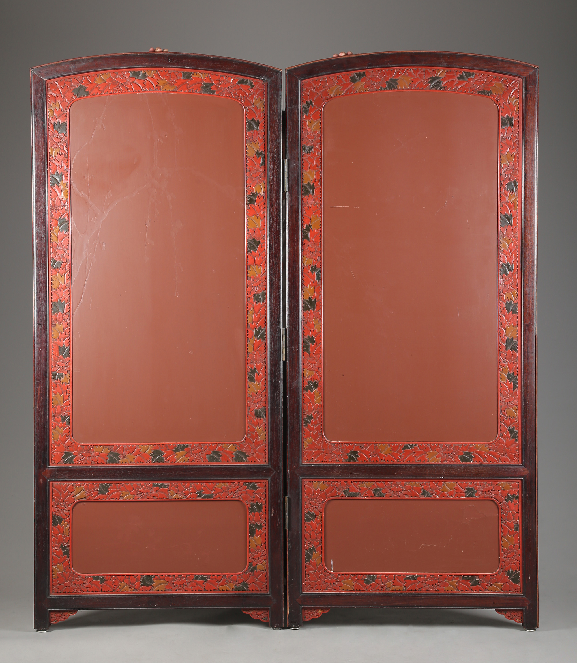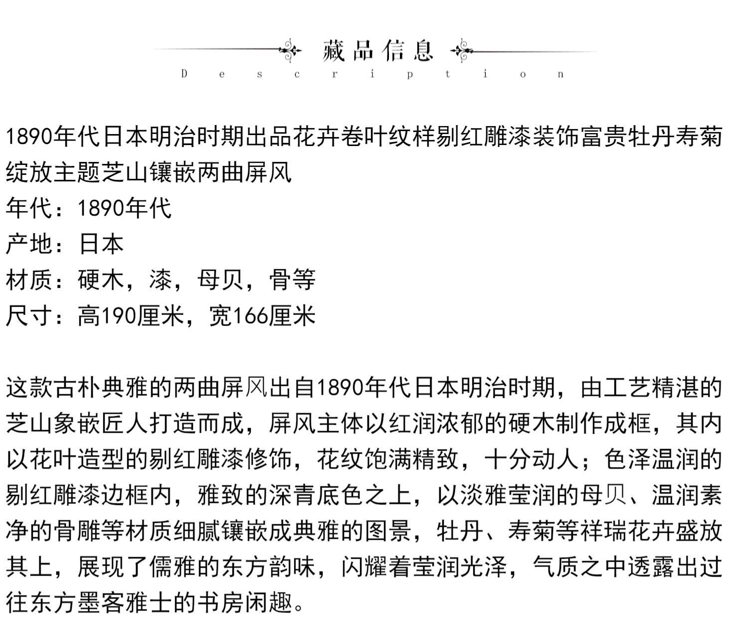 独角鹿西洋古董日本明治时剔红雕漆富贵牡丹寿菊芝山镶嵌两曲屏风