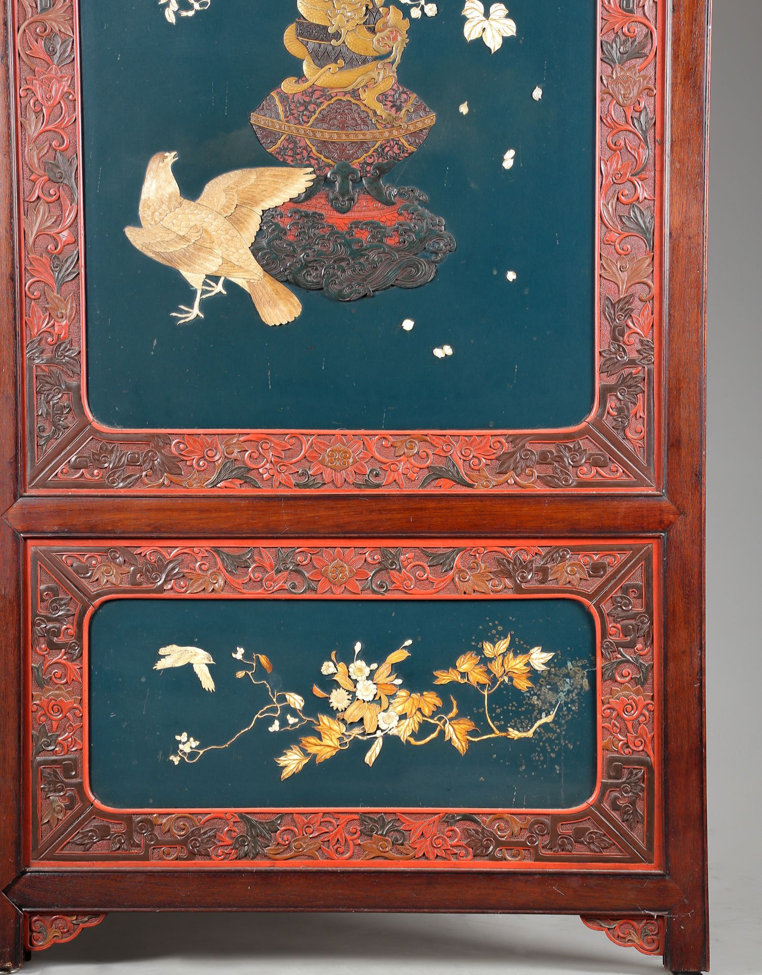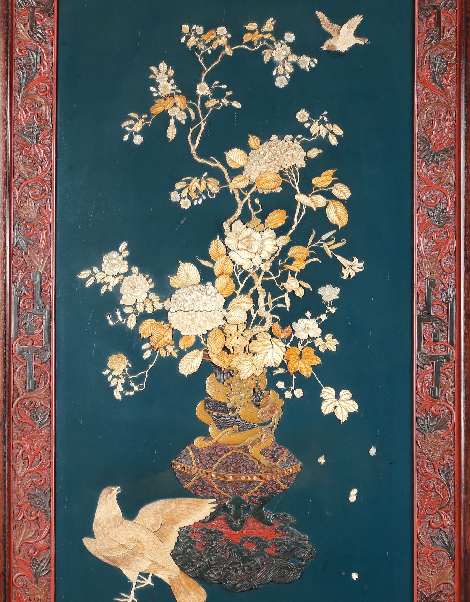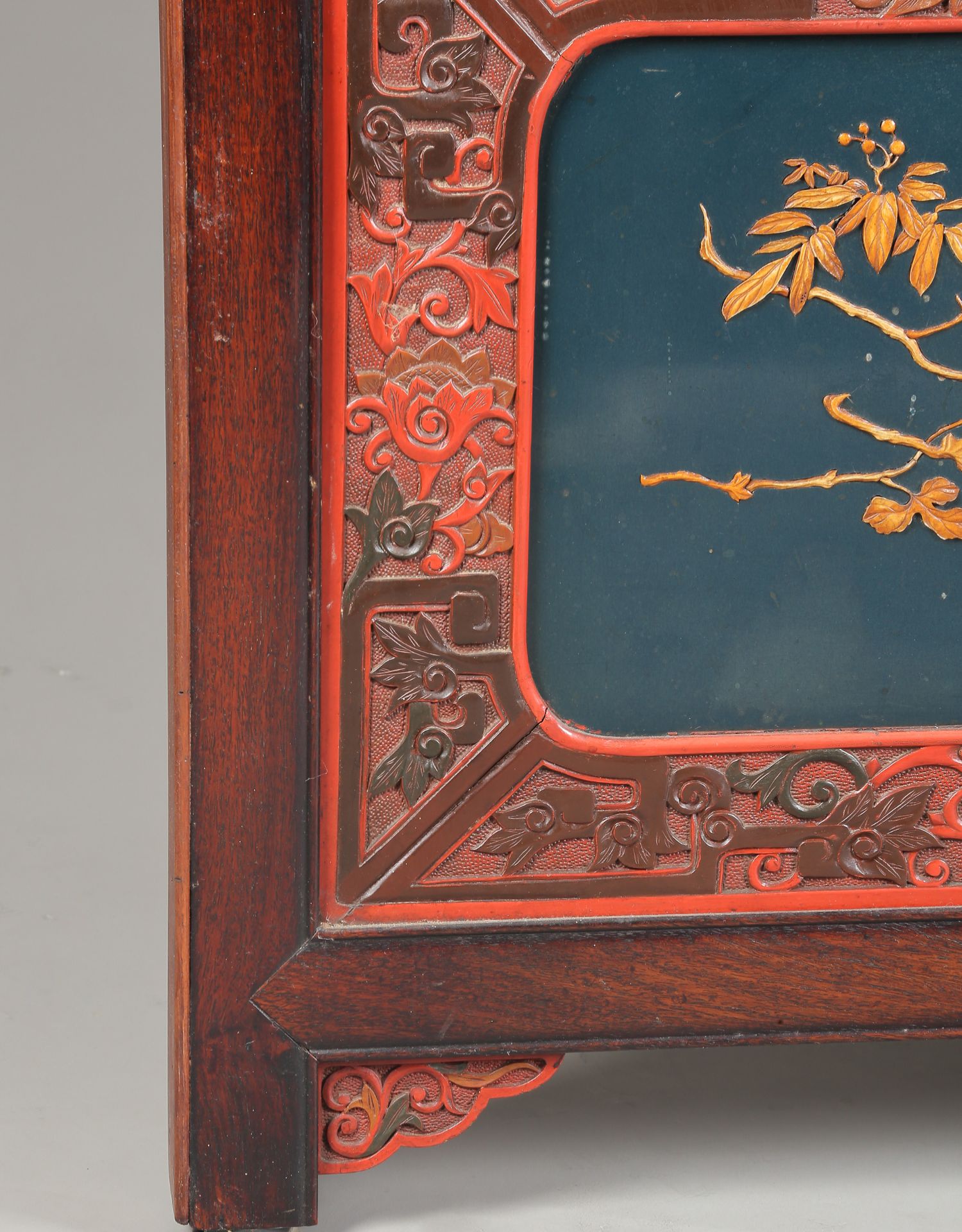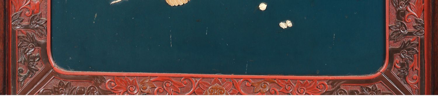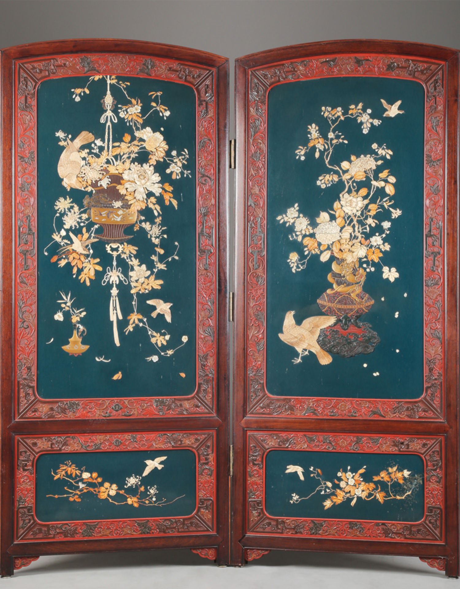 独角鹿西洋古董日本明治时剔红雕漆富贵牡丹寿菊芝山镶嵌两曲屏风