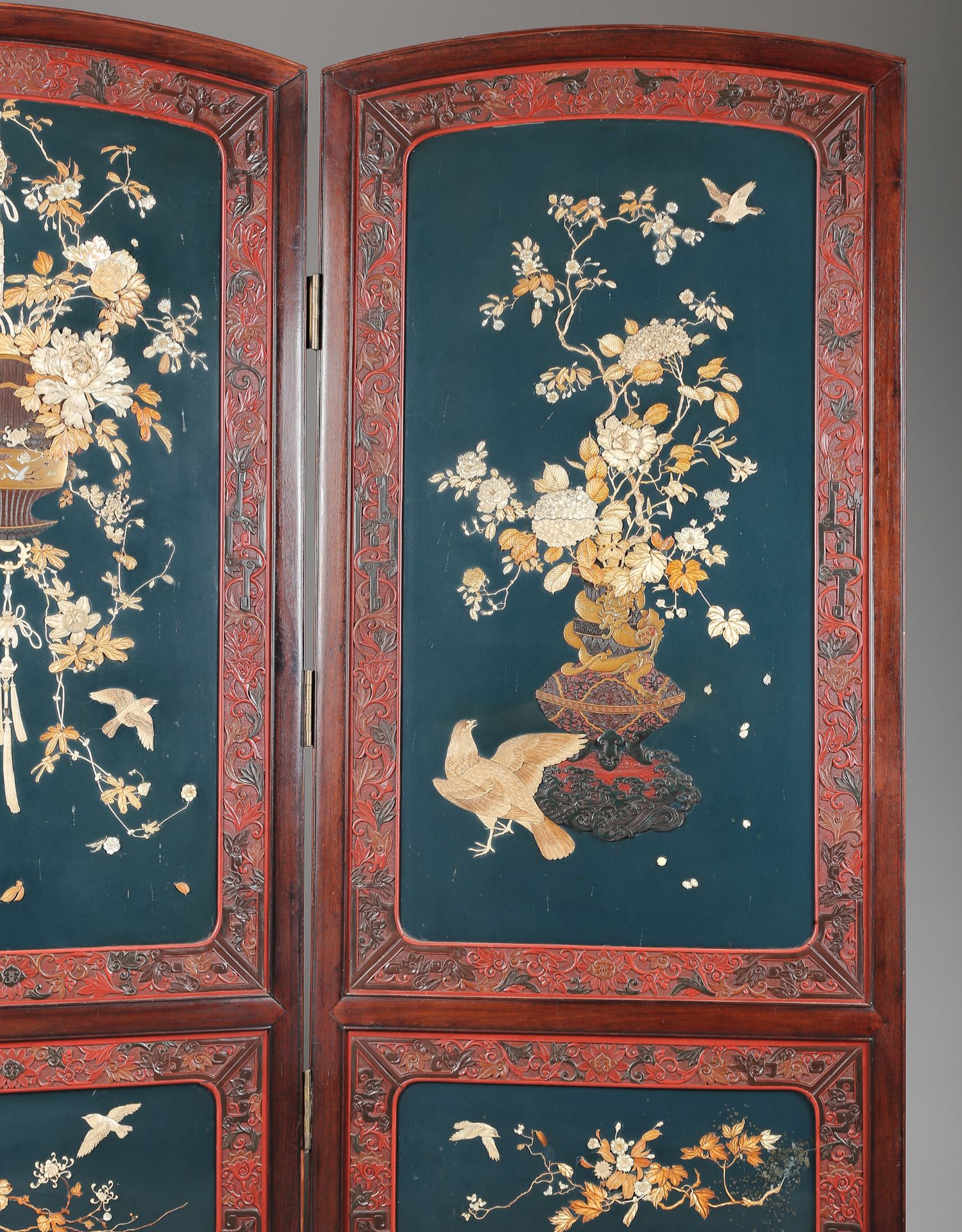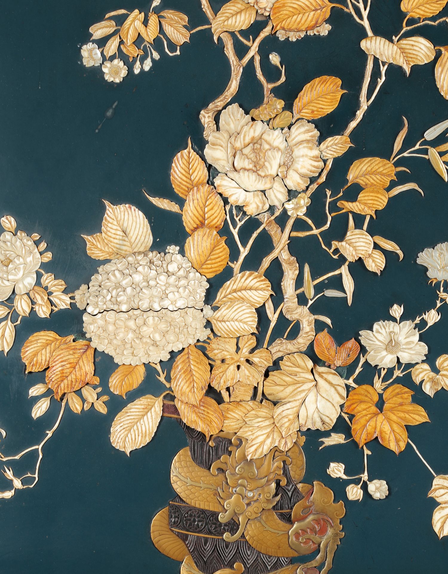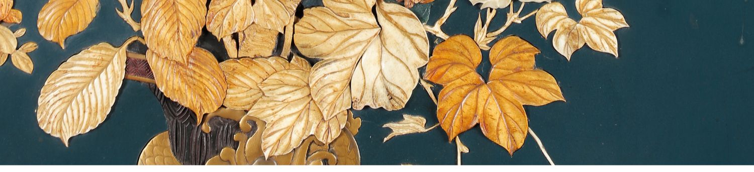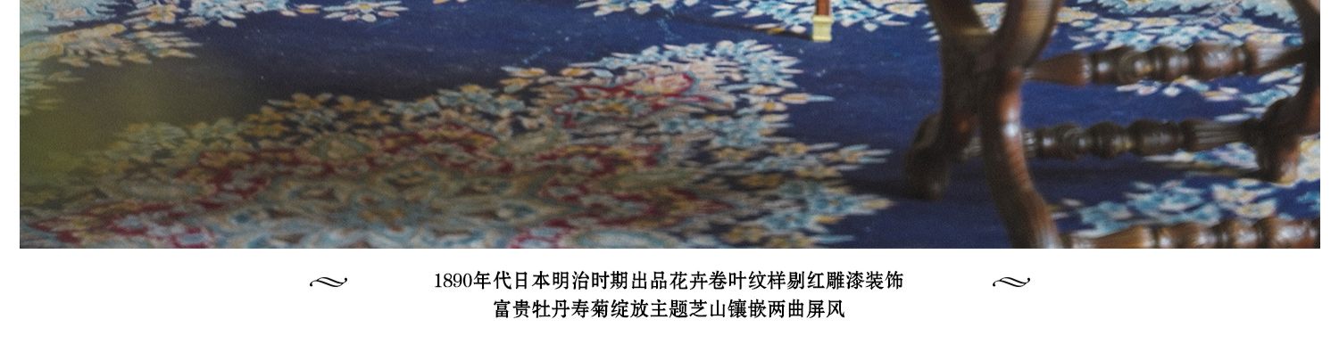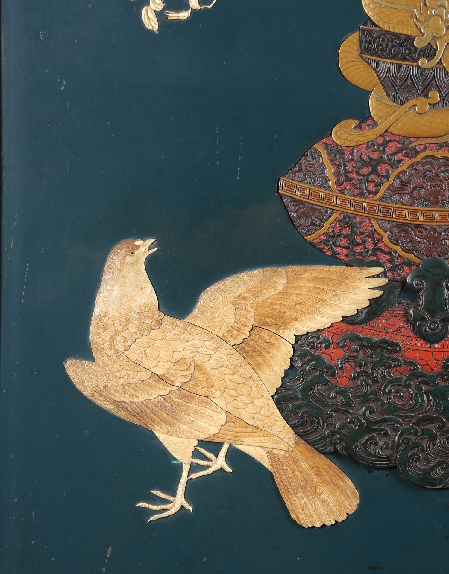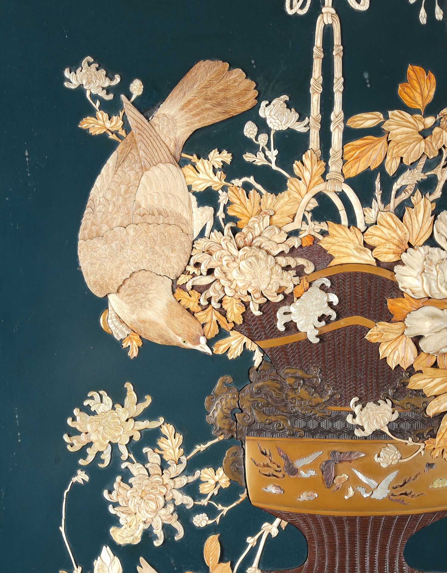 独角鹿西洋古董日本明治时剔红雕漆富贵牡丹寿菊芝山镶嵌两曲屏风