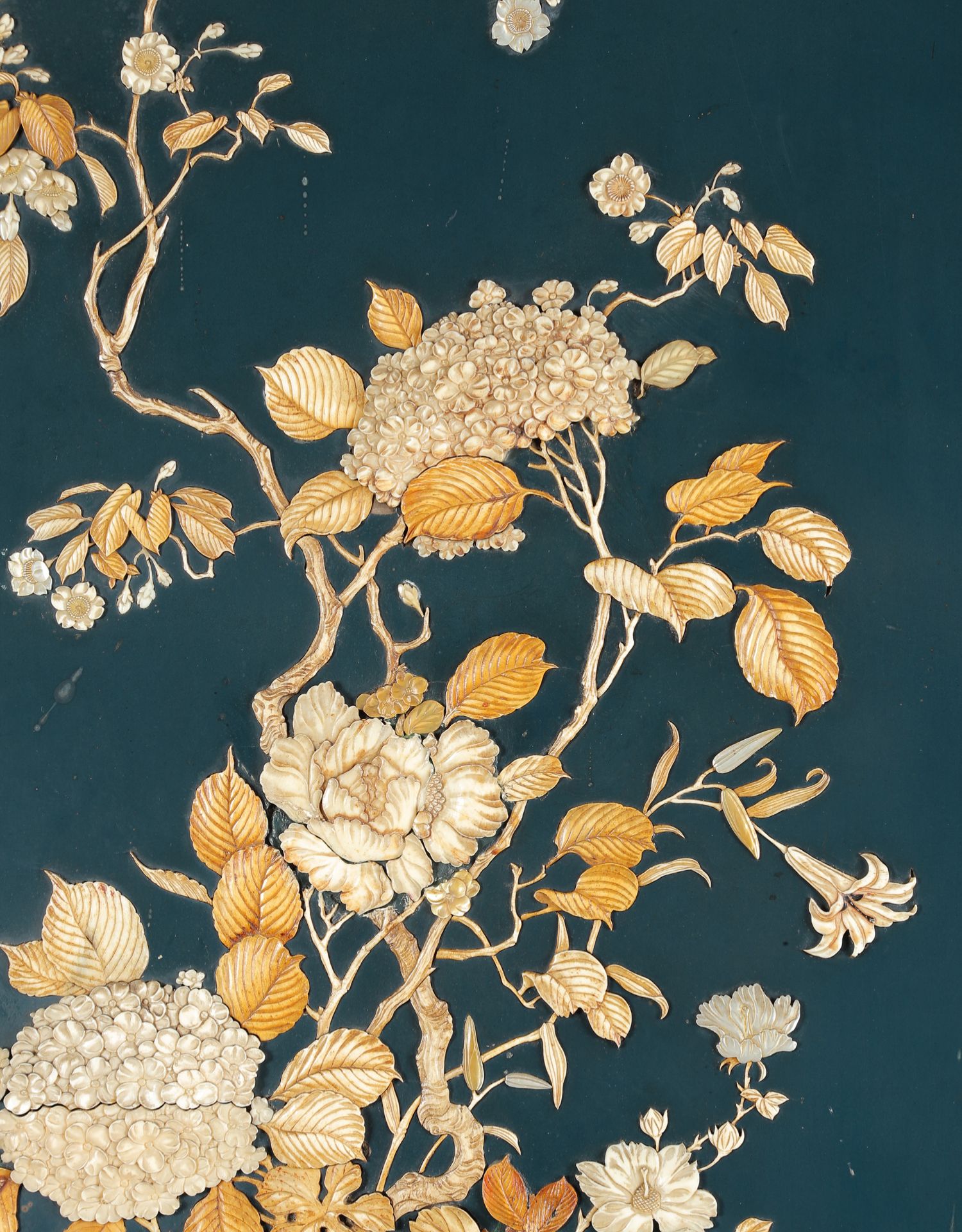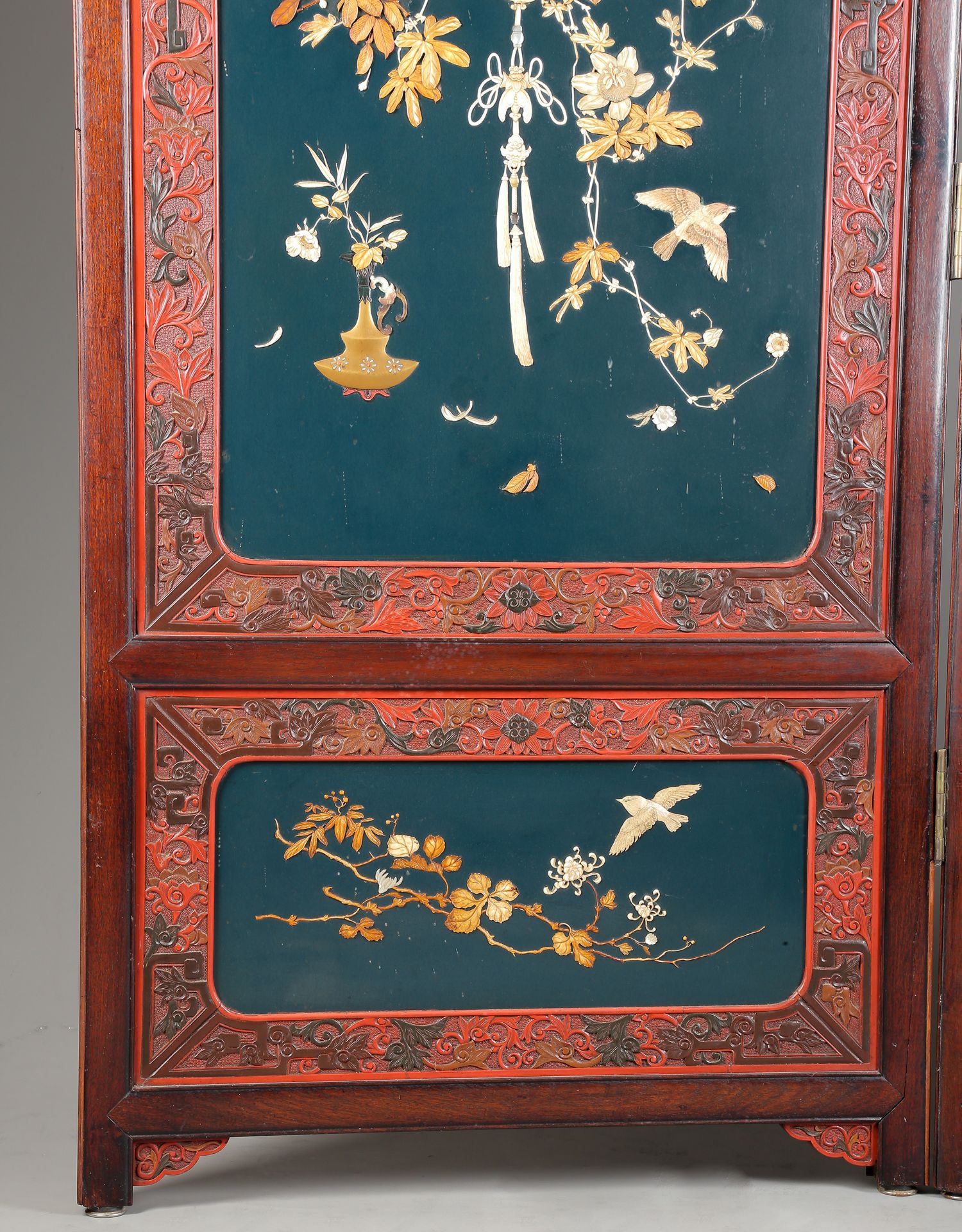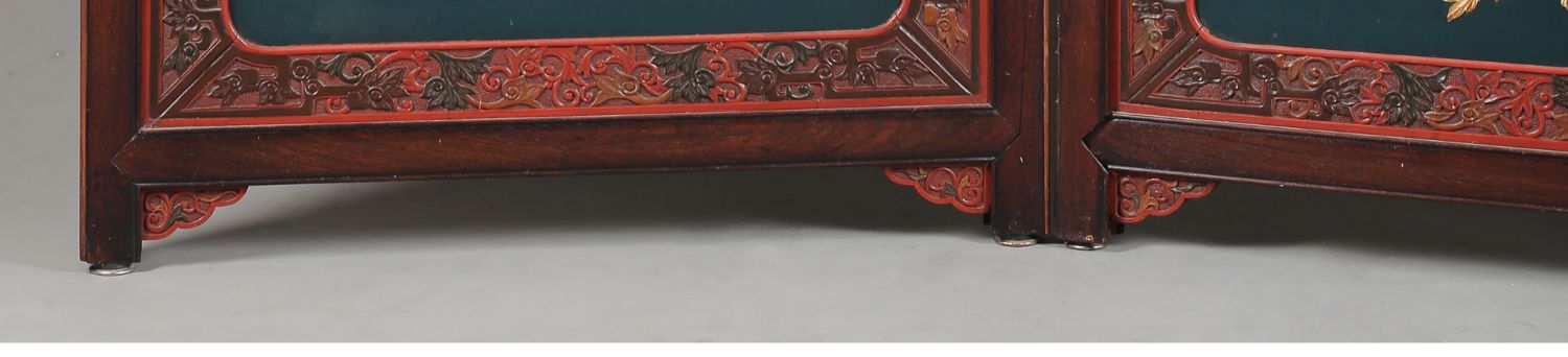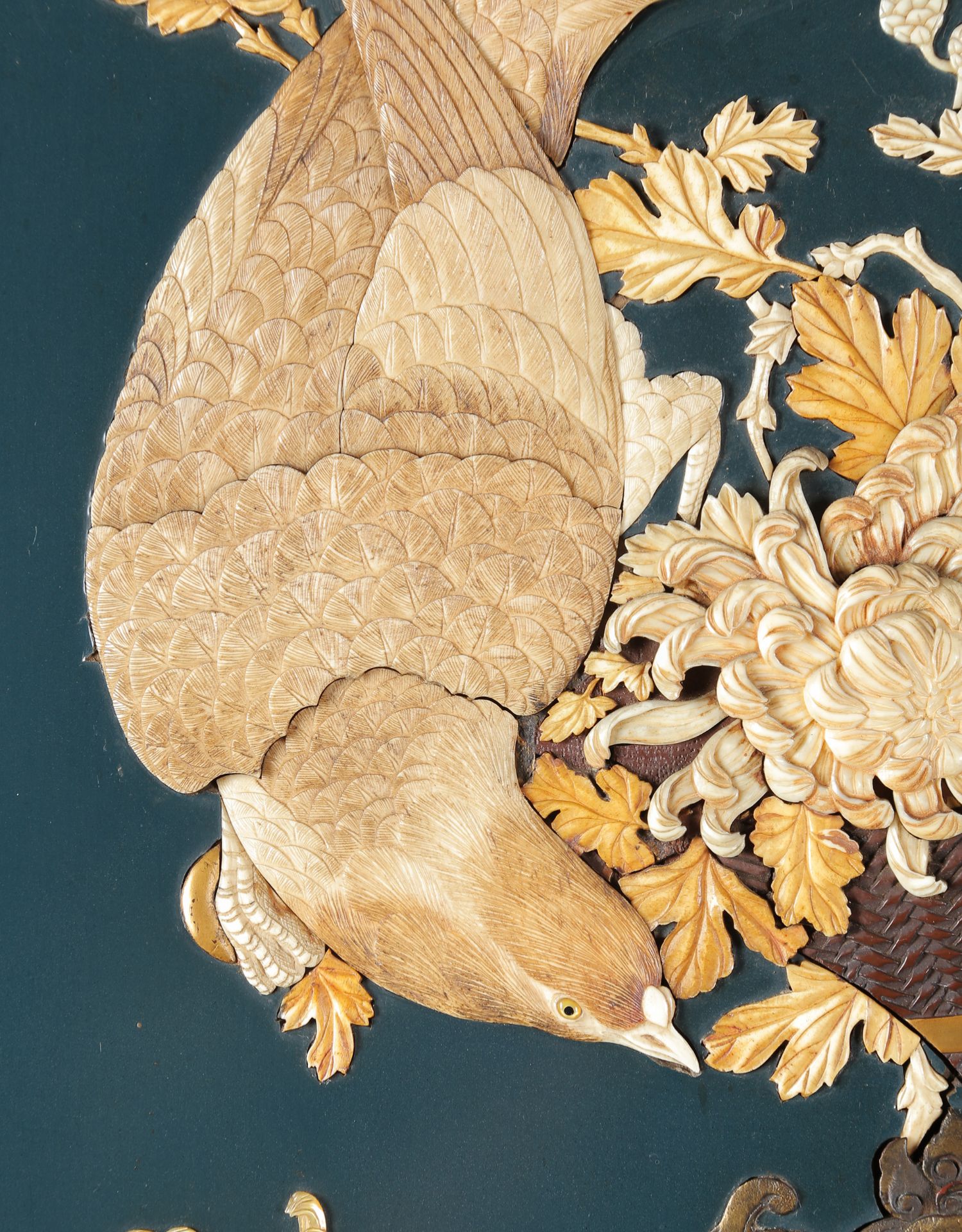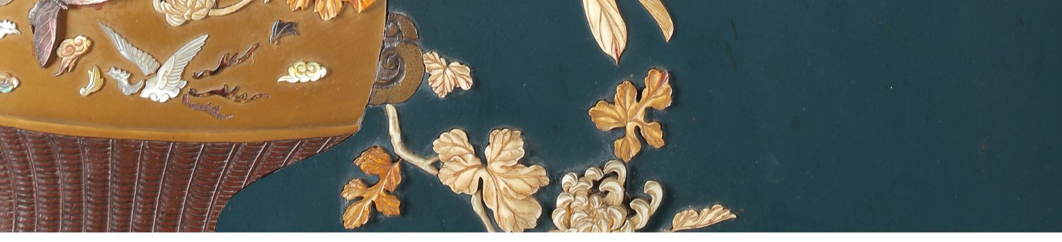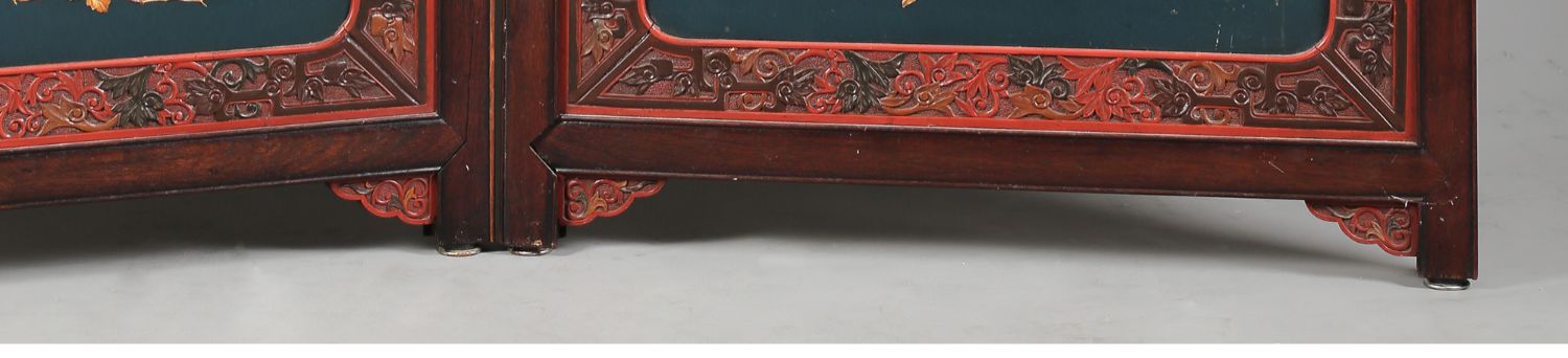 独角鹿西洋古董日本明治时剔红雕漆富贵牡丹寿菊芝山镶嵌两曲屏风