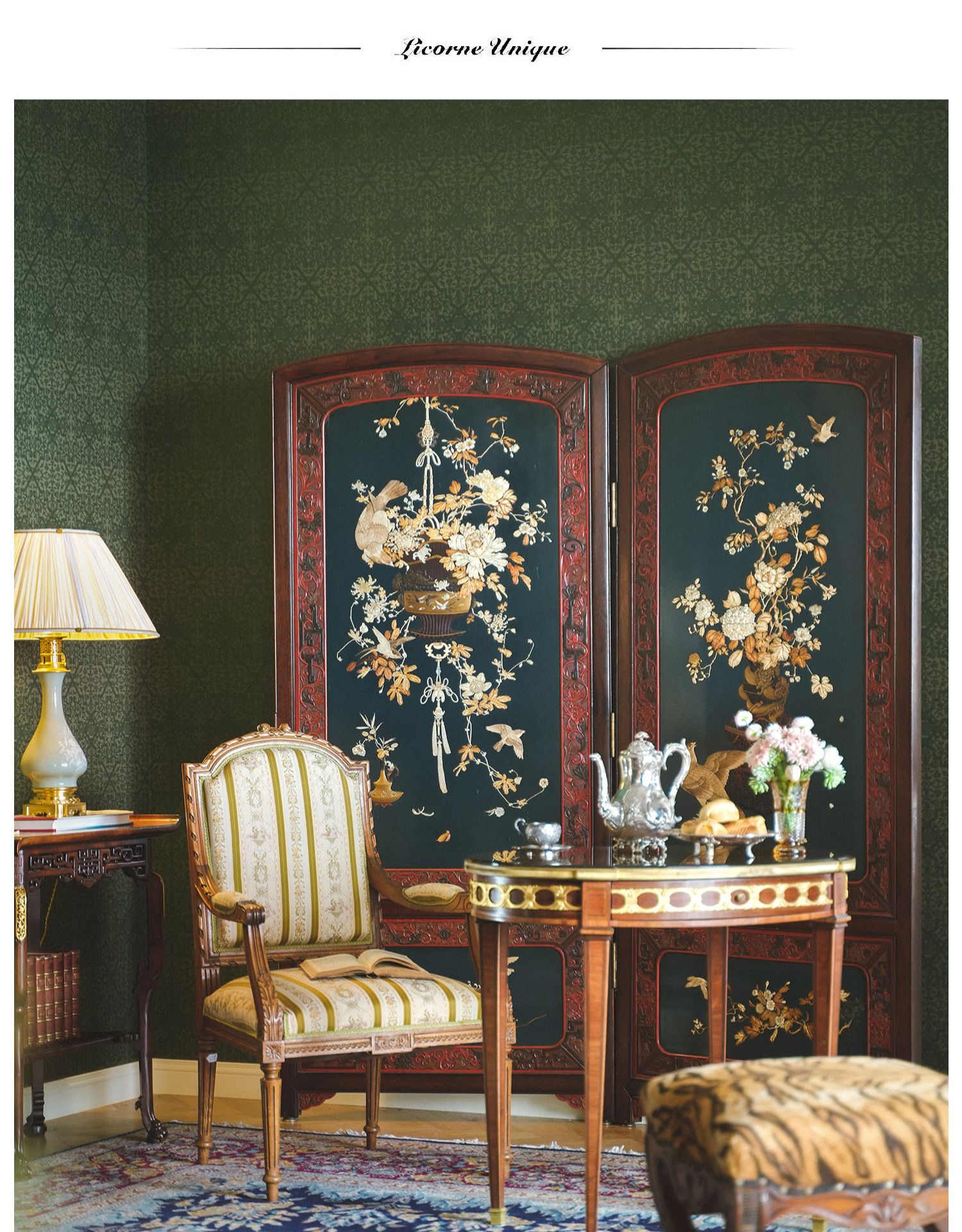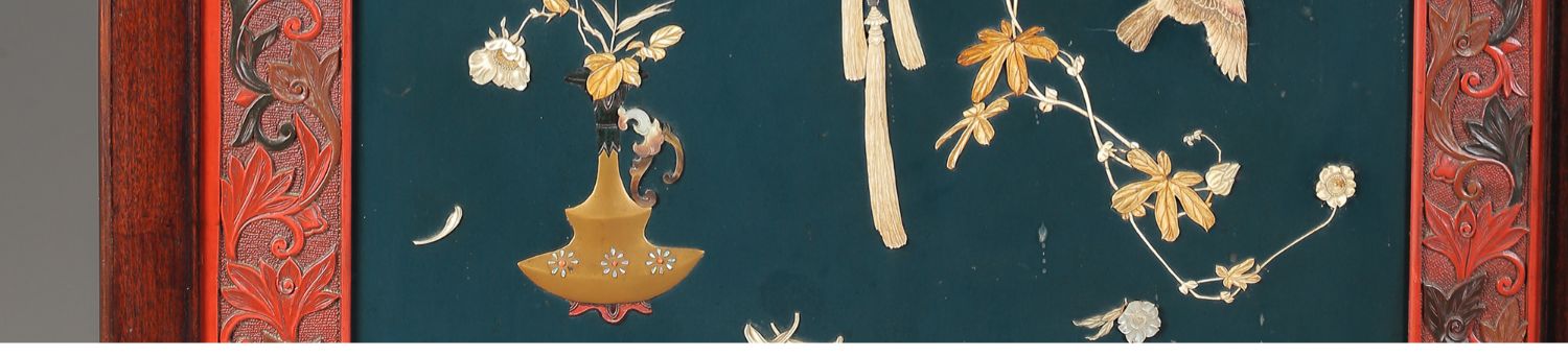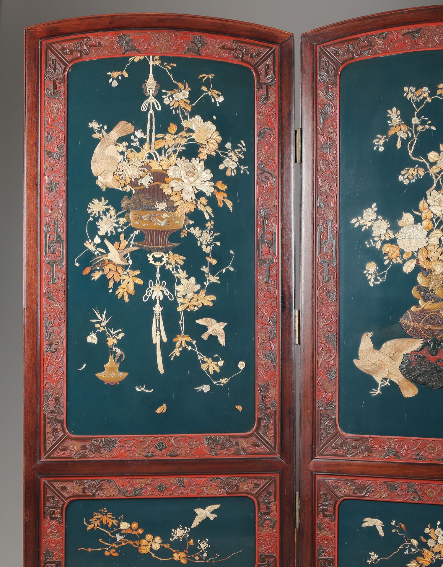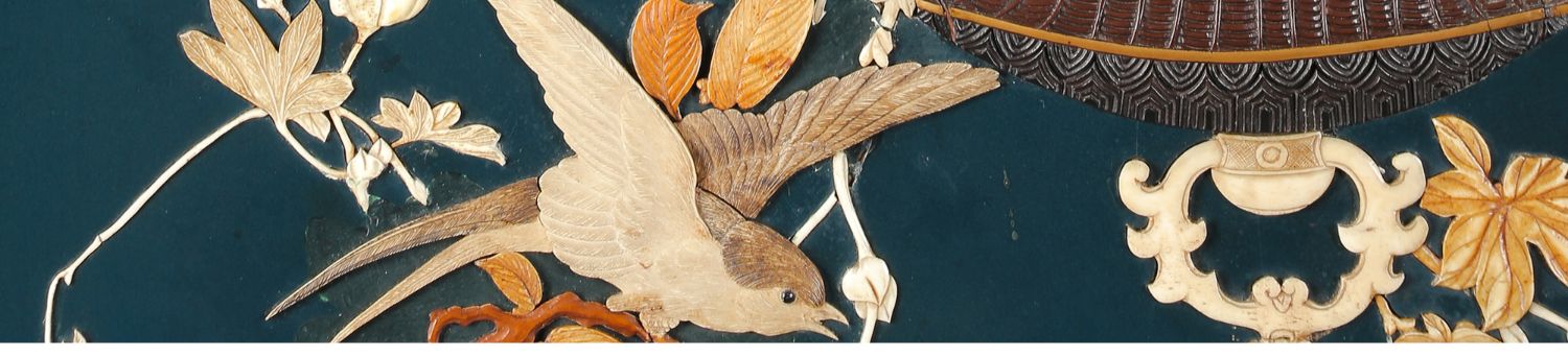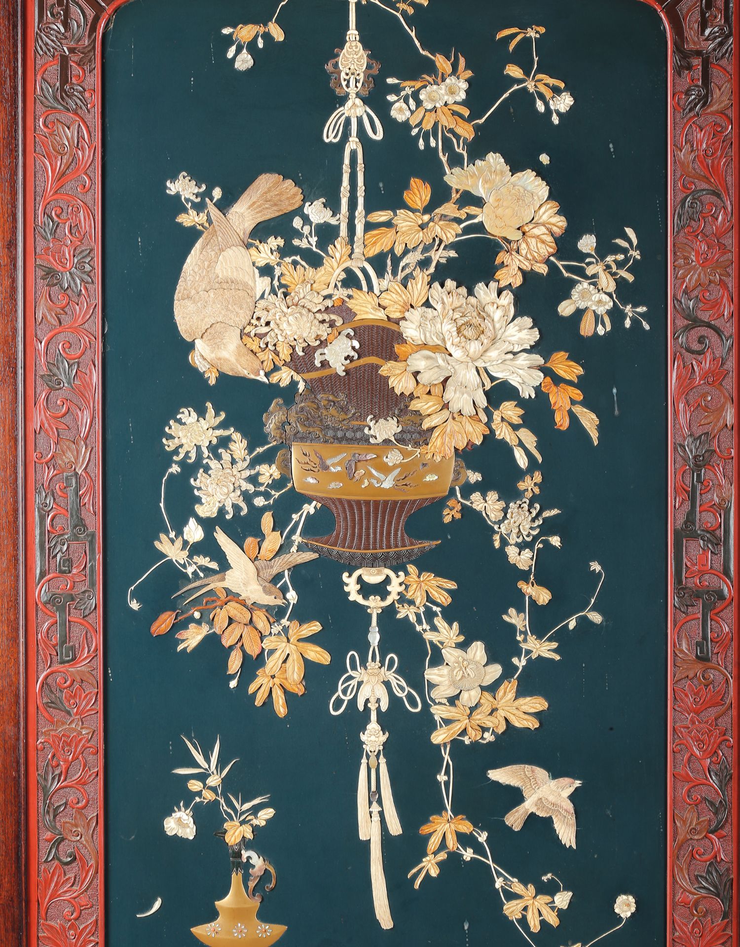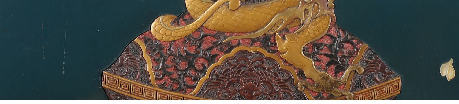 独角鹿西洋古董日本明治时剔红雕漆富贵牡丹寿菊芝山镶嵌两曲屏风