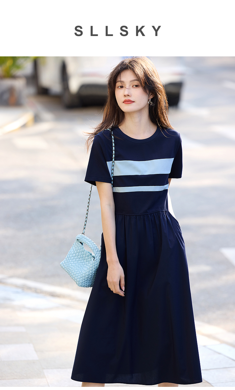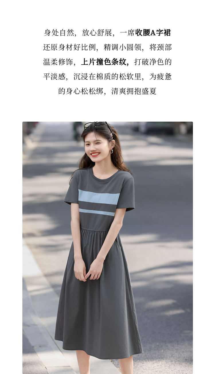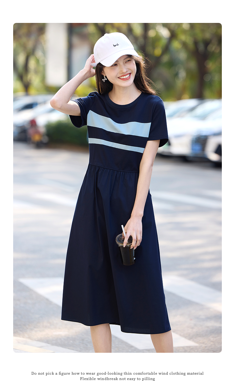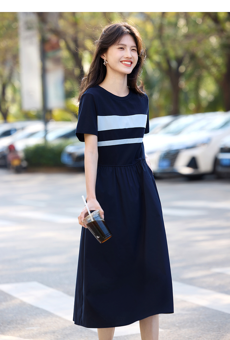 【五折购】熙世界夏日穿搭航海系撞色条纹连衣裙女短袖夏季圆领收腰显瘦长裙