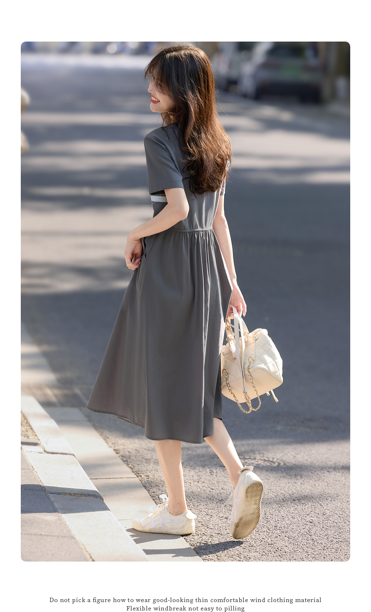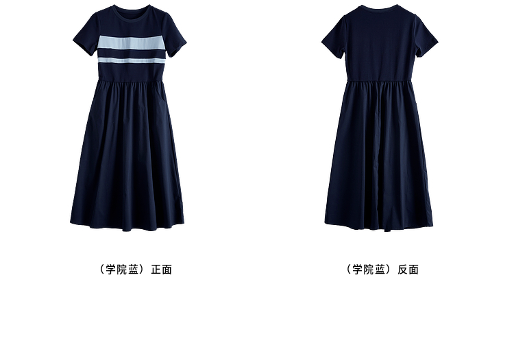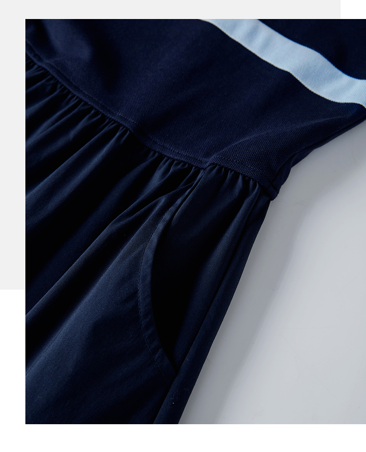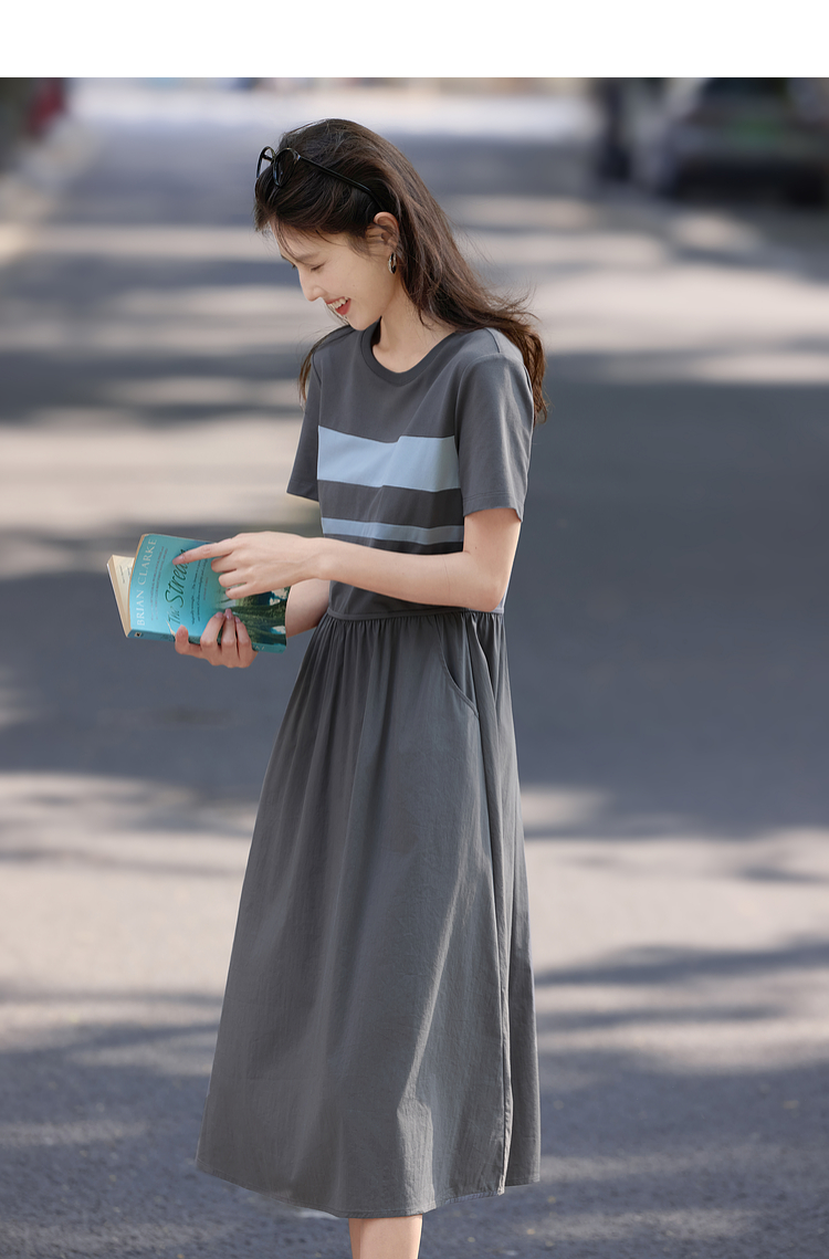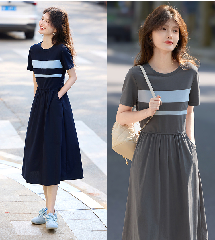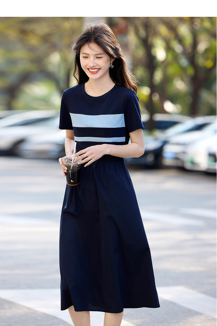 【五折购】熙世界夏日穿搭航海系撞色条纹连衣裙女短袖夏季圆领收腰显瘦长裙