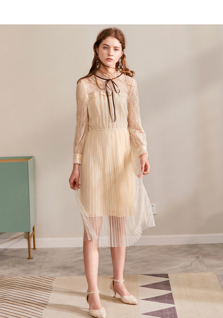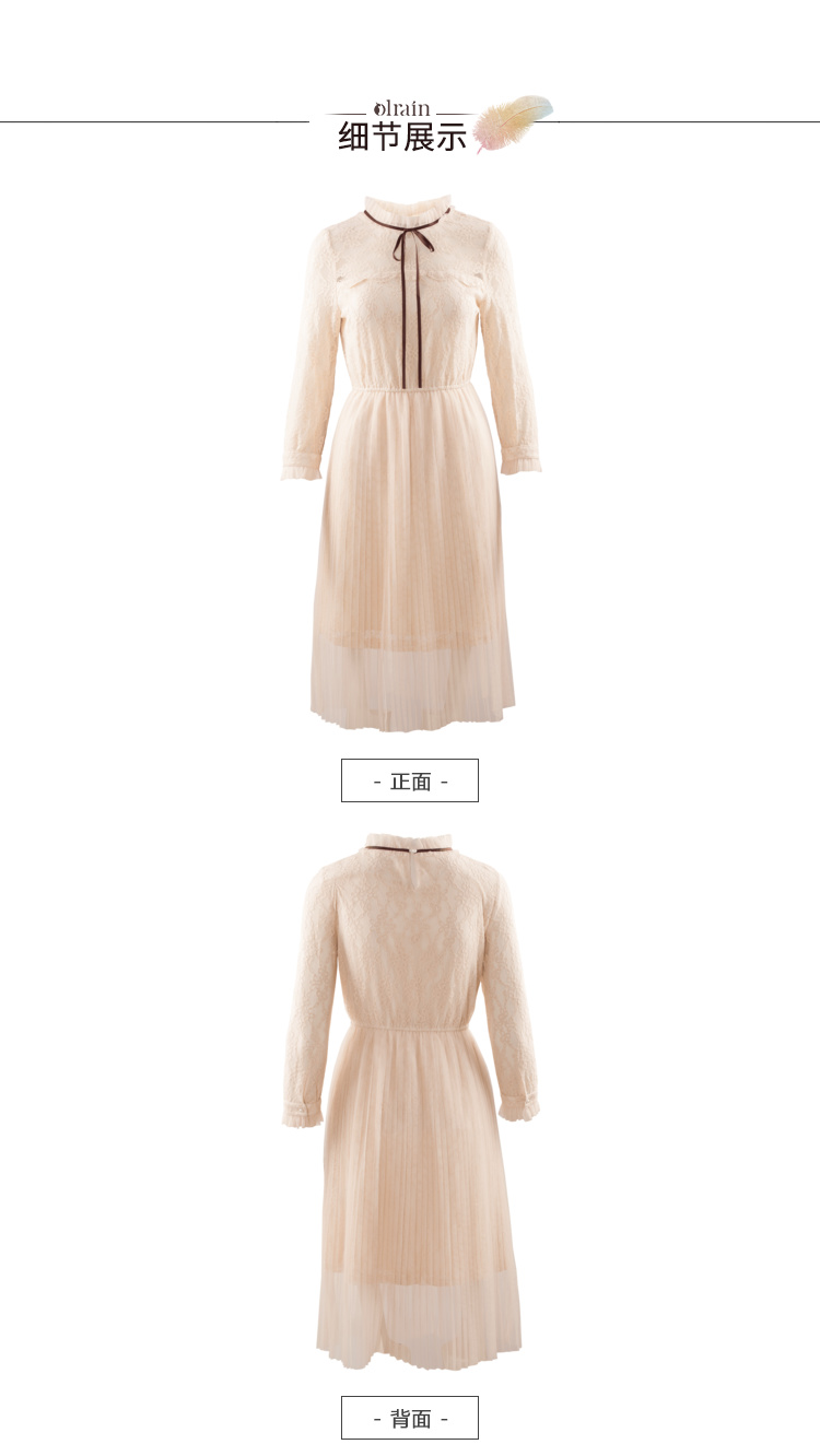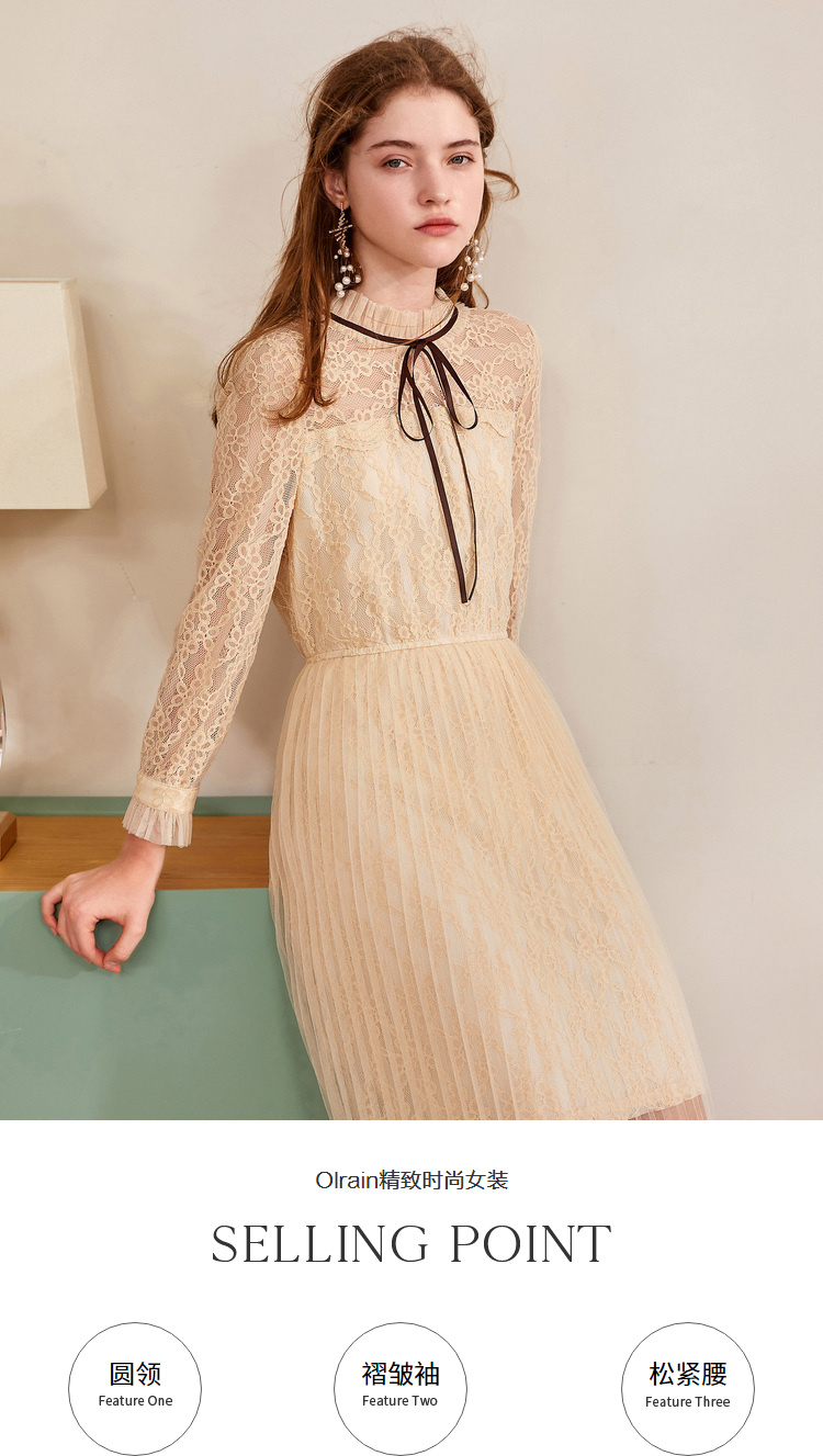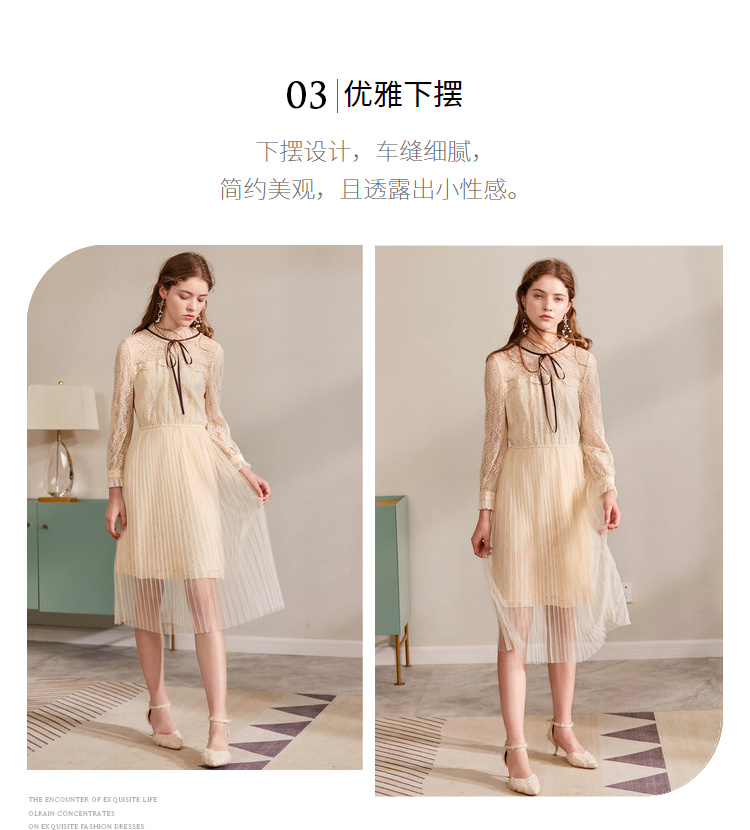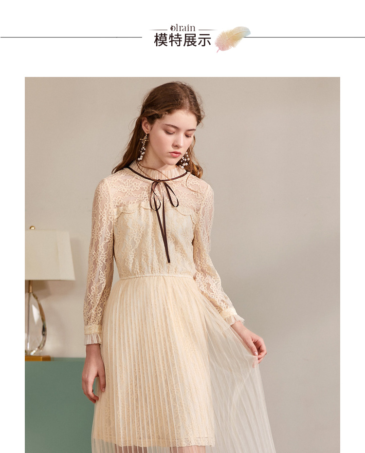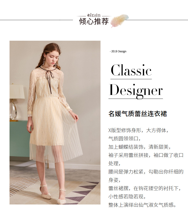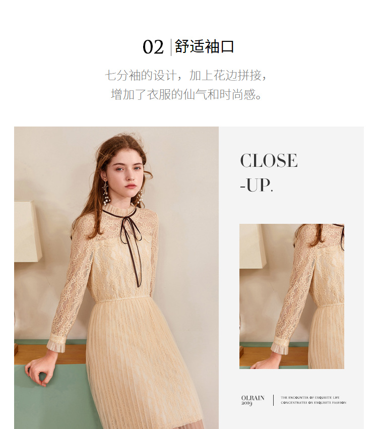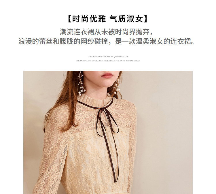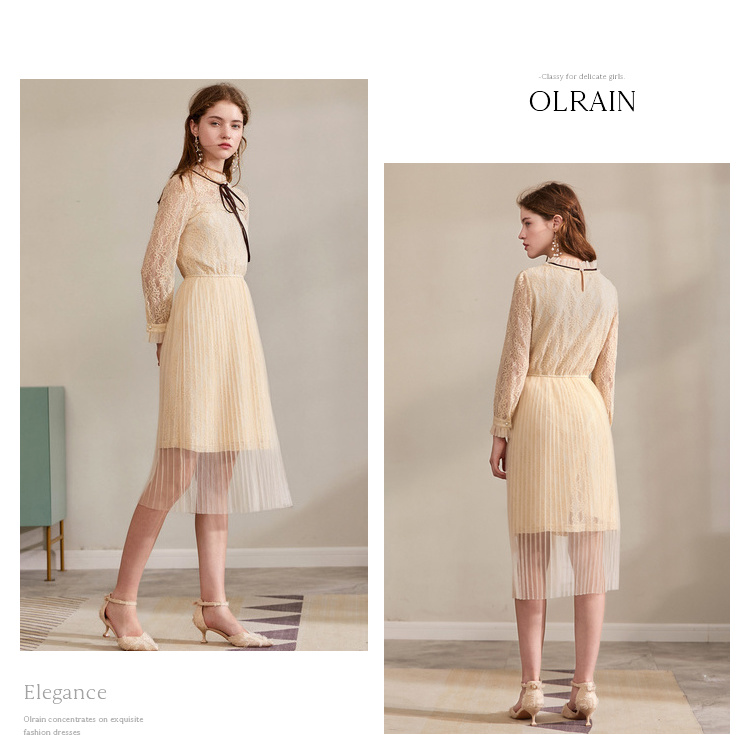 欧芮儿2019秋装新款系带长袖蕾丝连衣裙女收腰中长款A字网纱裙