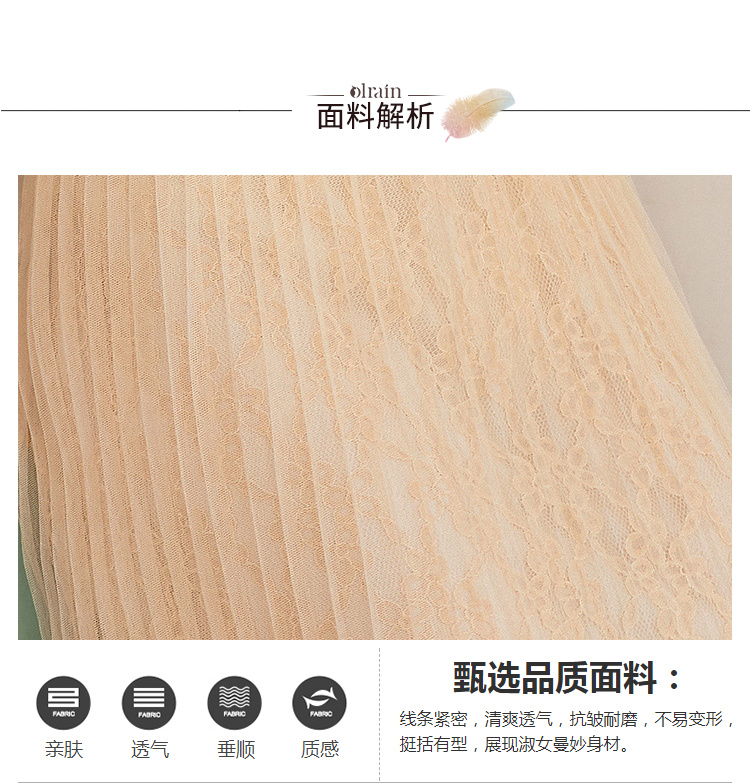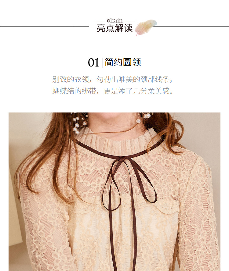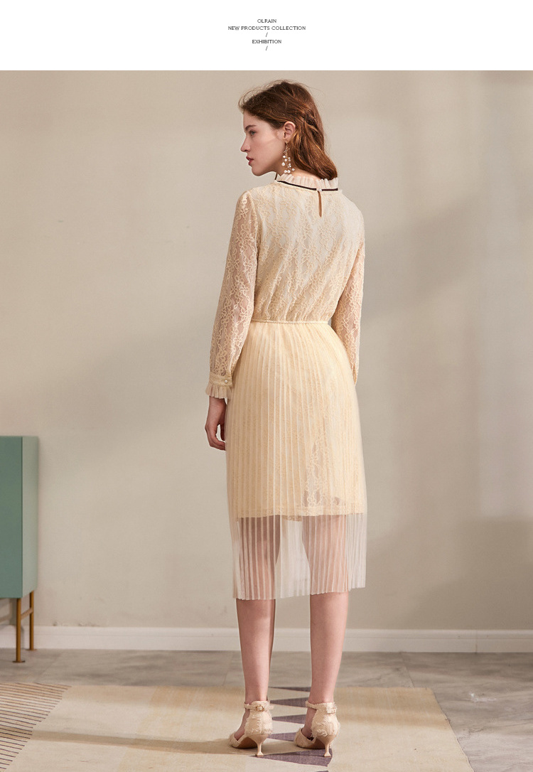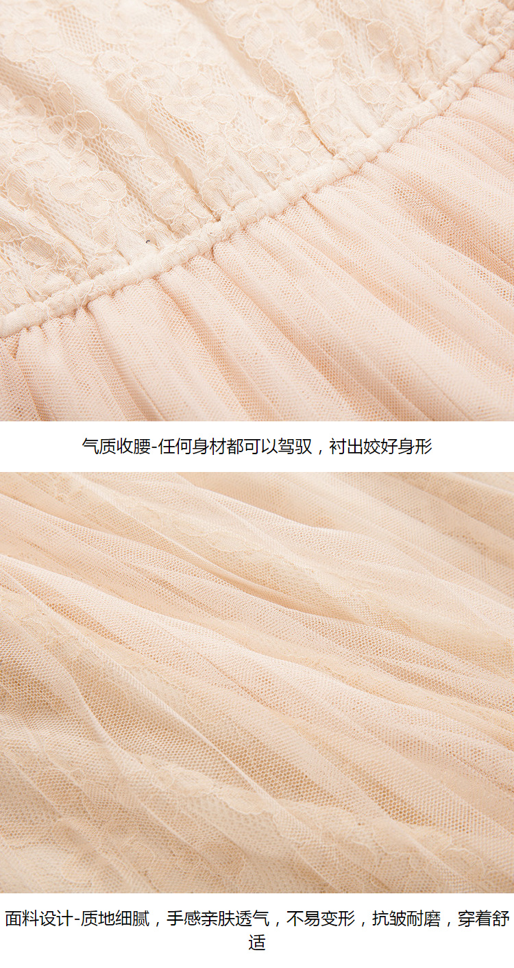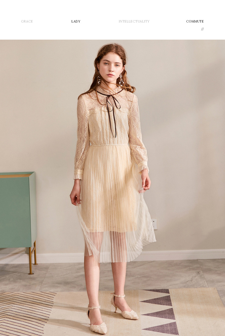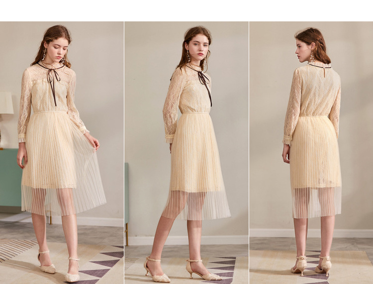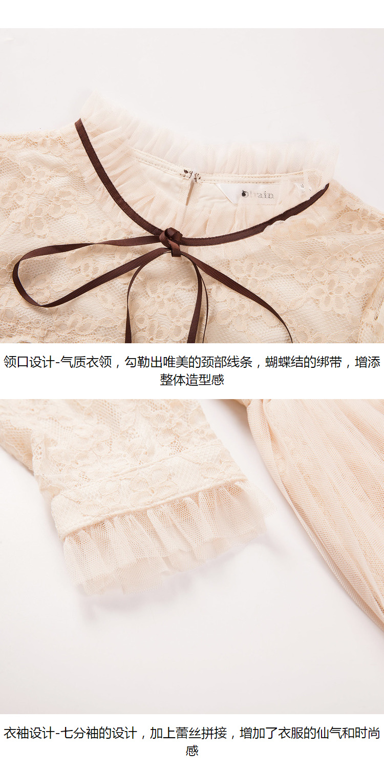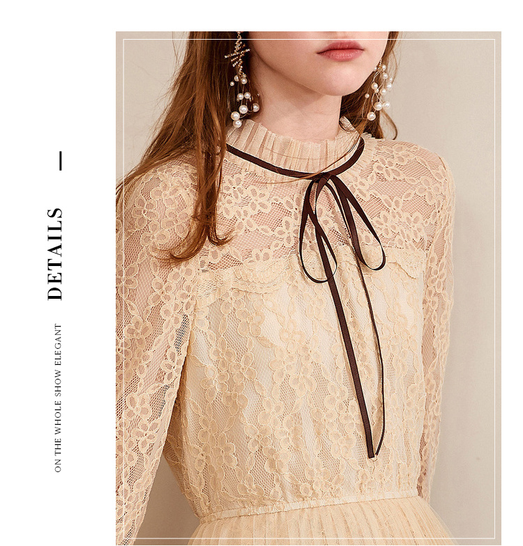欧芮儿2019秋装新款系带长袖蕾丝连衣裙女收腰中长款A字网纱裙