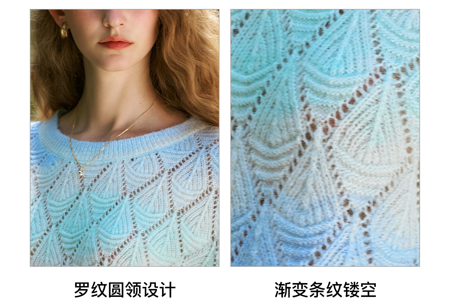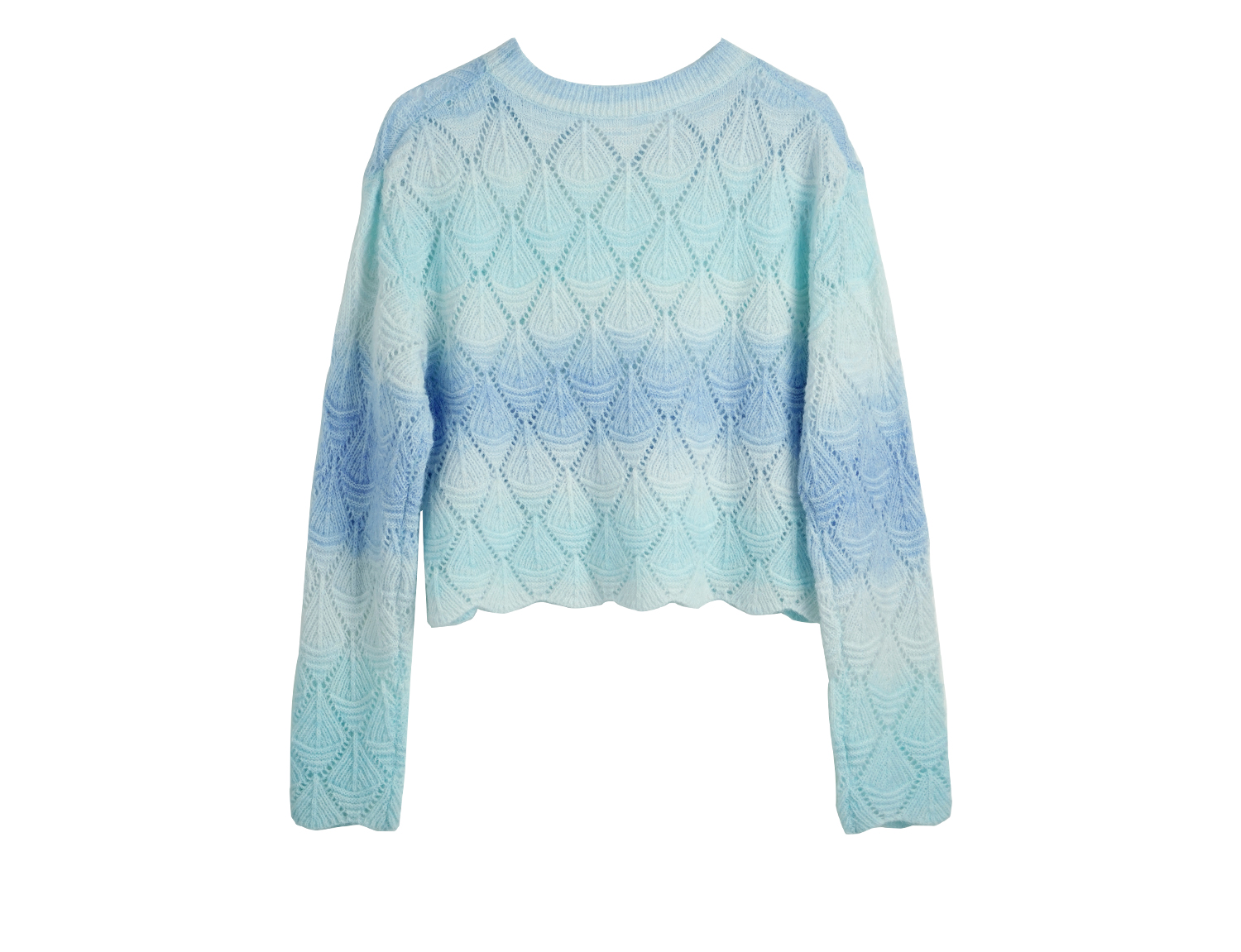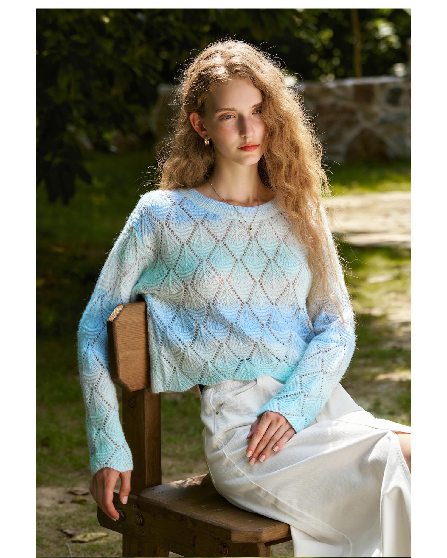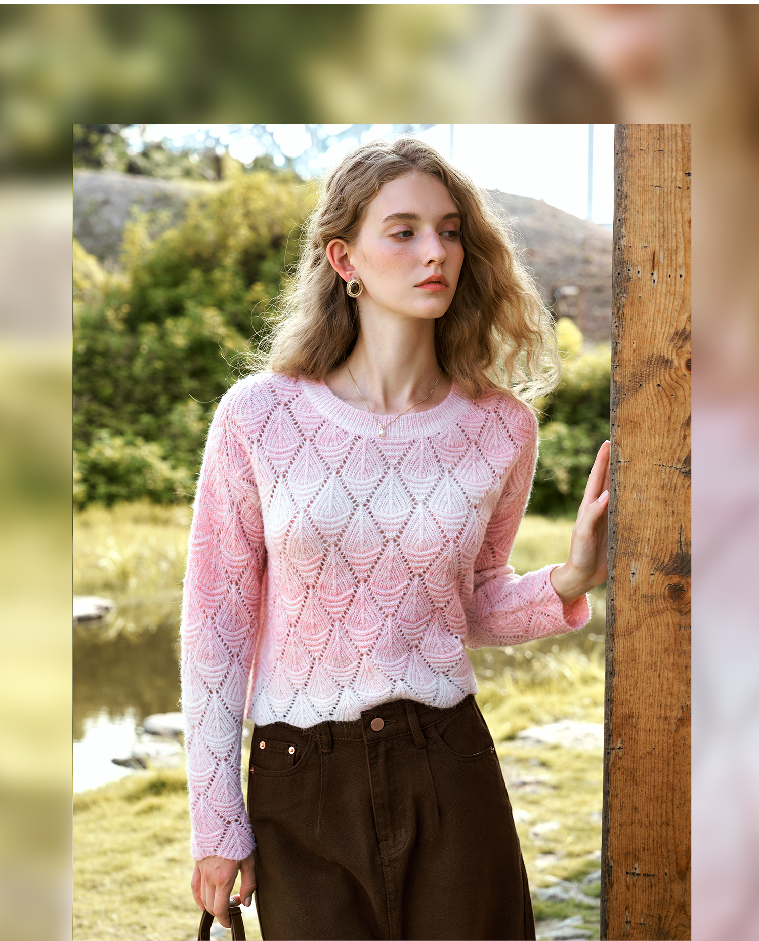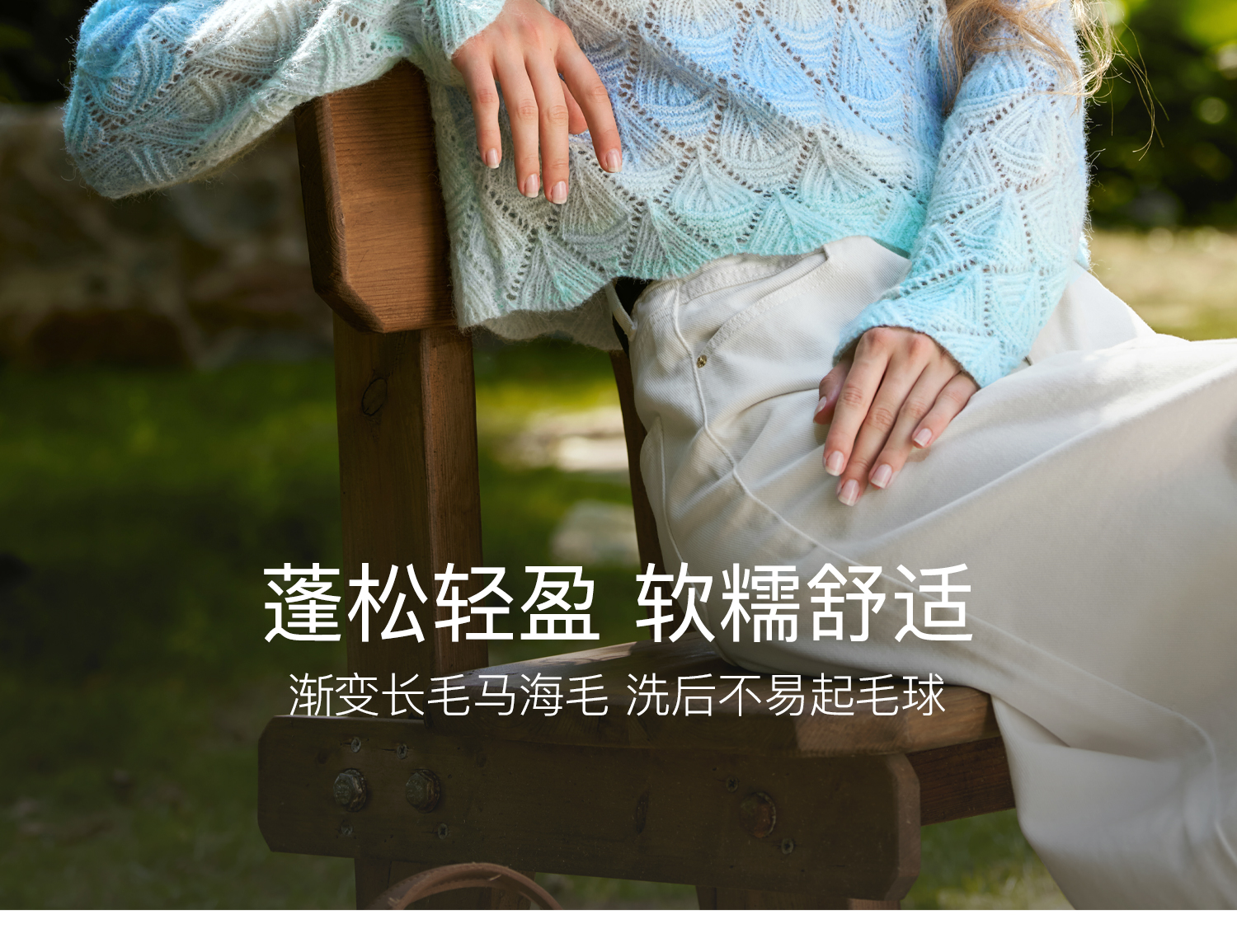 OLrain欧芮儿渐变条纹镂空针织衫女秋2024新款慵懒长袖套头薄上衣