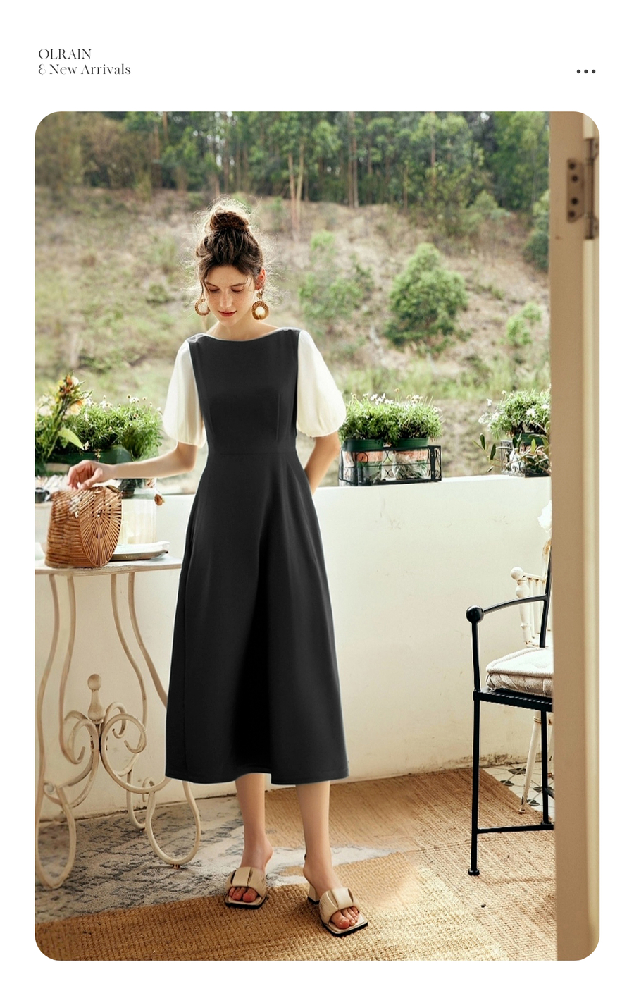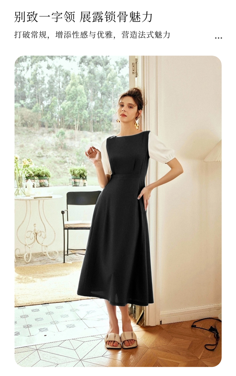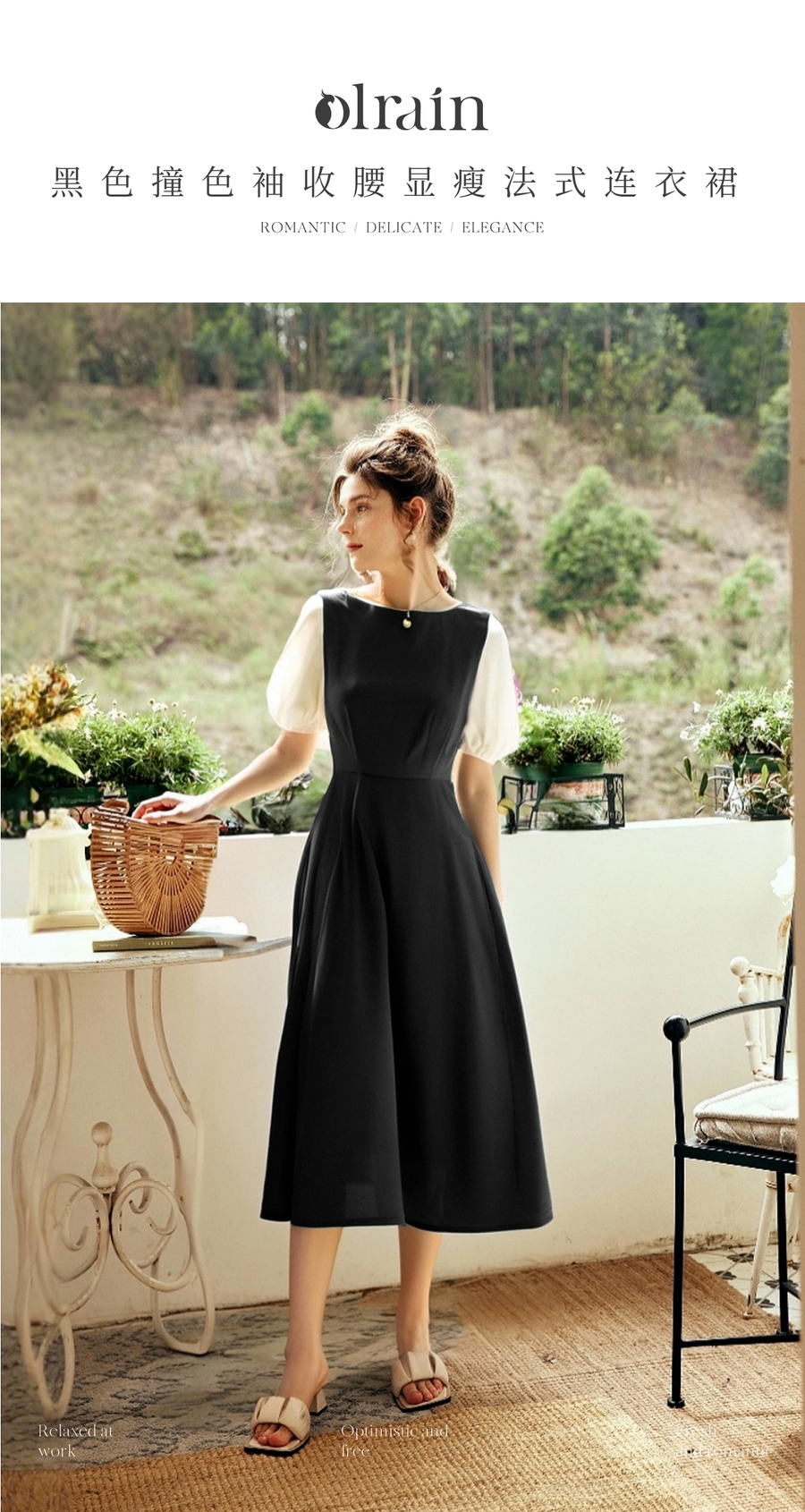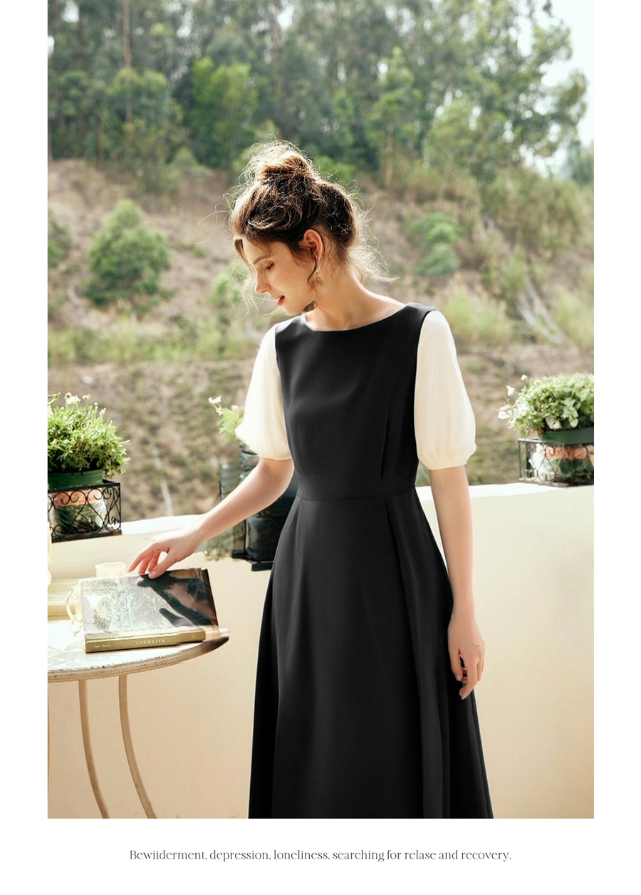 OLrain欧芮儿2025夏季新款黑色撞色袖收腰显瘦法式连衣裙一字领女